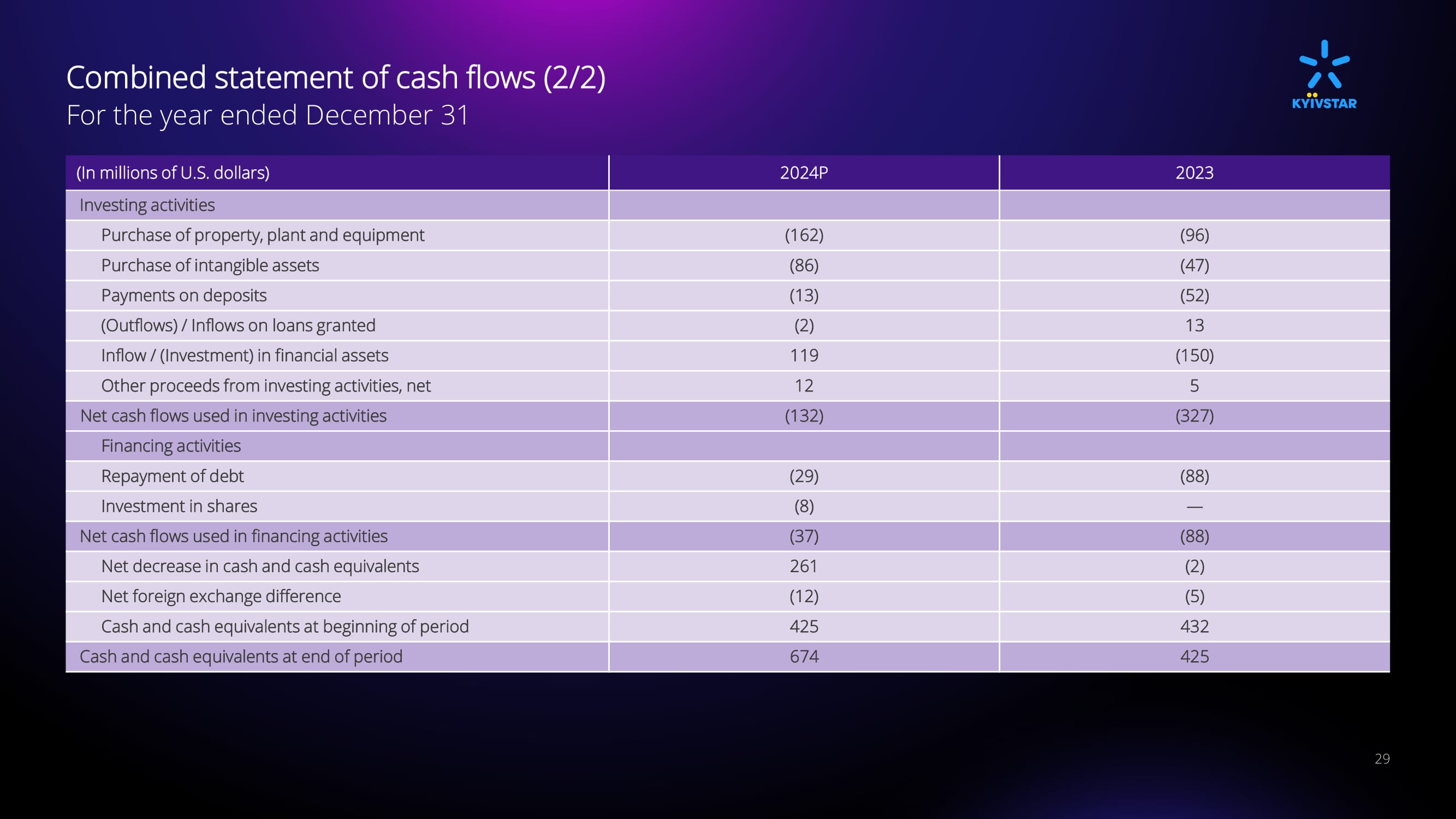 dollars) Net investment and liabilities Net investment 887 1,222 Net investment attributable to equity owners of the parent 887 1,222 Total net investment Non - current liabilities 815 225 Debt and derivatives 3 4 Provisions 5 6 Deferred tax liabilities 8 7 Other liabilities 831 242 Total non - current liabilities Current liabilities 120 132 Trade and other payables 83 669 Debt and derivatives 5 6 Provisions 16 23 Current income tax payables 41 57 Other liabilities 265 887 Total current liabilities 1,983 2,351 Total net investment and liabilities 28 Combined statement of cash flows (1/2) For the year ended December 31 2023 2024P (In millions of U.S. dollars) Operating activities 346 347 Profit before tax Non - cash adjustments to reconcile profit before tax to net cash flows 177 168 Depreciation, amortization and impairment loss (2) (1) (Loss) / gain on disposal of non - current assets 82 82 Finance costs (35) (40) Finance income 8 (1) Other non - operating gain / (loss), net (38) (40) Net foreign exchange gain 28 (10) Changes in trade and other receivables and prepayments (2) — Changes in inventories (33) 32 Changes in trade and other payables 3 4 Changes in provisions, pensions and other (75) (78) Interest paid 16 19 Interest received (62) (52) Income tax paid 413 430 Net cash flows from operating activities 29 Combined statement of cash flows (2/2) For the year ended December 31 2023 2024P (In millions of U.S. dollars) Investing activities (96) (162) Purchase of property, plant and equipment (47) (86) Purchase of intangible assets (52) (13) Payments on deposits 13 (2) (Outflows) / Inflows on loans granted (150) 119 Inflow / (Investment) in financial assets 5 12 Other proceeds from investing activities, net (327) (132) Net cash flows used in investing activities Financing activities (88) (29) Repayment of debt — (8) Investment in shares (88) (37) Net cash flows used in financing activities (2) 261 Net decrease in cash and cash equivalents (5) (12) Net foreign exchange difference 432 425 Cash and cash equivalents at beginning of period 425 674 Cash and cash equivalents at end of period