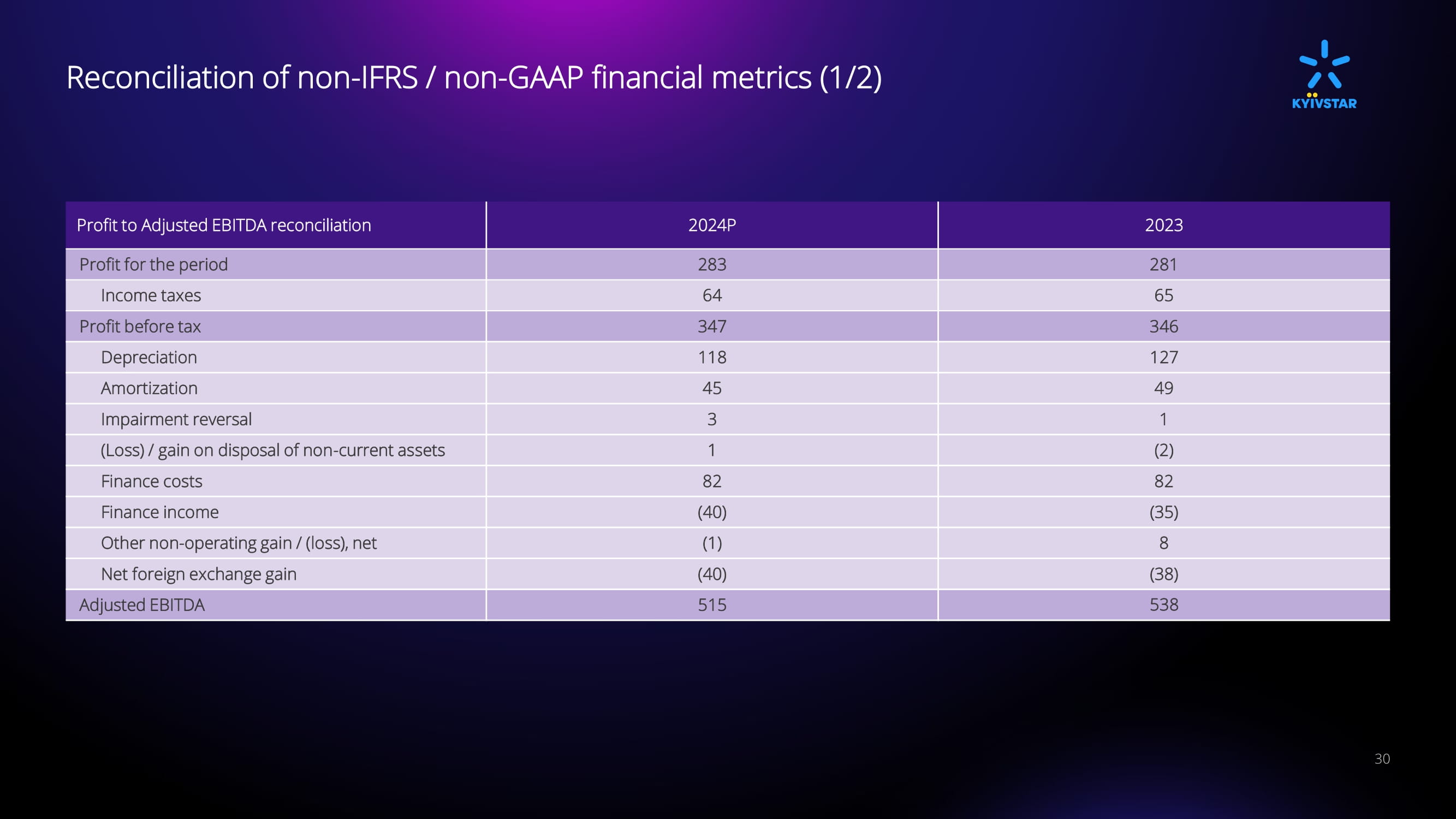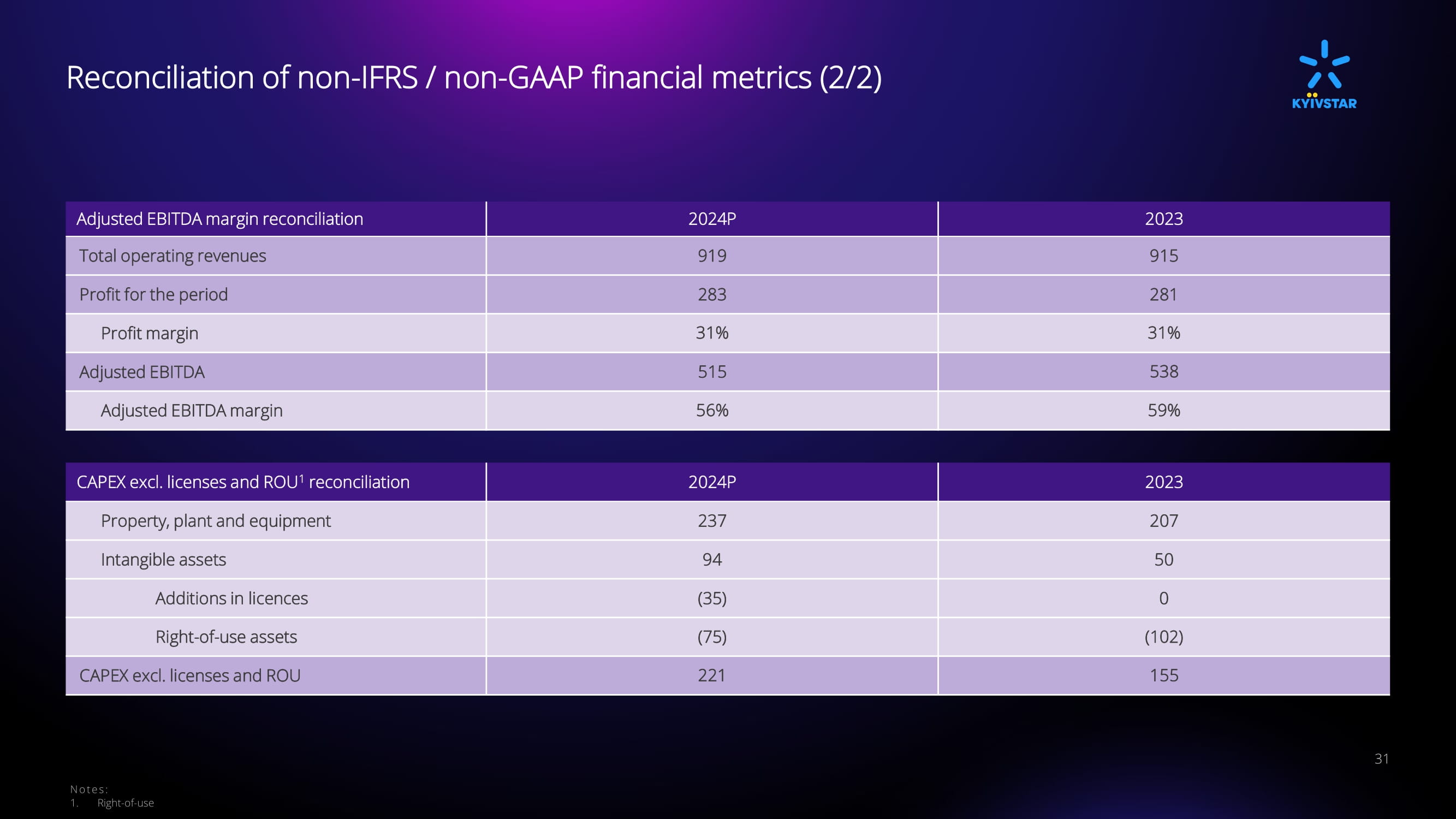 Reconciliation of non - IFRS / non - GAAP financial metrics (1/2) 30 2023 2024P Profit to Adjusted EBITDA reconciliation 281 283 Profit for the period 65 64 Income taxes 346 347 Profit before tax 127 118 Depreciation 49 45 Amortization 1 3 Impairment reversal (2) 1 (Loss) / gain on disposal of non - current assets 82 82 Finance costs (35) (40) Finance income 8 (1) Other non - operating gain / (loss), net (38) (40) Net foreign exchange gain 538 515 Adjusted EBITDA Reconciliation of non - IFRS / non - GAAP financial metrics (2/2) 31 N o te s : 1.