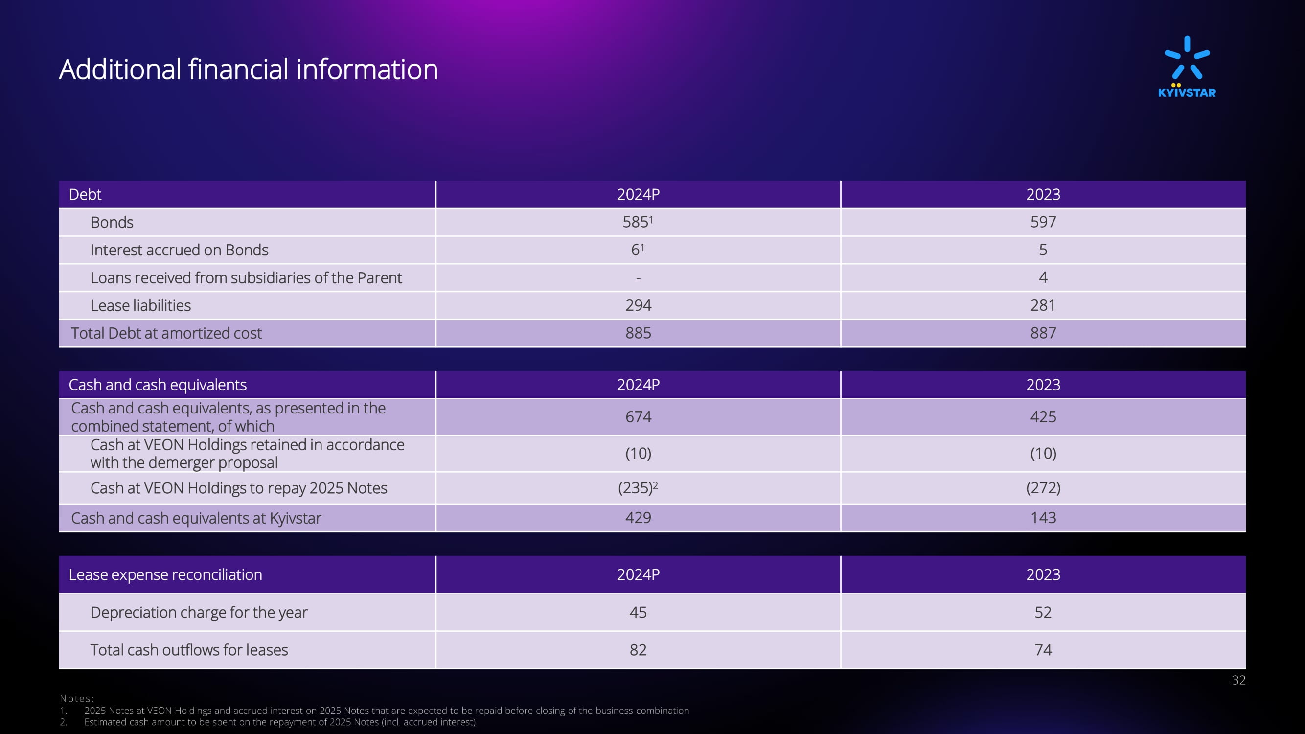 2025 Notes at VEON Holdings and accrued interest on 2025 Notes that are expected to be repaid before closing of the business combination 2. Estimated cash amount to be spent on the repayment of 2025 Notes (incl. accrued interest) 2023 2024P Debt 597 585 1 Bonds 5 6 1 Interest accrued on Bonds 4 - Loans received from subsidiaries of the Parent 281 294 Lease liabilities 887 885 Total Debt at amortized cost 2023 2024P Cash and cash equivalents 425 674 Cash and cash equivalents, as presented in the combined statement, of which (10) (10) Cash at VEON Holdings retained in accordance with the demerger proposal (272) (235) 2 Cash at VEON Holdings to repay 2025 Notes 143 429 Cash and cash equivalents at Kyivstar 2023 2024P Lease expense reconciliation 52 45 Depreciation charge for the year 74 82 Total cash outflows for leases Risks related to the business and industry of Kyivstar (1/3) 33 Risks Related to the War in Ukraine Our network infrastructure, equipment, systems and other assets are subject to disruption, damage and failure as a result of the war.