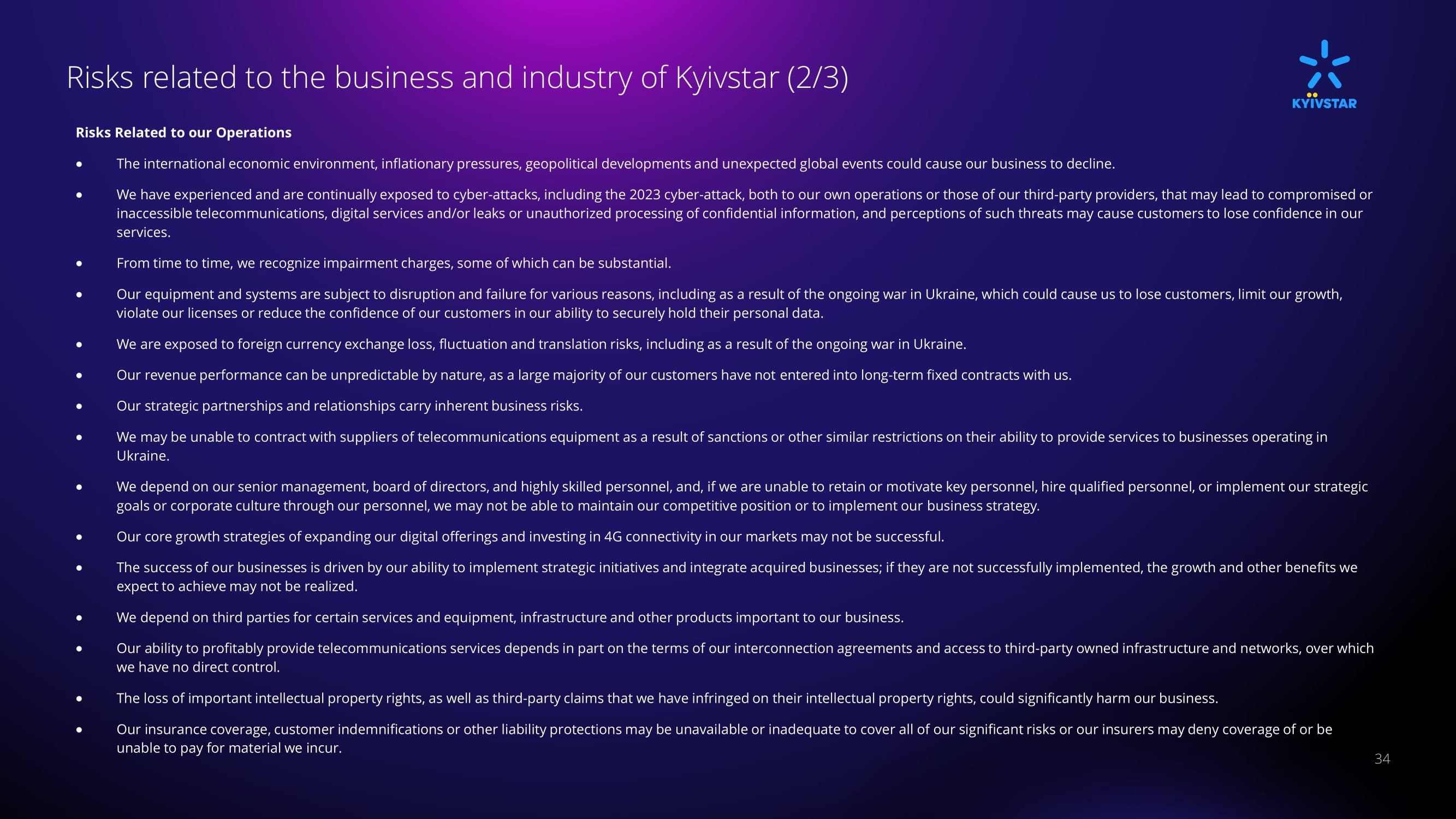 Risks related to the business and industry of Kyivstar (2/3) 34 Risks Related to our Operations The international economic environment, inflationary pressures, geopolitical developments and unexpected global events could cause our business to decline. We have experienced and are continually exposed to cyber - attacks, including the 2023 cyber - attack, both to our own operations or those of our third - party providers, that may lead to compromised or inaccessible telecommunications, digital services and/or leaks or unauthorized processing of confidential information, and perceptions of such threats may cause customers to lose confidence in our services. From time to time, we recognize impairment charges, some of which can be substantial. Our equipment and systems are subject to disruption and failure for various reasons, including as a result of the ongoing war in Ukraine, which could cause us to lose customers, limit our growth, violate our licenses or reduce the confidence of our customers in our ability to securely hold their personal data. We are exposed to foreign currency exchange loss, fluctuation and translation risks, including as a result of the ongoing war in Ukraine. Our revenue performance can be unpredictable by nature, as a large majority of our customers have not entered into long - term fixed contracts with us. Our strategic partnerships and relationships carry inherent business risks. We may be unable to contract with suppliers of telecommunications equipment as a result of sanctions or other similar restrictions on their ability to provide services to businesses operating in Ukraine. We depend on our senior management, board of directors, and highly skilled personnel, and, if we are unable to retain or motivate key personnel, hire qualified personnel, or implement our strategic goals or corporate culture through our personnel, we may not be able to maintain our competitive position or to implement our business strategy. Our core growth strategies of expanding our digital offerings and investing in 4G connectivity in our markets may not be successful. The success of our businesses is driven by our ability to implement strategic initiatives and integrate acquired businesses; if they are not successfully implemented, the growth and other benefits we expect to achieve may not be realized. We depend on third parties for certain services and equipment, infrastructure and other products important to our business. Our ability to profitably provide telecommunications services depends in part on the terms of our interconnection agreements and access to third - party owned infrastructure and networks, over which we have no direct control. The loss of important intellectual property rights, as well as third - party claims that we have infringed on their intellectual property rights, could significantly harm our business. Our insurance coverage, customer indemnifications or other liability protections may be unavailable or inadequate to cover all of our significant risks or our insurers may deny coverage of or be unable to pay for material we incur.