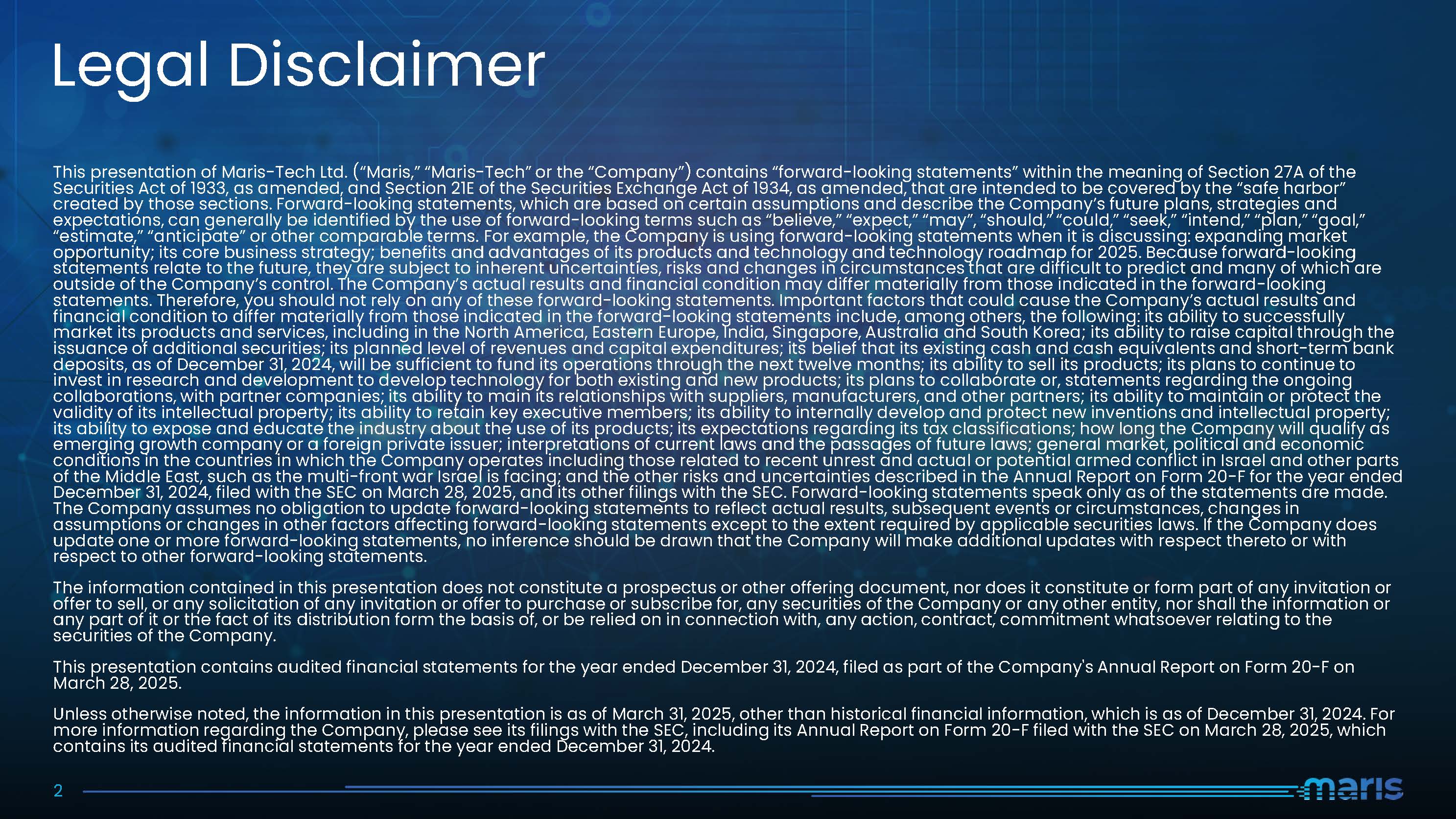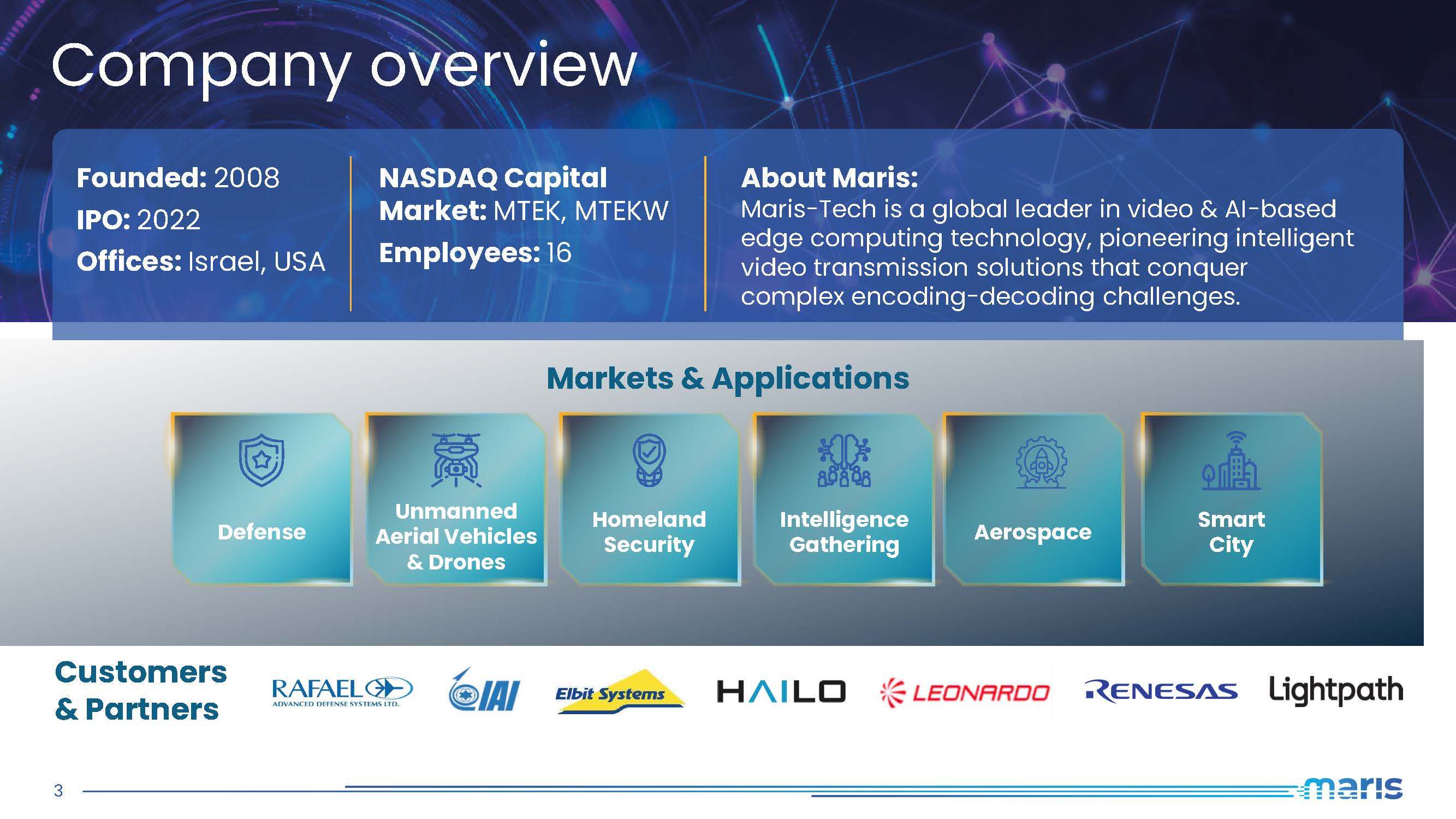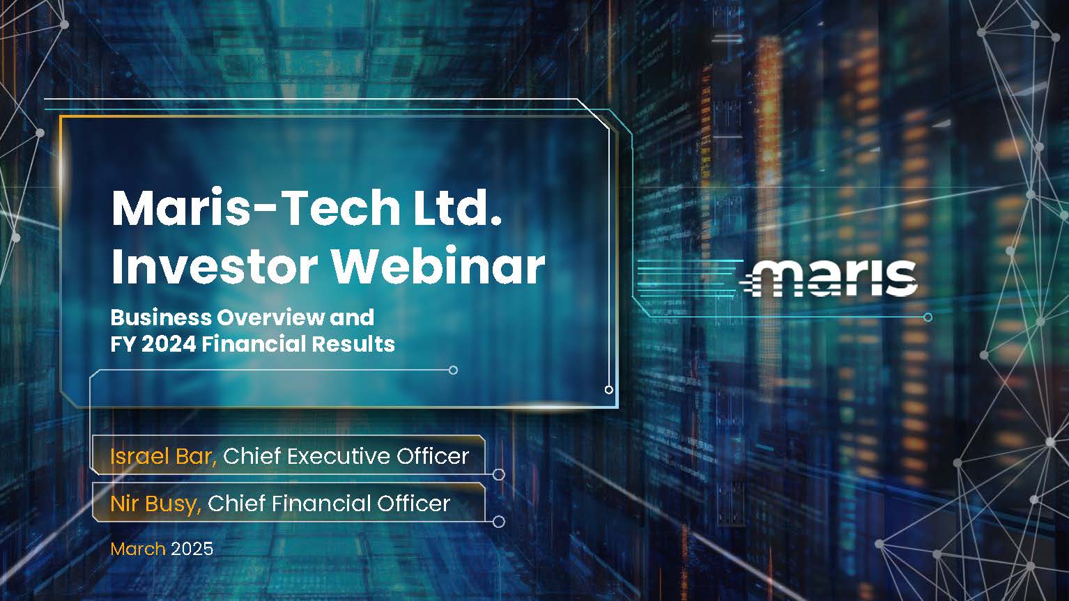 Investor Webinar Israel Bar, Chief Executive Officer Nir Busy, Chief Financial Officer Business Overview and FY 2024 Financial Results March 2025 The AI Video Pipeline 2 This presentation of Maris - Tech Ltd. (“Maris,” “Maris - Tech” or the “Company”) contains “forward - looking statements” within the m eaning of Section 27A of the Securities Act of 1933, as amended, and Section 21E of the Securities Exchange Act of 1934, as amended, that are intended to be covered by the “safe harbor” created by those sections. Forward - looking statements, which are based on certain assumptions and describe the Company’s future plans, strategies and expectations, can generally be identified by the use of forward - looking terms such as “believe,” “expect,” “may”, “should,” “cou ld,” “seek,” “intend,” “plan,” “goal,” “estimate,” “anticipate” or other comparable terms. For example, the Company is using forward - looking statements when it is disc ussing: expanding market opportunity; its core business strategy; benefits and advantages of its products and technology and technology roadmap for 20 25. Because forward - looking statements relate to the future, they are subject to inherent uncertainties, risks and changes in circumstances that are diff icu lt to predict and many of which are outside of the Company’s control. The Company’s actual results and financial condition may differ materially from those indic ate d in the forward - looking statements. Therefore, you should not rely on any of these forward - looking statements. Important factors that could cause the Co mpany’s actual results and financial condition to differ materially from those indicated in the forward - looking statements include, among others, the follo wing: its ability to successfully market its products and services, including in the North America, Eastern Europe, India, Singapore, Australia and South Korea ; i ts ability to raise capital through the issuance of additional securities; its planned level of revenues and capital expenditures; its belief that its existing cash and cash equivalents and short - term bank deposits, as of December 31, 2024, will be sufficient to fund its operations through the next twelve months; its ability to s ell its products; its plans to continue to invest in research and development to develop technology for both existing and new products; its plans to collaborate or, sta tem ents regarding the ongoing collaborations, with partner companies; its ability to main its relationships with suppliers, manufacturers, and other partne rs; its ability to maintain or protect the validity of its intellectual property; its ability to retain key executive members; its ability to internally develop and pro tec t new inventions and intellectual property; its ability to expose and educate the industry about the use of its products; its expectations regarding its tax classificati ons ; how long the Company will qualify as emerging growth company or a foreign private issuer; interpretations of current laws and the passages of future laws; general ma rket, political and economic conditions in the countries in which the Company operates including those related to recent unrest and actual or potential ar med conflict in Israel and other parts of the Middle East, such as the multi - front war Israel is facing; and the other risks and uncertainties described in the Annual Report on Form 20 - F for the year ended December 31, 2024, filed with the SEC on March 28, 2025, and its other filings with the SEC. Forward - looking statements speak on ly as of the statements are made. The Company assumes no obligation to update forward - looking statements to reflect actual results, subsequent events or circumsta nces, changes in assumptions or changes in other factors affecting forward - looking statements except to the extent required by applicable securit ies laws. If the Company does update one or more forward - looking statements, no inference should be drawn that the Company will make additional updates with r espect thereto or with respect to other forward - looking statements. The information contained in this presentation does not constitute a prospectus or other offering document, nor does it const itu te or form part of any invitation or offer to sell, or any solicitation of any invitation or offer to purchase or subscribe for, any securities of the Company or any other entity, nor shall the information or any part of it or the fact of its distribution form the basis of, or be relied on in connection with, any action, contract, c omm itment whatsoever relating to the securities of the Company. This presentation contains audited financial statements for the year ended December 31, 2024, filed as part of the Company's Ann ual Report on Form 20 - F on March 28, 2025. Unless otherwise noted, the information in this presentation is as of March 31, 2025, other than historical financial informa tio n, which is as of December 31, 2024. For more information regarding the Company, please see its filings with the SEC, including its Annual Report on Form 20 - F filed with the SEC on March 28, 2025, which contains its audited financial statements for the year ended December 31, 2024.
