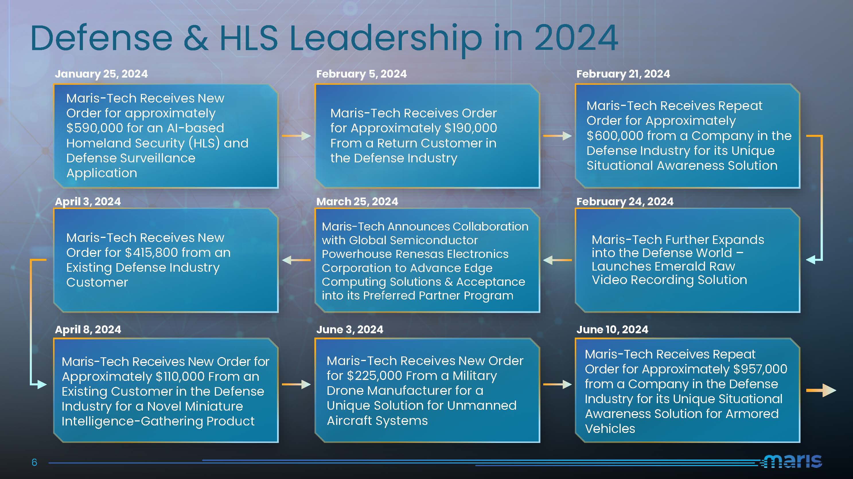 The AI Video Pipeline Defense & HLS Leadership in 2024 6 January 25 , 2024 February 5, 2024 February 21, 2024 April 3, 2024 March 25 , 2024 February 24, 2024 April 8 , 2024 June 3 , 2024 June 10 , 2024 Maris - Tech Receives New Order for approximately $590,000 for an AI - based Homeland Security (HLS) and Defense Surveillance Application Maris - Tech Receives Order for Approximately $190,000 From a Return Customer in the Defense Industry Maris - Tech Receives Repeat Order for Approximately $600,000 from a Company in the Defense Industry for its Unique Situational Awareness Solution Maris - Tech Receives New Order for $ 415,800 from an Existing Defense Industry Customer Maris - Tech Announces Collaboration with Global Semiconductor Powerhouse Renesas Electronics Corporation to Advance Edge Computing Solutions & Acceptance into its Preferred Partner Program Maris - Tech Further Expands into the Defense World – Launches Emerald Raw Video Recording Solution Maris - Tech Receives New Order for Approximately $ 110,000 From an Existing Customer in the Defense Industry for a Novel Miniature Intelligence - Gathering Product Maris - Tech Receives New Order for $ 225,000 From a Military Drone Manufacturer for a Unique Solution for Unmanned Aircraft Systems Maris - Tech Receives Repeat Order for Approximately $957,000 from a Company in the Defense Industry for its Unique Situational Awareness Solution for Armored Vehicles The AI Video Pipeline Defense & HLS Leadership in 2024 7 June 12, 2024 July 24 , 2024 August 1 , 2024 September 24 , 2024 September 24, 2024 September 24, 2024 October 10, 2024 December 23 , 2024 December 24, 2024 Maris Tech Collaborates with LightPath for AI - Ready Infrared Cameras Maris - Tech Unveils “ Diamond ” System – A Revolutionary Defense 360 ̂ 3 D Situational Awareness Solution for Armored Fighting Vehicles Maris - Tech Secures a $ 700,000 Order from a Repeat Customer in the Defense Industry for Innovative AI - Based Video Distribution Solution Maris - Tech Enhances its Diamond Platform to Combat Airborne Threats with Diamond Ultra – Facilitating Defense and Situational Awareness for Armored Fighting Vehicles Maris - Tech Announces that its Amethyst Edge Computing Video Solution Now Supports 5G, Enabling Ultra - Speed and High Data Transfer Maris - Tech Receives U.S. Patent for Innovative Forward Error Correction Optimization Method Maris - Tech is Expands its Operations in the U.S. Maris - Tech Secures a Significant $1 Million Order from a U.S. Repeat Customer in the Homeland Security Industry for Advanced Jupiter - based Video Solution Maris - Tech Completes Development of Uranus - Drones Technology and Prepares for Large - Scale Delivery