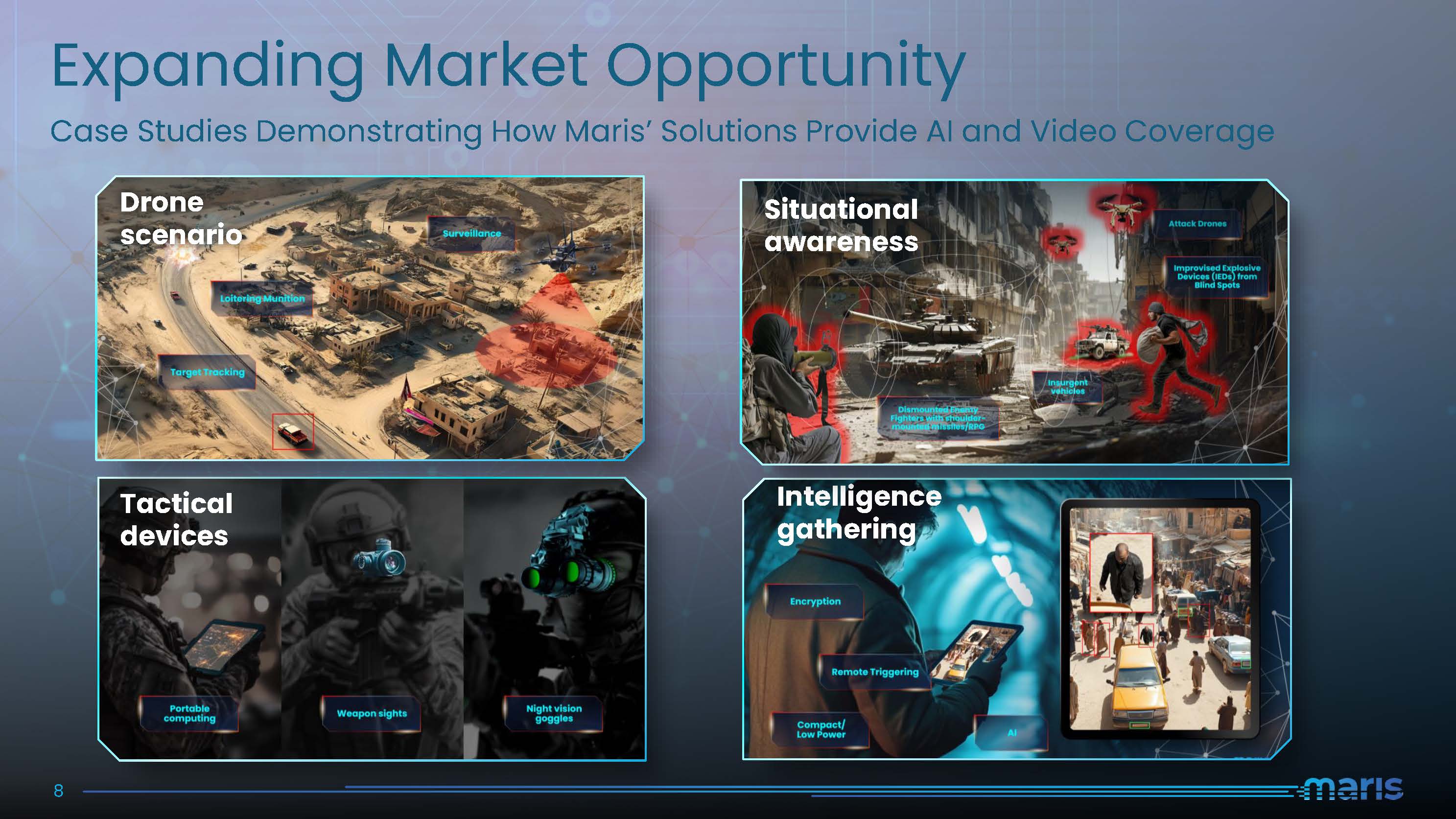 Legal D isclaimer Company overview Markets & Applications Customers & Partners Unmanned Aerial Vehicles & Drones Intelligence Gathering Defense Homeland Security Founded: 2008 IPO: 2022 Offices: Israel, USA About Maris : Maris - Tech is a global leader in video & AI - based edge computing technology, pioneering intelligent video transmission solutions that conquer complex encoding - decoding challenges.