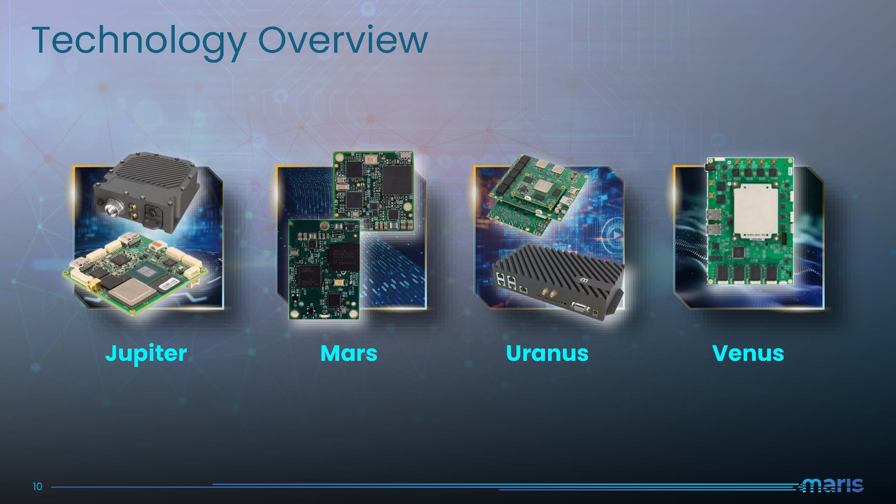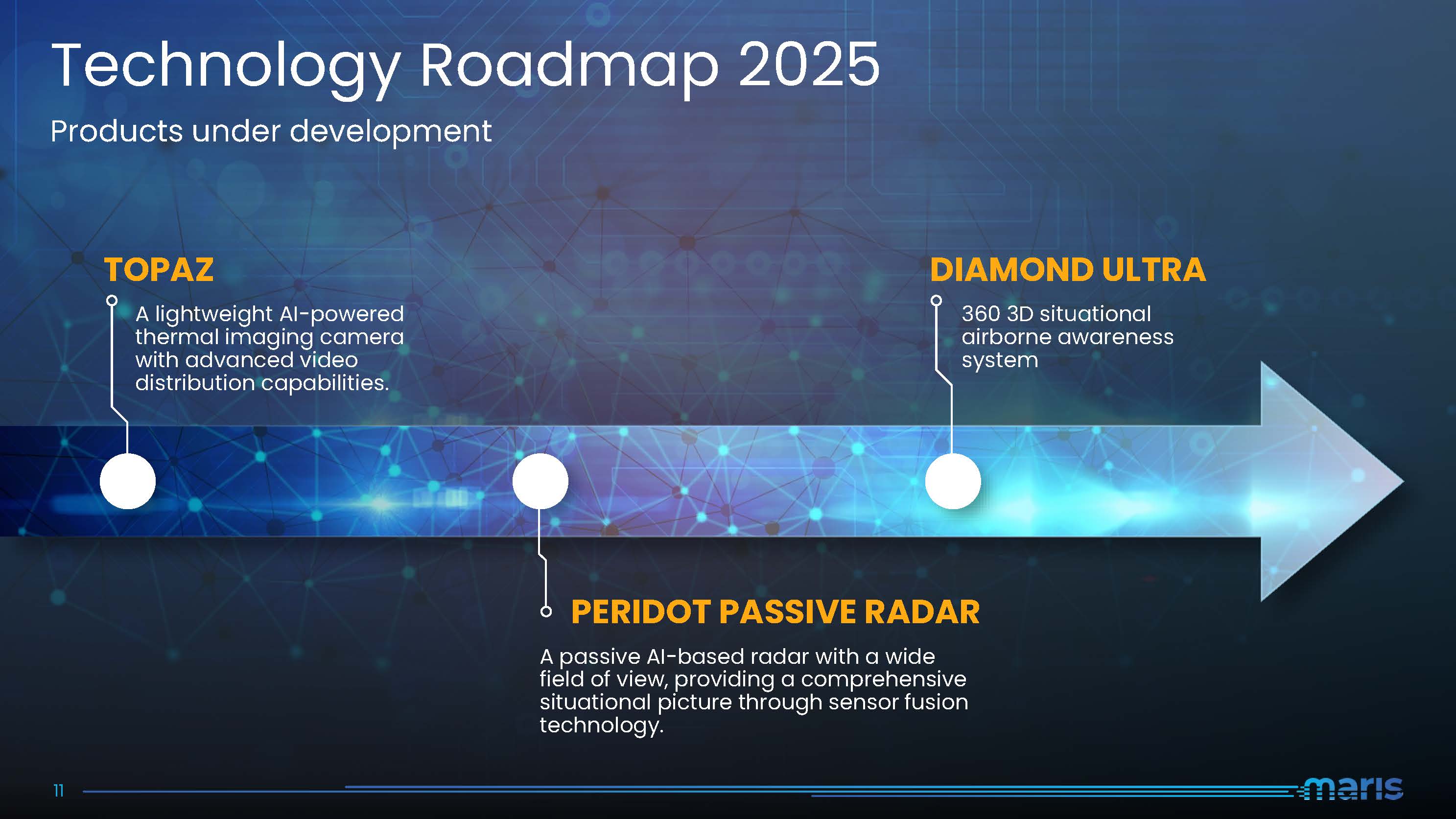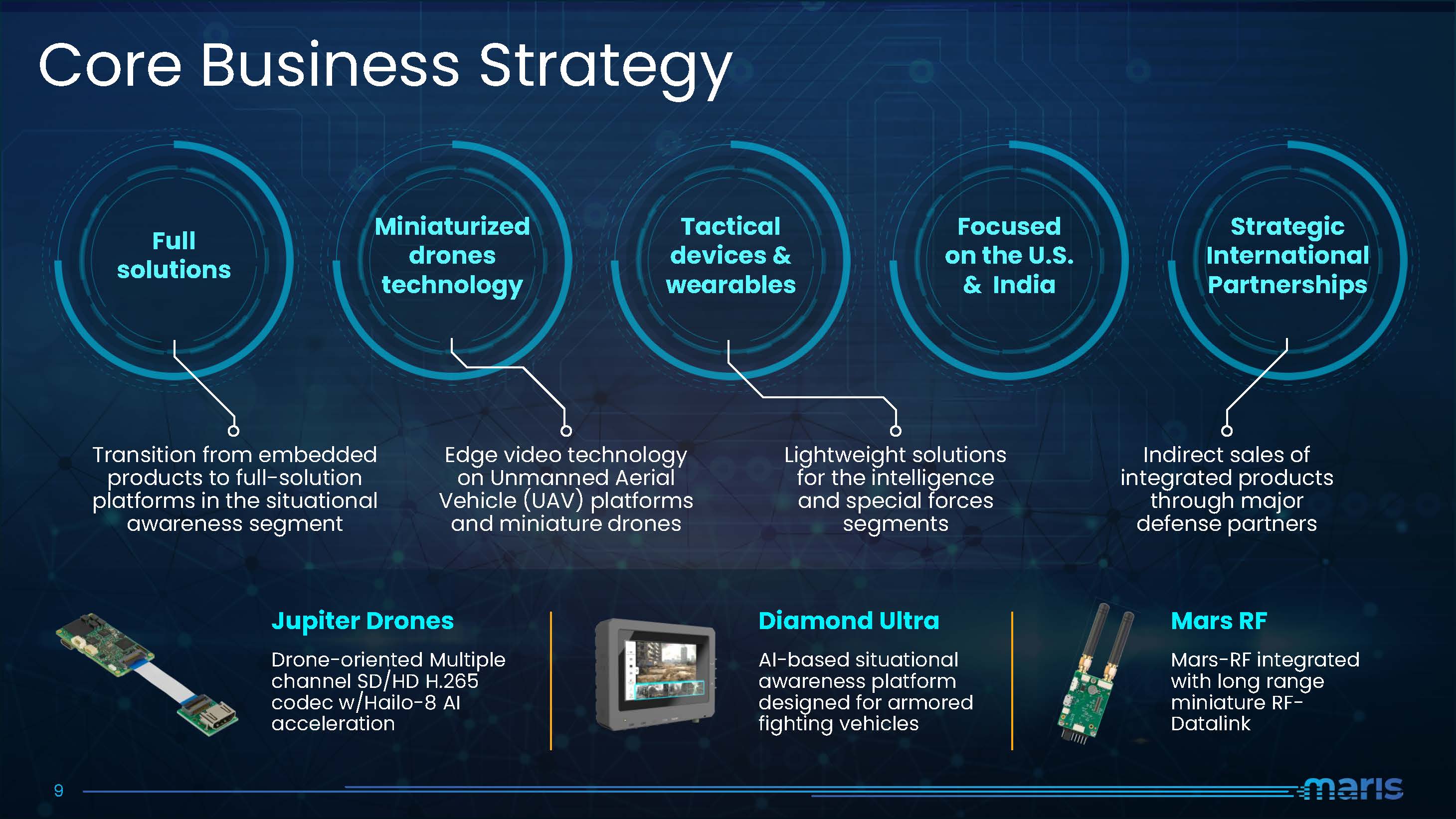 The AI Video Pipeline Expanding Market Opportunity 8 Tactical devices Intelligence gathering Drone scenario Situational awareness Case Studies Demonstrating How Maris ’ Solutions Provide AI and Video Coverage Core Business Strategy Strategic International Partnerships Focused on the U.S. & India Tactical devices & wearables Miniaturized drones technology Full solutions Transition from embedded products to full - solution platforms in the situational awareness segment Edge video technology on Unmanned Aerial Vehicle (UAV) platforms and miniature drones Lightweight solutions for the intelligence and special forces segments Indirect sales of integrated products through major defense partners 9 Jupiter Drones Drone - oriented Multiple channel SD/HD H. 265 codec w/Hailo - 8 AI acceleration Diamond Ultra AI - based situational awareness platform designed for armored fighting vehicles Mars RF Mars - RF integrated with long range miniature RF - Datalink The AI Video Pipeline Technology Overview Jupiter Mars Uranus Venus 10