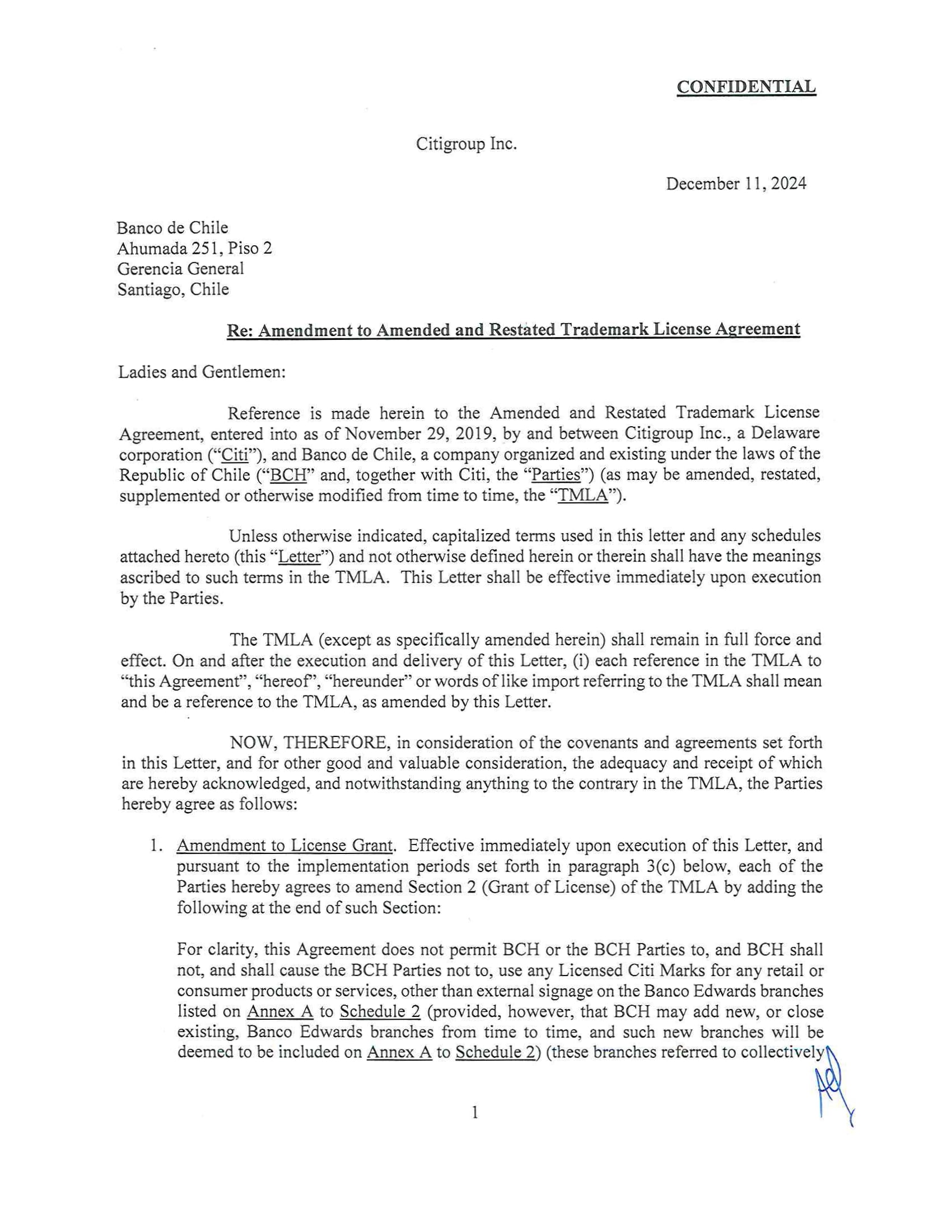 Banco de Chile’s employees are prohibited from providing services of any kind to other bank or financial institution, as well as to companies owned by or related to Banco de Chile’s clients, so as to prevent any conflict of interests that may be the cause of disloyalty to Banco de Chile, except in cases where written authorization from Banco de Chile’s CEO exist.