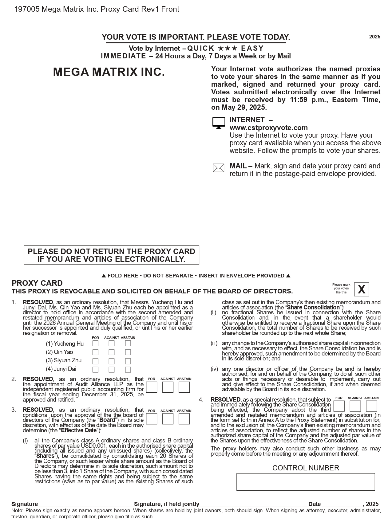 2025 1 . RESOLVED , as an ordinary resolution, that Messrs . Yucheng Hu and Junyi Dai, Ms . Qin Yao and Ms . Siyuan Zhu each be appointed as a director to hold office in accordance with the second amended and restated memorandum and articles of association of the Company until the 2026 Annual General Meeting of the Company and until his or her successor is appointed and duly qualified, or until his or her earlier resignation or removal . (1) Yucheng Hu (2) Qin Yao (3) Siyuan Zhu (4) Junyi Dai 2. RESOLVED , as an ordinary resolution, that the appointment of Audit Alliance LLP as the independent registered public accounting firm for the fiscal year ending December 31 , 2025 , be approved and ratified . 3. RESOLVED , as an ordinary resolution, that conditional upon the approval of the the board of directors of the Company (the “ Board ”) in its sole discretion, with effect as of the date the Board may determine (the “ Effective Date ”) : (i) al l th e Company ’ s clas s A ordinar y share s an d clas s B ordinary share s o f pa r valu e USD 0 . 001 , eac h i n th e authorise d shar e capital (includin g al l issue d an d an y unissue d shares ) (collectivel y , the “ Shares ”), b e consolidate d b y consolidatin g eac h 2 0 Share s of th e Compan y , o r suc h lesse r whol e shar e amoun t a s th e Boar d of Director s ma y determin e i n it s sol e discretion , suc h amoun t no t to b e les s tha n 3 , int o 1 Shar e o f th e Compan y , wit h suc h consolidated Share s havin g th e sam e right s an d bein g subjec t t o th e same restriction s (sav e a s t o pa r value ) a s th e existin g Share s o f such class as set out in the Company’s then existing memorandum and articles of association (the “ Share Consolidation ”) ; no fractional Shares be issued in connection with the Share Consolidation and, in the event that a shareholder would otherwise be entitled to receive a fractional Share upon the Share Consolidation, the total number of Shares to be received by such shareholder be rounded up to the next whole Share ; any change to the Company’s authorised share capital in connection with, and as necessary to effect, the Share Consolidation be and is hereby approved, such amendment to be determined by the Board in its sole discretion ; and (ii) (iii) (iv) any one director or officer of the Company be and is hereby authorised, for and on behalf of the Company, to do all such other acts or things necessary or desirable to implement, carry out and give effect to the Share Consolidation, if and when deemed advisable by the Board in its sole discretion . 4. RESOLVED , as a special resolution, that subject to and immediately following the Share Consolidation being effected, the Company adopt the third amende d an d restate d memorandu m an d article s o f associatio n (in th e for m se t fort h i n Anne x A t o th e Prox y Statement ) i n substitutio n fo r , an d t o th e exclusio n of , th e Company ’ s the n existin g memorandu m and article s o f association , t o re fl ec t th e adjuste d numbe r o f share s i n the authorize d shar e capita l o f th e Compan y an d th e adjuste d pa r valu e of th e Share s upo n th e effectiveness o f th e Shar e Consolidation . The proxy holders may also conduct such other business as may properly come before the meeting or any adjournment thereof . MEGA MATRIX INC. PLEASE DO NOT RETURN THE PROXY CARD IF YOU ARE VOTING ELECTRONICALLY. 197005 Mega Matrix Inc. Proxy Card Rev1 Front YOUR VOTE IS IMPORTANT. PLEASE VOTE TODAY. Vote by Internet - QUICK YYY EASY IMMEDIATE - 24 Hours a Day, 7 Days a Week or by Mail Your Internet vote authorizes the named proxies FOLD HERE • DO NOT SEPARATE • INSERT IN ENVELOPE PROVIDED CONTROL NUMBER Signature Signature, if held jointly Date , 2025 Note: Please sign exactly as name appears hereon. When shares are held by joint owners, both should sign. When signing as attorney, executor, administrator, trustee, guardian, or corporate officer, please give title as such. PROXY CARD THIS PROXY IS REVOCABLE AND SOLICITED ON BEHALF OF THE BOARD OF DIRECTORS. Please mark like this X your votes FOR AGAINST ABSTAIN FOR AGAINST ABSTAIN FOR AGAINST ABSTAIN FOR AGAINST ABSTAIN to vote your shares in the same manner as if you marked, signed and returned your proxy card . Votes submitted electronically over the Internet must be received by 11 : 59 p . m . , Eastern Time, on May 29 , 2025 . INTERNET – www.cstproxyvote.com Use the Internet to vote your proxy. Have your proxy card available when you access the above website. Follow the prompts to vote your shares. MAIL – Mark, sign and date your proxy card and return it in the postage - paid envelope provided.