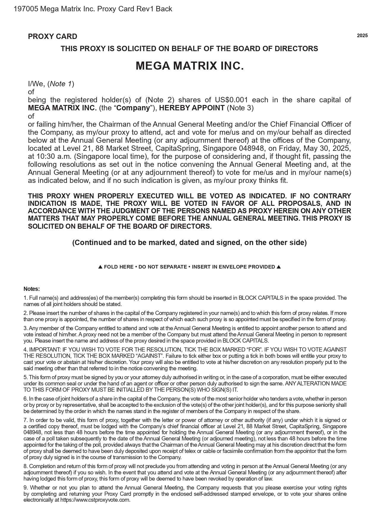2025 197005 Mega Matrix Inc. Proxy Card Rev1 Back PROXY CARD THIS PROXY IS SOLICITED ON BEHALF OF THE BOARD OF DIRECTORS MEGA MATRIX INC. I/We, ( Note 1 ) of being the registered holder(s) of (Note 2) shares of US$0.001 each in the share capital of MEGA MATRIX INC. (the “ Company ”), HEREBY APPOINT (Note 3) of or failing him/her, the Chairman of the Annual General Meeting and/or the Chief Financial Officer of the Company, as my/our proxy to attend, act and vote for me/us and on my/our behalf as directed below at the Annual General Meeting (or any adjournment thereof) at the offices of the Company, located at Level 21 , 88 Market Street, CapitaSpring, Singapore 048948 , on Friday, May 30 , 2025 , at 10 : 30 a . m . (Singapore local time), for the purpose of considering and, if thought fit, passing the following resolutions as set out in the notice convening the Annual General Meeting and, at the Annual General Meeting (or at any adjournment thereof) to vote for me/us and in my/our name(s) as indicated below, and if no such indication is given, as my/our proxy thinks fit . THIS PROXY WHEN PROPERLY EXECUTED WILL BE VOTED AS INDICATED . IF NO CONTRARY INDICATION IS MADE, THE PROXY WILL BE VOTED IN FAVOR OF ALL PROPOSALS, AND IN ACCORDANCE WITH THE JUDGMENT OF THE PERSONS NAMED AS PROXY HEREIN ON ANY OTHER MATTERS THAT MAY PROPERLY COME BEFORE THE ANNUAL GENERAL MEETING . THIS PROXY IS SOLICITED ON BEHALF OF THE BOARD OF DIRECTORS . (Continued and to be marked, dated and signed, on the other side) FOLD HERE • DO NOT SEPARATE • INSERT IN ENVELOPE PROVIDED Notes: 1. Full name(s) and address(es) of the member(s) completing this form should be inserted in BLOCK CAPITALS in the space provided . The names of all joint holders should be stated . 2. Please insert the number of shares in the capital of the Company registered in your name(s) and to which this form of proxy relates . If more than one proxy is appointed, the number of shares in respect of which each such proxy is so appointed must be specified in the form of proxy . 3. An y membe r o f th e Compan y entitle d t o atten d an d vot e a t th e Annua l Genera l Meetin g i s entitle d t o appoin t anothe r perso n t o atten d and vot e instea d o f him/he r . A prox y nee d no t b e a membe r o f th e Compan y bu t mus t atten d th e Annua l Genera l Meetin g i n perso n t o represent you . Pleas e inser t th e nam e an d addres s o f th e prox y desire d i n th e spac e provide d i n BLOC K CAPI T ALS . 4. IMPORTANT : IF YOU WISH TO VOTE FOR THE RESOLUTION, TICK THE BOX MARKED “FOR” . IF YOU WISH TO VOTE AGAINST THE RESOLUTION, TICK THE BOX MARKED “AGAINST” . Failure to tick either box or putting a tick in both boxes will entitle your proxy to cast your vote or abstain at his/her discretion . Your proxy will also be entitled to vote at his/her discretion on any resolution properly put to the said meeting other than that referred to in the notice convening the meeting . 5. Thi s for m o f prox y mus t b e signe d b y yo u o r you r attorne y dul y authorise d i n writin g o r , i n th e cas e o f a corporation , mus t b e eithe r executed unde r it s commo n sea l o r unde r th e han d o f a n agen t o r officer o r othe r perso n dul y authorise d t o sig n th e same . AN Y ALTERATION MADE TO THI S FORM OF PROX Y MUST B E INITIALLE D B Y TH E PERSON(S ) WHO SIGN(S ) IT . 6. I n th e cas e o f join t holder s o f a shar e i n th e capita l o f th e Compan y , th e vot e o f th e mos t senio r holde r wh o tender s a vote , whethe r i n person o r b y prox y o r b y representative , shal l b e accepte d t o th e exclusio n o f th e vote(s ) o f th e othe r join t holder(s) , an d fo r thi s purpos e seniorit y shall b e determine d b y th e orde r i n whic h th e name s stan d i n th e registe r o f member s o f th e Compan y i n respec t o f th e share . 7. In order to be valid, this form of proxy, together with the letter or power of attorney or other authority (if any) under which it is signed or a certified copy thereof, must be lodged with the Company’s chief financial officer at Level 21 , 88 Market Street, CapitaSpring, Singapore 048948 , not less than 48 hours before the time appointed for holding the Annual General Meeting (or any adjournment thereof), or in the case of a poll taken subsequently to the date of the Annual General Meeting (or adjourned meeting), not less than 48 hours before the time appointed for the taking of the poll, provided always that the Chairman of the Annual General Meeting may at his discretion direct that the form of proxy shall be deemed to have been duly deposited upon receipt of telex or cable or facsimile confirmation from the appointor that the form of proxy duly signed is in the course of transmission to the Company . 8. Completion and return of this form of proxy will not preclude you from attending and voting in person at the Annual General Meeting (or any adjournment thereof) if you so wish . In the event that you attend and vote at the Annual General Meeting (or any adjournment thereof) after having lodged this form of proxy, this form of proxy will be deemed to have been revoked by operation of law . 9. Whether or not you plan to attend the Annual General Meeting, the Company requests that you please exercise your voting rights by completing and returning your Proxy Card promptly in the enclosed self - addressed stamped envelope, or to vote your shares online electronically at https : //www . cstproxyvote . com .