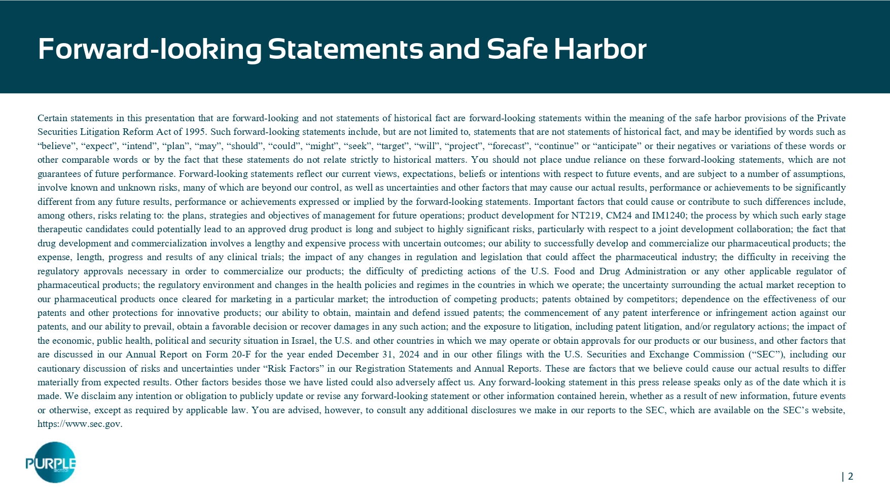 | 1 NASDAQ/TASE: PPBT May 2025 CORPORATE PRESENTATION | 2 Forward - looking Statements and Safe Harbor Certain statements in this presentation that are forward - looking and not statements of historical fact are forward - looking statements within the meaning of the safe harbor provisions of the Private Securities Litigation Reform Act of 1995 . Such forward - looking statements include, but are not limited to, statements that are not statements of historical fact, and may be identified by words such as “believe”, “expect”, “intend”, “plan”, “may”, “should”, “could”, “might”, “seek”, “target”, “will”, “project”, “forecast”, “continue” or “anticipate” or their negatives or variations of these words or other comparable words or by the fact that these statements do not relate strictly to historical matters . You should not place undue reliance on these forward - looking statements, which are not guarantees of future performance . Forward - looking statements reflect our current views, expectations, beliefs or intentions with respect to future events, and are subject to a number of assumptions, involve known and unknown risks, many of which are beyond our control, as well as uncertainties and other factors that may cause our actual results, performance or achievements to be significantly different from any future results, performance or achievements expressed or implied by the forward - looking statements . Important factors that could cause or contribute to such differences include, among others, risks relating to : the plans, strategies and objectives of management for future operations ; product development for NT 219 , CM 24 and IM 1240 ; the process by which such early stage therapeutic candidates could potentially lead to an approved drug product is long and subject to highly significant risks, particularly with respect to a joint development collaboration ; the fact that drug development and commercialization involves a lengthy and expensive process with uncertain outcomes ; our ability to successfully develop and commercialize our pharmaceutical products ; the expense, length, progress and results of any clinical trials ; the impact of any changes in regulation and legislation that could affect the pharmaceutical industry ; the difficulty in receiving the regulatory approvals necessary in order to commercialize our products ; the difficulty of predicting actions of the U . S . Food and Drug Administration or any other applicable regulator of pharmaceutical products ; the regulatory environment and changes in the health policies and regimes in the countries in which we operate ; the uncertainty surrounding the actual market reception to our pharmaceutical products once cleared for marketing in a particular market ; the introduction of competing products ; patents obtained by competitors ; dependence on the effectiveness of our patents and other protections for innovative products ; our ability to obtain, maintain and defend issued patents ; the commencement of any patent interference or infringement action against our patents, and our ability to prevail, obtain a favorable decision or recover damages in any such action ; and the exposure to litigation, including patent litigation, and/or regulatory actions ; the impact of the economic, public health, political and security situation in Israel, the U . S . and other countries in which we may operate or obtain approvals for our products or our business, and other factors that are discussed in our Annual Report on Form 20 - F for the year ended December 31 , 2024 and in our other filings with the U . S . Securities and Exchange Commission (“SEC”), including our cautionary discussion of risks and uncertainties under “Risk Factors” in our Registration Statements and Annual Reports . These are factors that we believe could cause our actual results to differ materially from expected results . Other factors besides those we have listed could also adversely affect us . Any forward - looking statement in this press release speaks only as of the date which it is made . We disclaim any intention or obligation to publicly update or revise any forward - looking statement or other information contained herein, whether as a result of new information, future events or otherwise, except as required by applicable law . You are advised, however, to consult any additional disclosures we make in our reports to the SEC, which are available on the SEC’s website, https : //www . sec . gov .