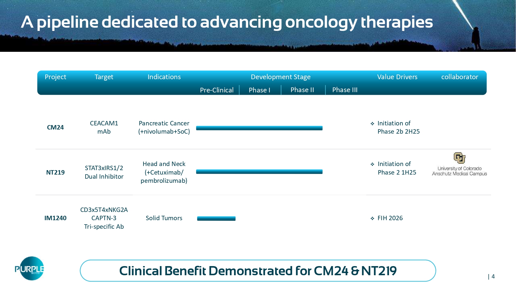 | 3 Corporate highlights Purple Biotech (NASDAQ/TASE: PPBT) As of December 31, 2024 • ADS Outstanding: 2.6 M • Cash Balance: $8.2 M Well positioned to advance next clinical milestones • Two First - in - Class clinical stage drugs • A preclinical tri - specific immuno - engagers platform • Lean & global operation • Cash runway into mid 2026 Purple Biotech identifies promising first - in - class drug candidates to treat cancers with high unmet medical need | 4 collaborator Value Drivers Development Stage Indications Target Project Phase III Phase II Phase I Pre - Clinical □ Initiation of Phase 2b 2H25 Pancreatic Cancer (+ nivolumab+SoC ) CEACAM1 mAb CM24 □ Initiation of Phase 2 1H25 Head and Neck (+Cetuximab/ pembrolizumab) STAT3xIRS1/2 Dual Inhibitor NT219 □ FIH 2026 Solid Tumors CD3x5T4xNKG2A CAPTN - 3 Tri - specific Ab IM 1240 A pipeline dedicated to advancing oncology therapies Clinical Benefit Demonstrated for CM24 & NT219