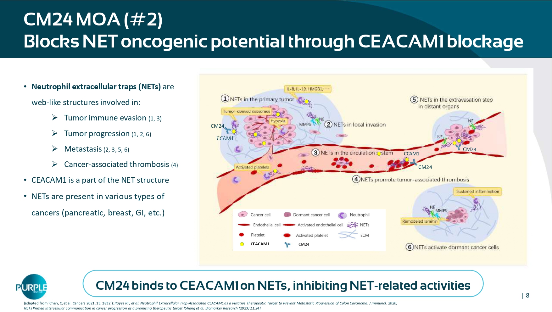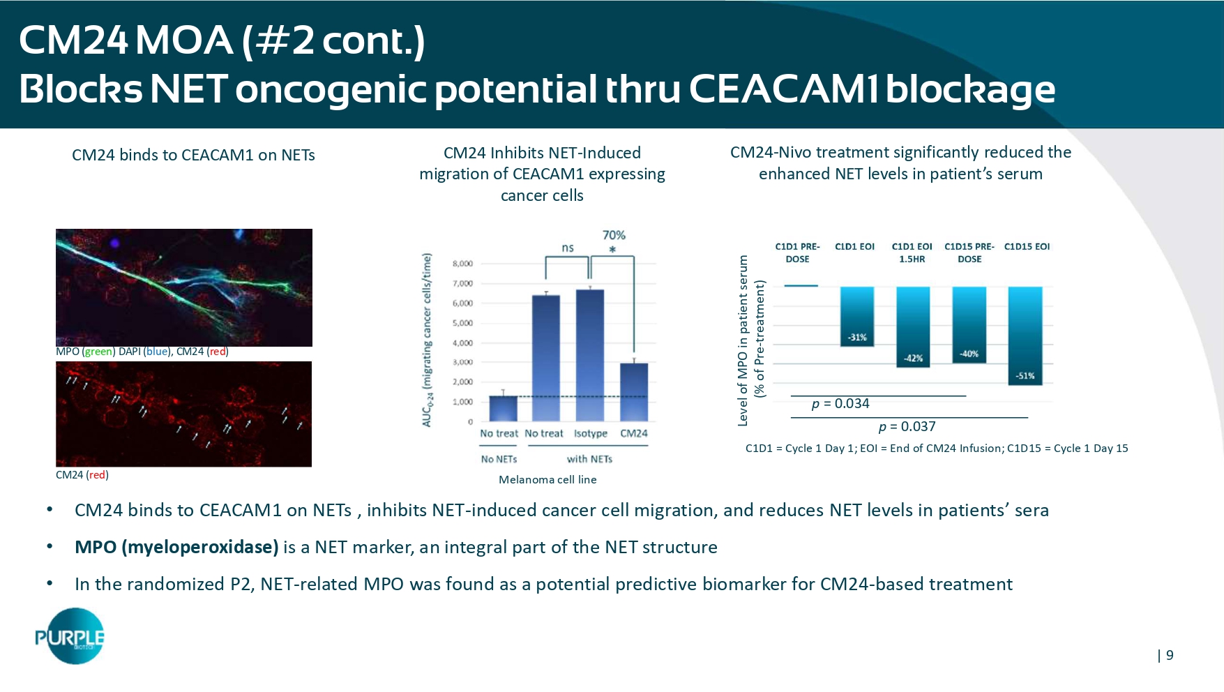 | 8 CM24 MOA (#2) B locks NET oncogenic potential thr o u gh CEACAM1 blockage • Neutrophil extracellular traps ( NETs) are web - like structures involved in: » Tumor immune evasion (1, 3) » Tumor progression (1, 2, 6) » Metastasis (2, 3, 5, 6) » Cancer - associated thrombosis (4) • CEACAM1 is a part of the NET structure • NETs are present in various types of cancers (pancreatic, breast, GI, etc.) (adapted from ‘Chen, Q et al. Cancers 2021, 13, 2832’); Rayes RF, et al. Neutrophil Extracellular Trap - Associated CEACAM1 as a Putative Therapeutic Target to Prevent Metastatic Progression of Colon Carcinoma. J Immunol. 2020; NETs Primed intercellular communication in cancer progression as a promising therapeutic target [Shang et al.