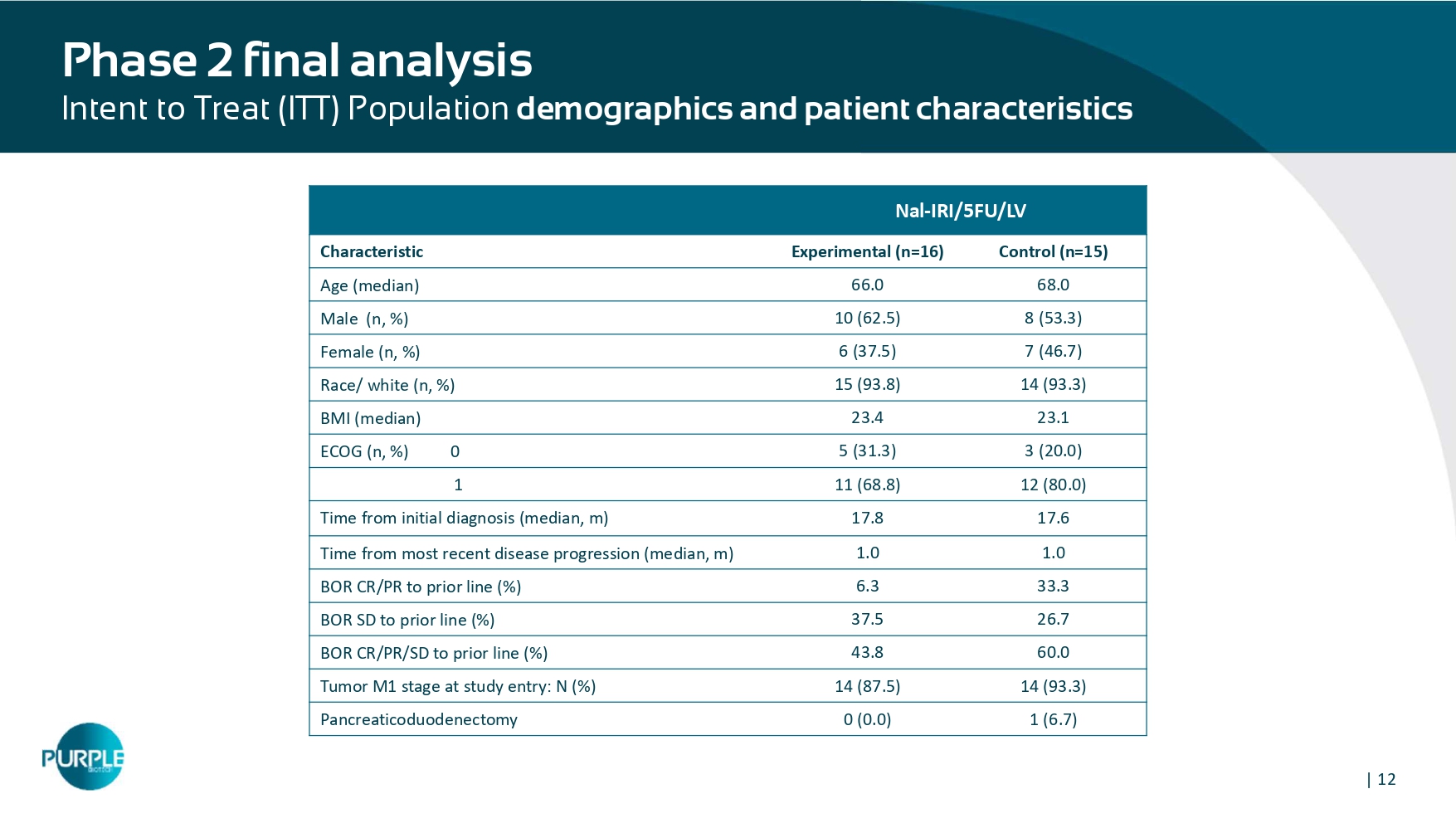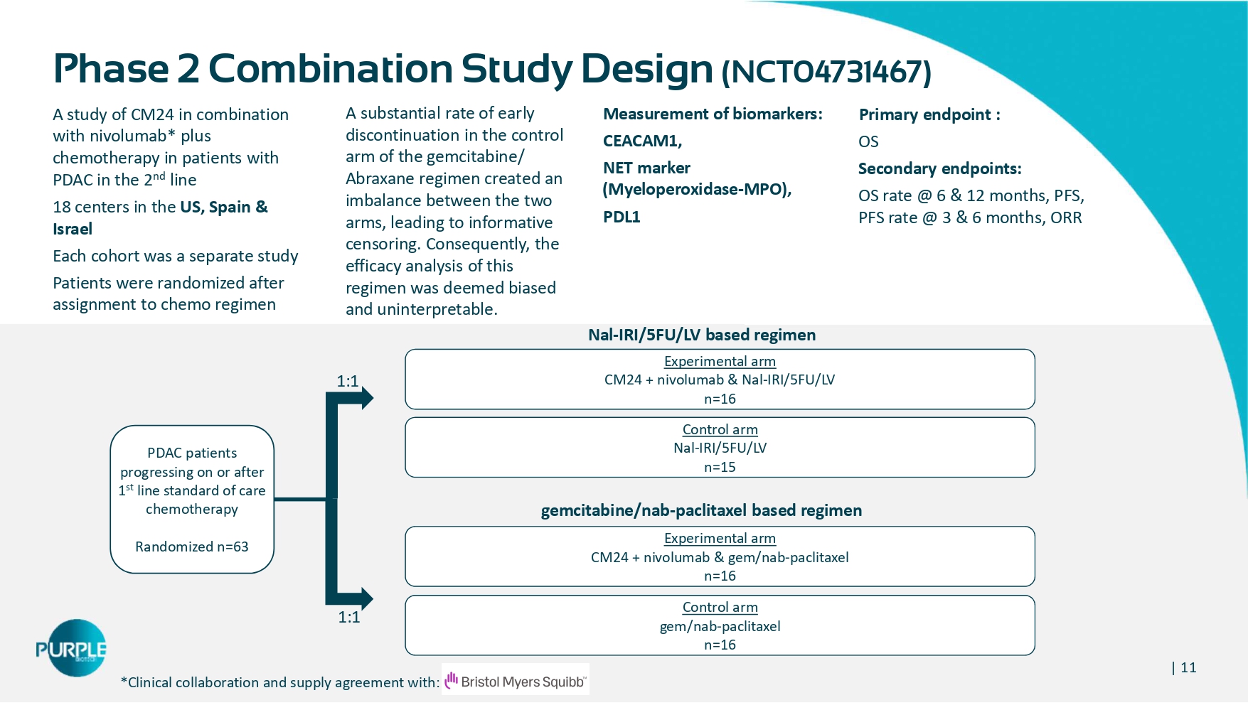 Calinescu et al, Journal of Immunology Research 2018: 7169081; Carcinoembryonic antigen - related cell adhesion molecules (CEACAM) 1, 5 and 6 as biomarkers in pancreatic cancer, DOI:10.1371/journal.pone.0113023 | 11 A study of CM24 in combination with nivolumab* plus chemotherapy in patients with PDAC in the 2 nd line 18 centers in the US, Spain & Israel Each cohort was a separate study Patients were randomized after assignment to chemo regimen Measurement of biomarkers: CEACAM1, NET marker (Myeloperoxidase - MPO), PDL1 Primary endpoint : OS Secondary endpoints: OS rate @ 6 & 12 months, PFS, PFS rate @ 3 & 6 months, ORR Phase 2 Combination Study Design (NCT04731467) – A substantial rate of early discontinuation in the control arm of the gemcitabine/ Abraxane regimen created an imbalance between the two arms, leading to informative censoring. Consequently, the efficacy analysis of this regimen was deemed biased and uninterpretable. Experimental arm CM24 + nivolumab & Nal - IRI/5FU/LV n=16 Control arm Nal - IRI/5FU/LV n=15 Experimental arm CM24 + nivolumab & gem/nab - paclitaxel n=16 Control arm gem/nab - paclitaxel n=16 PDAC patients progressing on or after 1 st line standard of care chemotherapy Randomized n=63 1:1 1:1 Nal - IRI/5FU/LV based regimen gemcitabine/nab - paclitaxel based regimen *Clinical collaboration and supply agreement with: