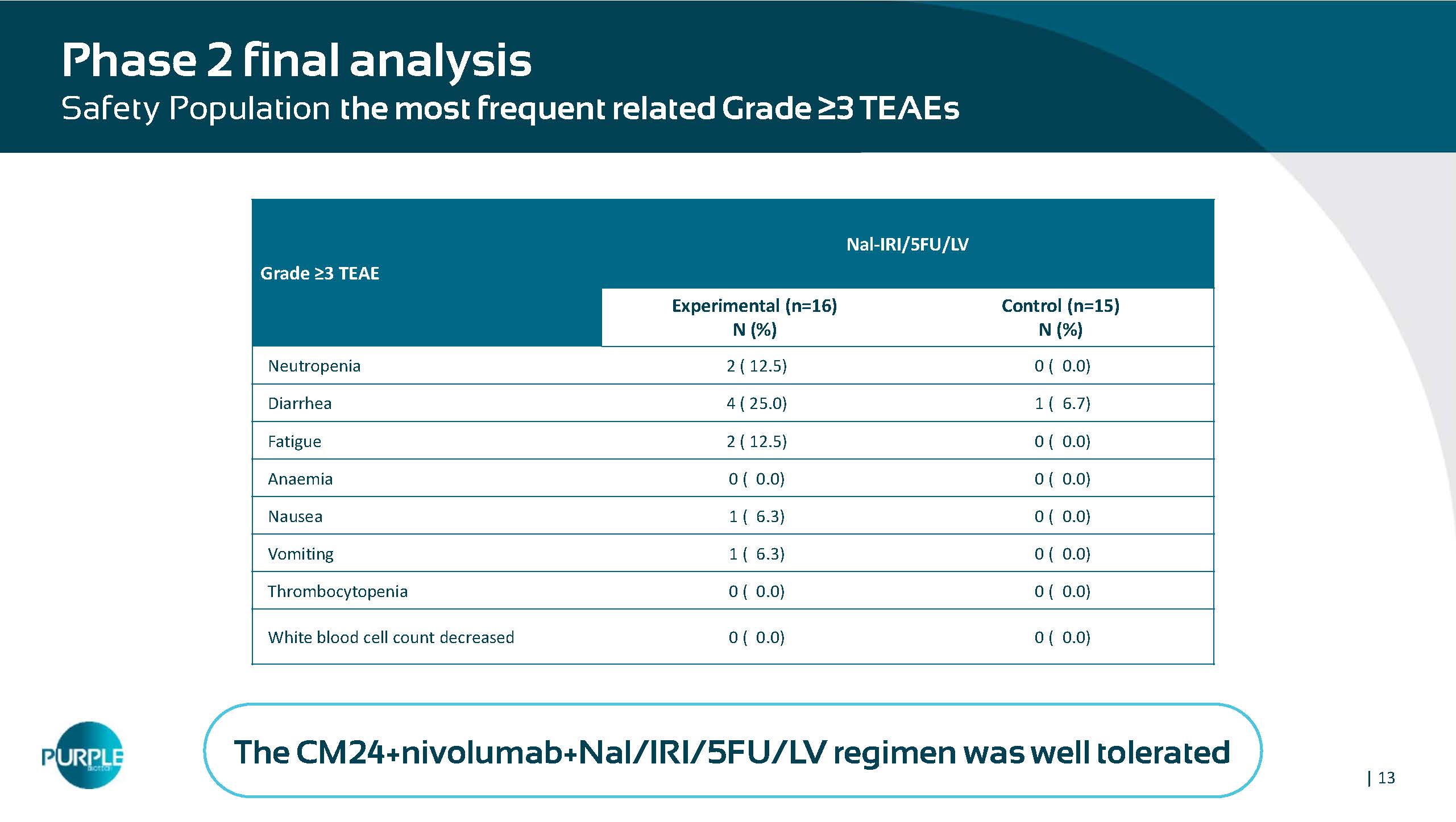 | 12 Nal - IRI/5FU/LV Control (n=15) Experimental (n=16) Characteristic 68.0 66.0 Age (median) 8 (53.3) 10 (62.5) Male (n, %) 7 (46.7) 6 (37.5) Female (n, %) 14 (93.3) 15 (93.8) Race/ white (n, %) 23.1 23.4 BMI (median) 3 (20.0) 5 (31.3) ECOG (n, %) 0 12 (80.0) 11 (68.8) 1 ϭϳ͘ϲ ͘ ϭϳ 8 Time from initial diagnosis (median, m) 1.0 1.0 Time from most recent disease progression (median, m) 33.3 6.3 BOR CR/PR to prior line (%) 26.7 37.5 BOR SD to prior line (%) 60.0 43.8 BOR CR/PR/SD to prior line (%) 14 (93.3) 14 (87.5) Tumor M1 stage at study entry: N (%) 1 (6.7) 0 (0.0) Pancreaticoduodenectomy Phase 2 final analysis Intent to Treat (ITT) Population demographics and patient characteristics | 13 Nal - IRI/5FU/LV Grade ≥3 TEAE Control (n=15) N (%) Experimental (n=16) N (%) 0 ( 0.0) 2 ( 12.5) Neutropenia 1 ( 6.7) 4 ( 25.0) Diarrhea 0 ( 0.0) 2 ( 12.5) Fatigue 0 ( 0.0) 0 ( 0.0) Anaemia 0 ( 0.0) 1 ( 6.3) Nausea 0 ( 0.0) 1 ( 6.3) Vomiting 0 ( 0.0) 0 ( 0.0) Thrombocytopenia 0 ( 0.0) 0 ( 0.0) White blood cell count decreased Phase 2 final analysis Safety Population the most frequent related Grade ≥ 3 TEAEs The CM24+nivolumab+Nal/IRI/5FU/LV regimen was well tolerated