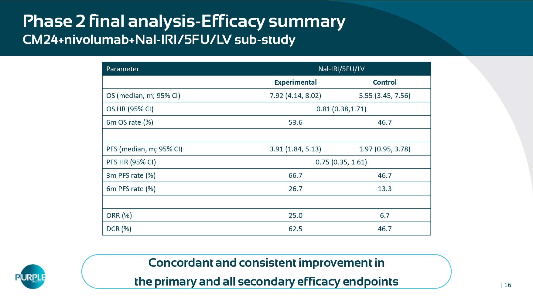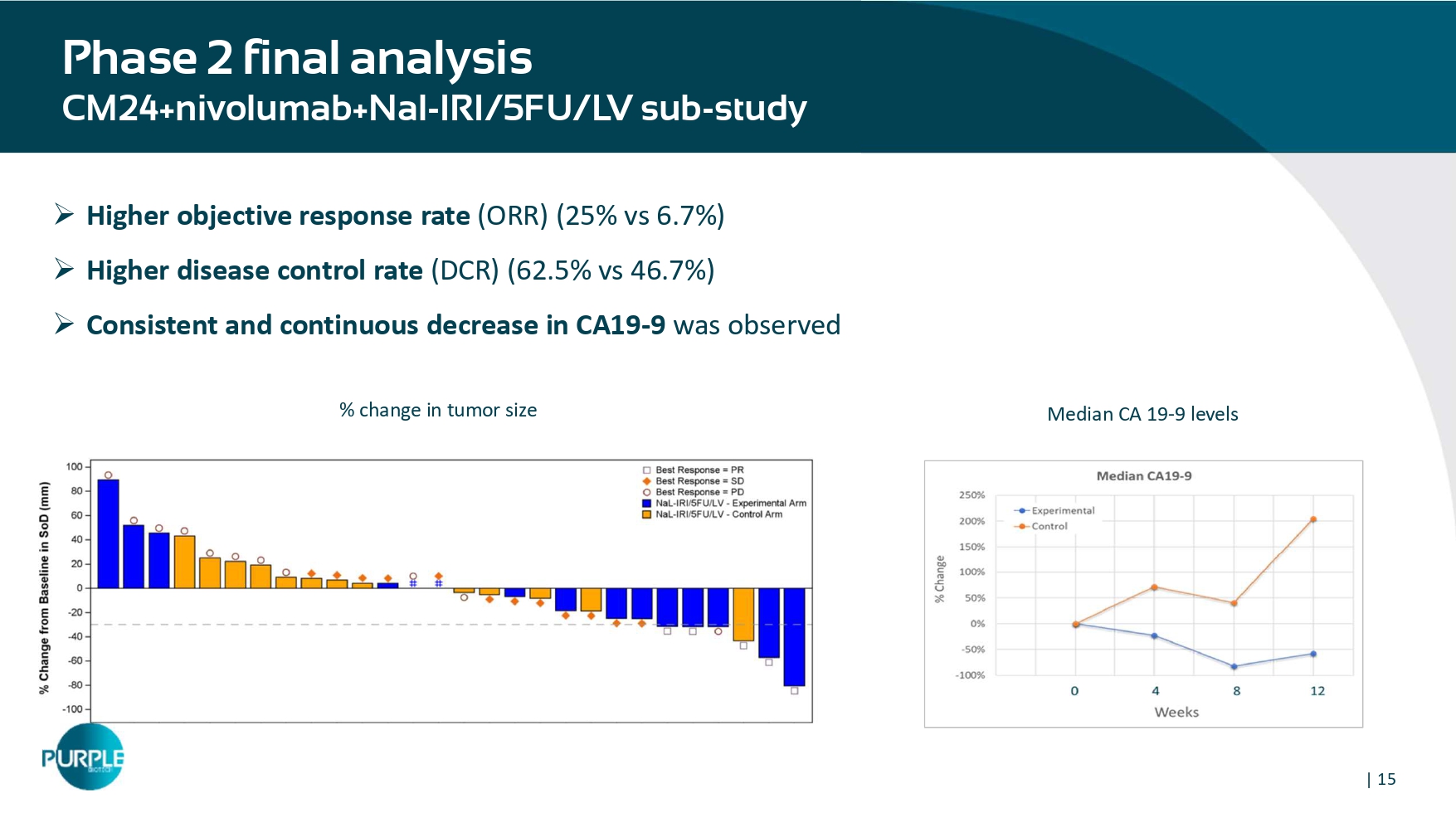 | 15 Phase 2 final analysis CM24+nivolumab+Nal - IRI/5FU/LV sub - study » Higher objective response rate (ORR) (25% vs 6.7%) » Higher disease control rate (DCR) (62.5% vs 46.7%) » Consistent and continuous decrease in CA19 - 9 was observed Median CA 19 - 9 levels % change in tumor size | 16 Phase 2 final analysis - Efficacy summary CM24+nivolumab+Nal - IRI/5FU/LV sub - study Concordant and consistent improvement in the primary and all secondary efficacy endpoints Nal - IRI/5FU/LV Parameter Control Experimental 5.55 (3.45, 7.56) 7.92 (4.14, 8.02) OS (median, m; 95% CI) 0.81 (0.38,1.71) OS HR (95% CI) 46.7 53.6 6m OS rate (%) 1.97 (0.95, 3.78) 3.91 (1.84, 5.13) PFS (median, m; 95% CI) 0.75 (0.35, 1.61) PFS HR (95% CI) 46.7 66.7 3m PFS rate (%) 13.3 26.7 6m PFS rate (%) 6.7 25.0 ORR (%) 46.7 62.5 DCR (%)