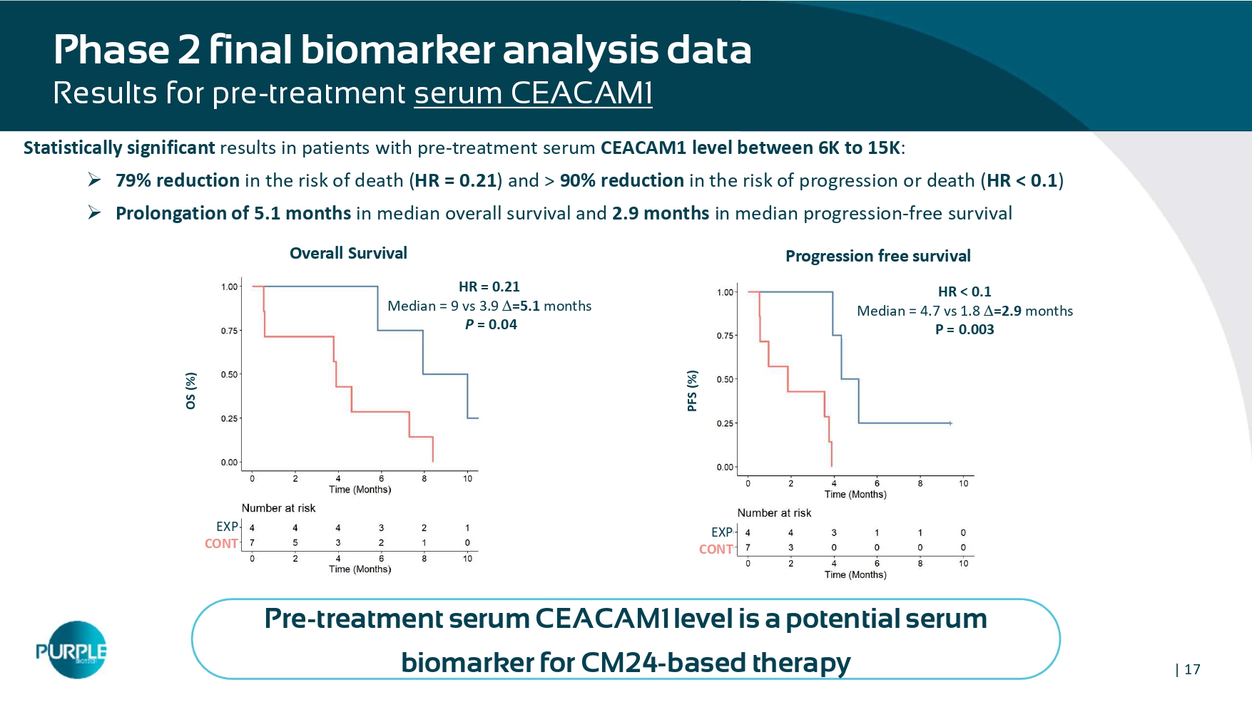 39 ) and 72 % reduction in the risk of progression or death ( HR =0.28 ) » Prolongation of 2 . 4 months in median overall survival and 2.2 months in median progression - free survival 6K < sCCAM1 < 15K pg /mL or 200 < MPO < 600 ng/mL PFS (%) EXP CONT 6K < sCCAM1 < 15K pg /mL or 200 < MPO < 600 ng/mL Overall Survival (%) HR = 0.39 (0.16 - 0.98) Median = 7.9 vs 5.5 =2.4 P = 0.039 EXP CONT HR = 0.28 (0.11 - 0.73) Median = 4.1 vs 1.9 =2.2 P = 0.006 Progression Free Survival Overall Survival Pre - dose serum CEACAM1 or NET marker MPO levels are potential serum biomarkers for CM24 - based therapy | 20 Overall Survival (%) HR = 0.1 (0.01 - 0.89) Median = 7.9m vs 3.9m = 4m P = 0.013 Statistically significant results for patients with High CEACAM1 (H - score>1 00 ) and Low PDL1 ( CPS ≤ 1 ) expression in tumors : » 90 % reduction in risk of death ( HR = 0.