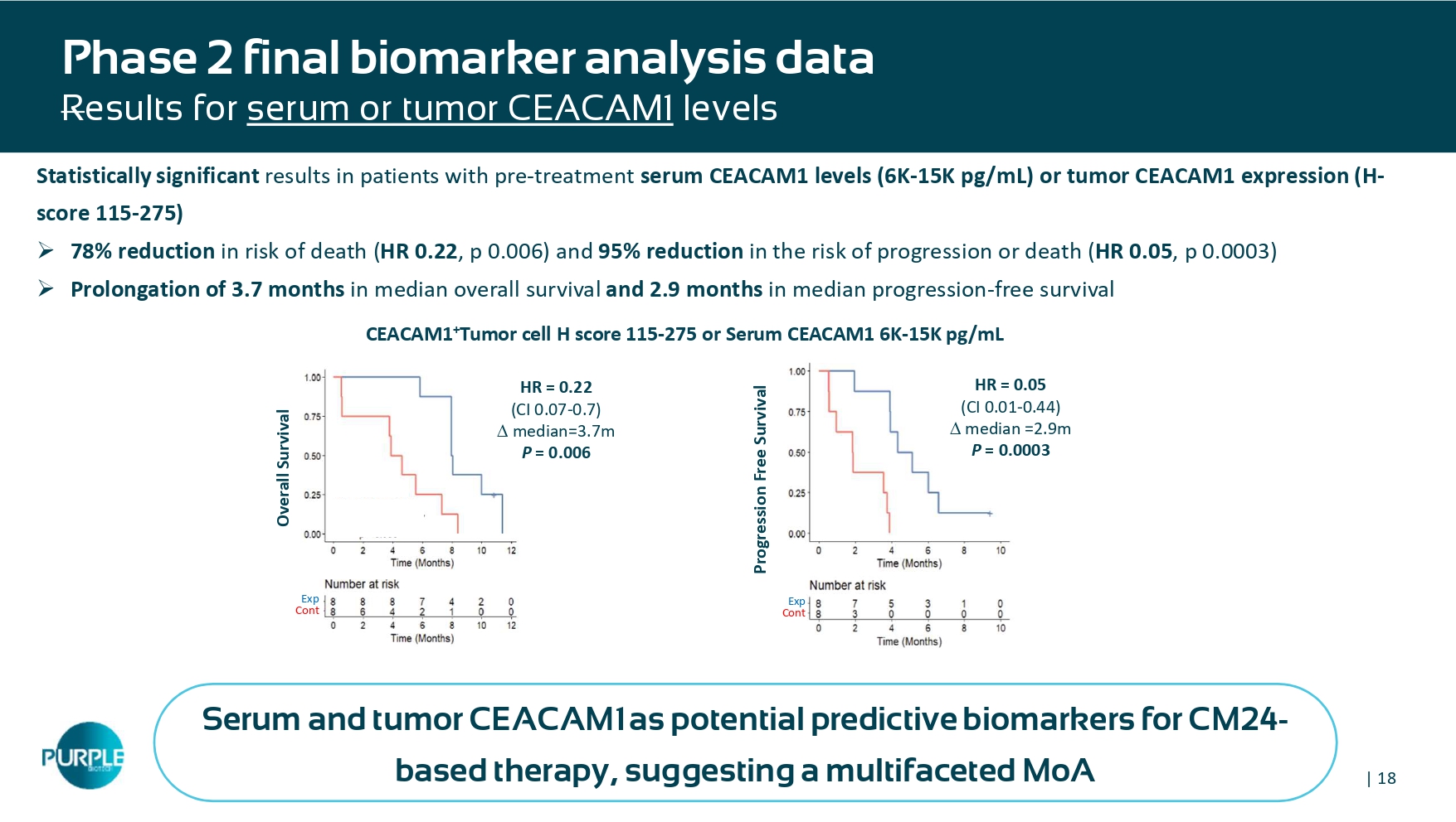 | 17 Phase 2 final biomarker analysis data Results for p re - treatment serum CEACAM1 Statistically significant results in patients with pre - treatment serum CEACAM1 level between 6K to 15K : » 79 % reduction in the risk of death ( HR = 0. 21 ) and > 90 % reduction in the risk of progression or death ( HR < 0.1 ) » Prolongation of 5 .1 months in median overall survival and 2 .9 months in median progression - free survival HR < 0.1 Median = 4.7 vs 1.8 =2.9 months P = 0.003 Progression free survival Overall Survival Overall Survival (%) PFS (%) EXP CONT EXP CONT OS (%) HR = 0.21 Median = 9 vs 3.9 =5.1 months P = 0.04 Pre - treatment serum CEACAM1 level is a potential serum biomarker for CM24 - based therapy | 18 Phase 2 final biomarker analysis data R esults for serum or tumor CEACAM1 levels Statistically significant results in patients with pre - treatment serum CEACAM1 levels (6K - 15K pg /mL) or tumor CEACAM1 expression (H - score 115 - 275) » 78 % reduction in risk of death ( HR 0.