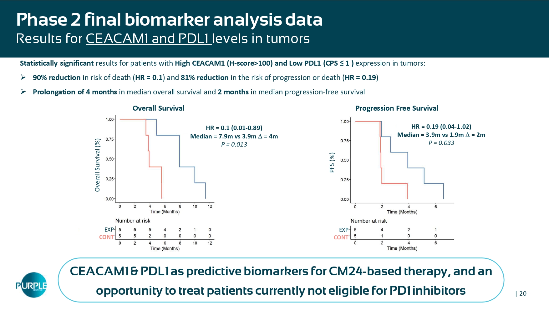 22 , p 0.006) and 95 % reduction in the risk of progression or death ( HR 0.05 , p 0.0003 ) » Prolongation of 3.7 months in median overall survival and 2 .9 months in median progression - free survival CEACAM1 + Tumor cell H score 115 - 275 or Serum CEACAM1 6K - 15K pg /mL Overall Survival HR = 0.22 (CI 0.07 - 0.7) median=3.7m P = 0.006 Exp Cont Progression Free Survival HR = 0.05 (CI 0.01 - 0.44) median =2.9m P = 0.0003 Exp Cont Serum and tumor CEACAM1 as potential predictive biomarkers for CM24 - based therapy, suggesting a multifaceted MoAYL0 | 19 Phase 2 final biomarker analysis Results for pre - treatment serum CEACAM1 or NET marker MPO levels Statistically significant results in patients with defined pre - treatment serum CEACAM1 or MPO levels in 80% of patients in the study : » 61 % reduction in risk of death ( HR = 0.