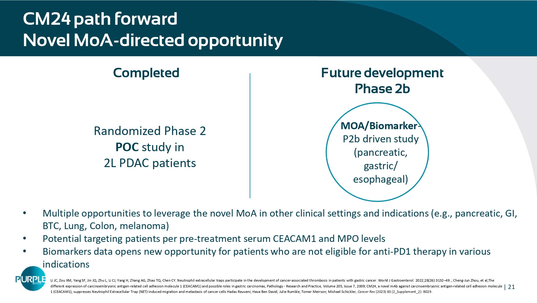 1 ) and 81 % reduction in the risk of progression or death ( HR = 0.19 ) » Prolongation of 4 months in median overall survival and 2 months in median progression - free survival Phase 2 final biomarker analysis data Results for CEACAM1 and PDL1 levels in tumors EXP CONT HR = 0.19 (0.04 - 1.02) Median = 3.9m vs 1.9m = 2m P = 0.033 PFS (%) EXP CONT Progression Free Survival Overall Survival CEACAM1 & PDL1 as predictive biomarkers for CM24 - based therapy, and an opportunity to treat patients currently not eligible for PD1 inhibitors | 21 CM24 path forward Novel MoA - directed opportunity • Multiple opportunities to leverage the novel MoA in other clinical settings and indications (e.g., pancreatic, GI, BTC, Lung, Colon, melanoma) • Potential targeting patients per pre - treatment serum CEACAM1 and MPO levels • Biomarkers data opens new opportunity for patients who are not eligible for anti - PD1 therapy in various indications Randomized Phase 2 POC study in 2L PDAC patients Completed Future development Phase 2b MOA/Biomarker - P2b driven study ( pancreatic, gastric/ esophageal) Li JC, Zou XM, Yang SF, Jin JQ, Zhu L, Li CJ, Yang H, Zhang AG, Zhao TQ, Chen CY. Neutrophil extracellular traps participate in the development of cancer - associated thrombosis in patients with gastric cancer. World J Gastroenterol. 2022;28(26):3132 – 49..; C heng - Jun Zhou, et al,The different expression of carcinoembryonic antigen - related cell adhesion molecule 1 (CEACAM1) and possible roles in gastric carcin omas, Pathology - Research and Practice, Volume 205, Issue 7, 2009; CM24, a novel mAb against carcinoembryonic antigen - related cell adhesion molecule 1 (CEACAM1), suppresses Neutrophil Extracellular Trap (NET) - induced migration and metastasis of cancer cells Hadas Reuveni; Hava Ben David; Julie Rumble; Tomer Meirson ; Michael Schickler, Cancer Res (2023) 83 (2_Supplement_2): B029.