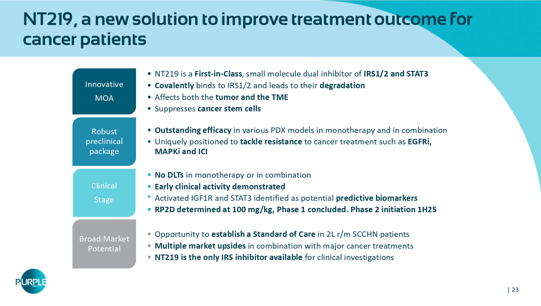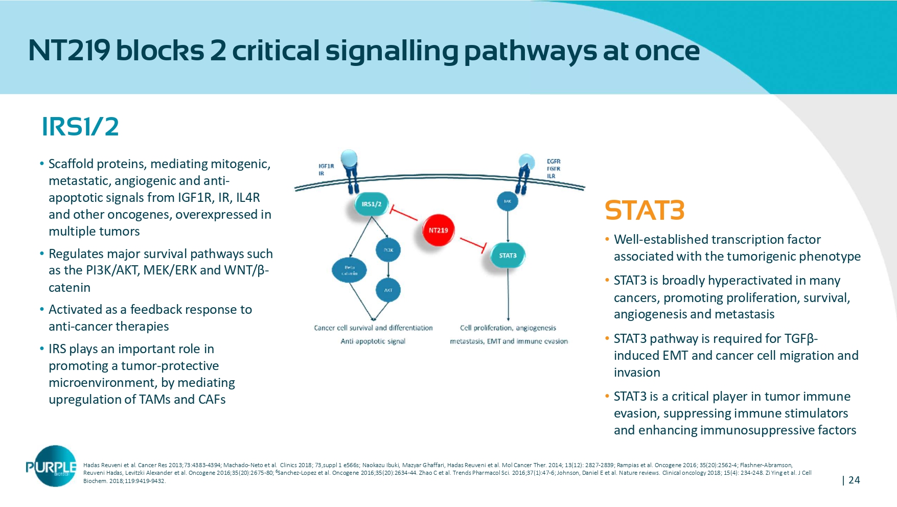 | 23 NT219, a new solution to improve treatment outcome for cancer patients • NT219 is a First - in - Class , small molecule dual inhibitor of IRS1/2 and STAT3 • Covalently binds to IRS1/2 and leads to their degradation • Affects both the tumor and the TME • Suppresses cancer stem cells Innovative MOA • Outstanding efficacy in various PDX models in monotherapy and in combination • Uniquely positioned to tackle resistance to cancer treatment such as EGFRi , MAPKi and ICI Robust preclinical package • No DLTs in monotherapy or in combination • Early clinical activity demonstrated • Activated IGF 1 R and STAT 3 identified as potential predictive biomarkers • RP 2 D determined at 100 mg/kg , Phase 1 concluded.