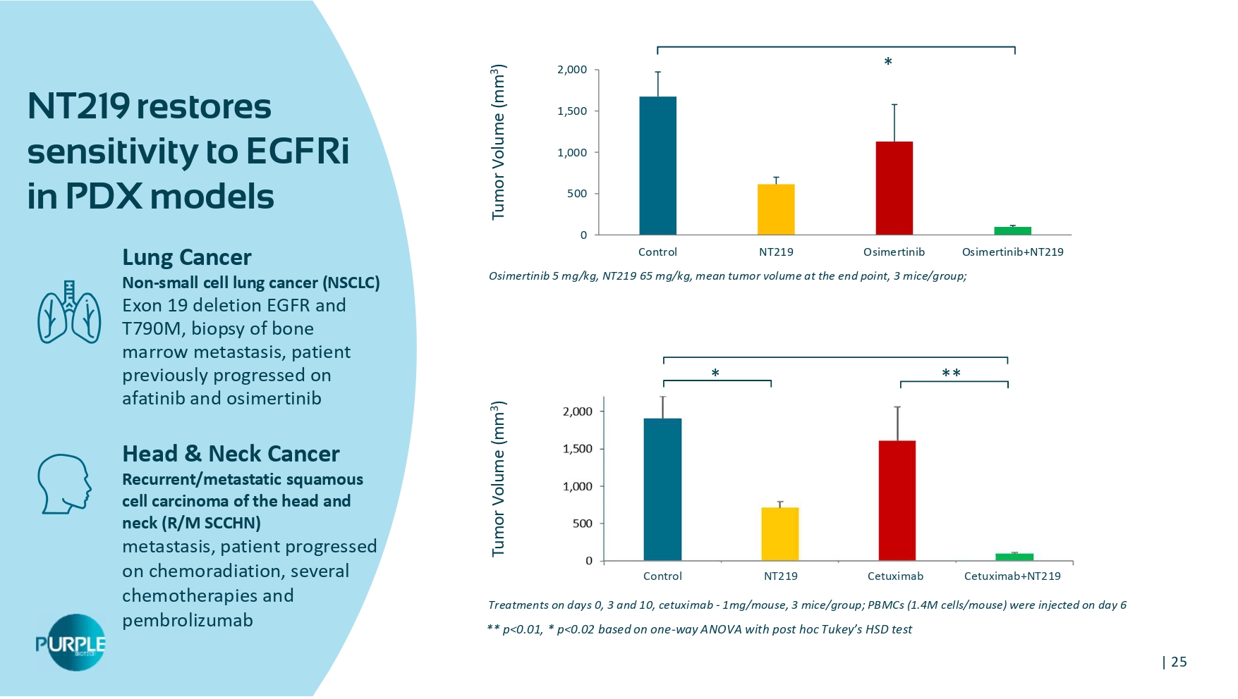 Phase 2 initiation 1 H 25 Clinical Stage • Opportunity to establish a Standard of Care in 2L r/m SCCHN patients • Multiple market upsides in combination with major cancer treatments • NT219 is the only IRS inhibitor available for clinical investigations Broad Market Potential YL0 | 24 NT219 blocks 2 critical signalling pathways at once IRS1/2 • Scaffold proteins, mediating mitogenic, metastatic, angiogenic and anti - apoptotic signals from IGF1R, IR, IL4R and other oncogenes, overexpressed in multiple tumors • Regulates major survival pathways such as the PI3K/AKT, MEK/ERK and WNT/ β - catenin • Activated as a feedback response to anti - cancer therapies • IRS plays an important role in promoting a tumor - protective microenvironment, by mediating upregulation of TAMs and CAFs STAT 3 • Well - established transcription factor associated with the tumorigenic phenotype • STAT3 is broadly hyperactivated in many cancers, promoting proliferation, survival, angiogenesis and metastasis • STAT3 pathway is required for TGFβ - induced EMT and cancer cell migration and invasion • STAT3 is a critical player in tumor immune evasion, suppressing immune stimulators and enhancing immunosuppressive factors Hadas Reuveni et al. Cancer Res 2013;73:4383 - 4394 ; Machado - Neto et al. Clinics 2018; 73,suppl 1 e566s; Naokazu Ibuki , Mazyar Ghaffari , Hadas Reuveni et al. Mol Cancer Ther . 2014; 13(12): 2827 - 2839 ; Rampias et al . Oncogene 2016; 35(20):2562 - 4; Flashner - Abramson, Reuveni Hadas, Levitzki Alexander et al. Oncogene 2016;35(20):2675 - 80 ; 6 Sanchez - Lopez et al. Oncogene 2016;35(20):2634 - 44. Zhao C et al. Trends Pharmacol Sci. 2016;37(1):47 - 6; Johnson, Daniel E et al. Nature reviews. Clinical oncology 2018; 15(4): 234 - 248. Zi Ying et al. J Cell Biochem . 2018;119:9419 - 9432.