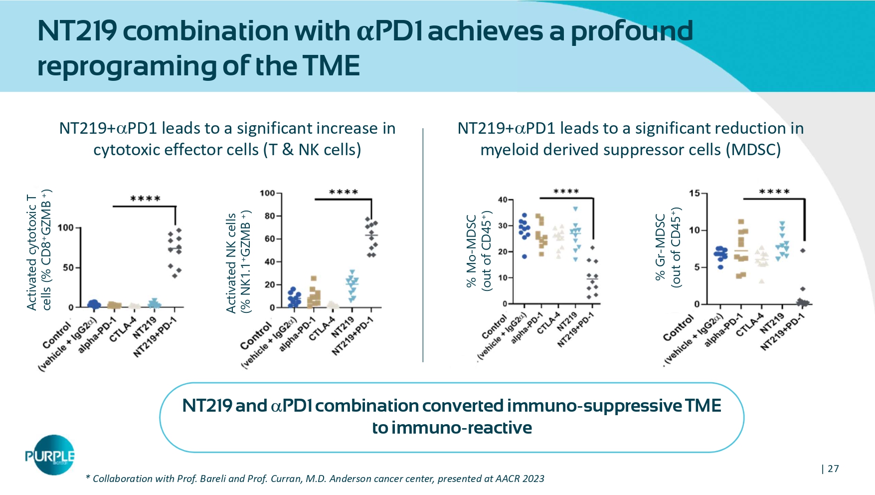 | 27 NT 219 combination with α PD 1 achieves a profound reprograming of the TME NT 219 and PD 1 combination converted immuno - suppressive TME to immuno - reactive * Collaboration with Prof. Bareli and Prof. Curran, M.D. Anderson cancer center, presented at AACR 2023 Activated cytotoxic T cells (% CD8 + GZMB + ) Activated NK cells (% NK 1.1 + GZMB + ) NT219+ PD1 leads to a significant increase in cytotoxic effector cells (T & NK cells) NT219+ PD1 leads to a significant reduction in myeloid derived suppressor cells (MDSC) % Mo - MDSC (out of CD45 + ) % Gr - MDSC (out of CD 45 + )