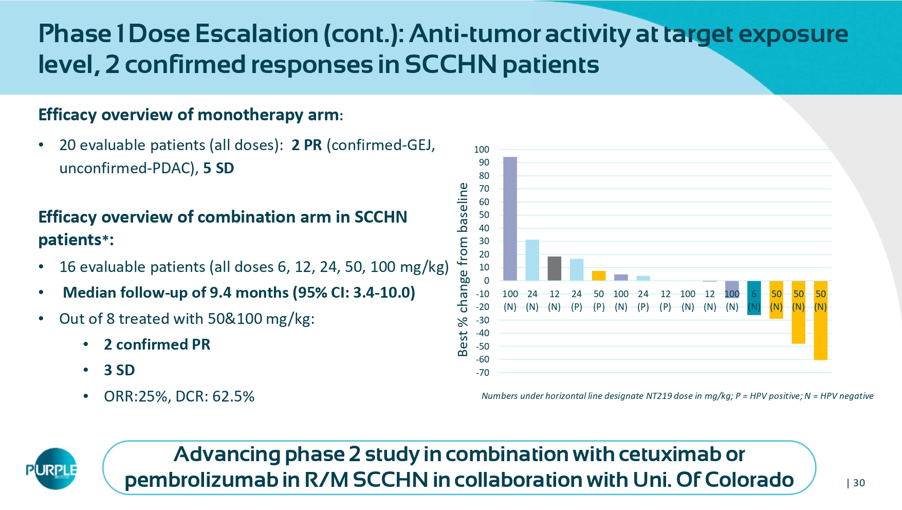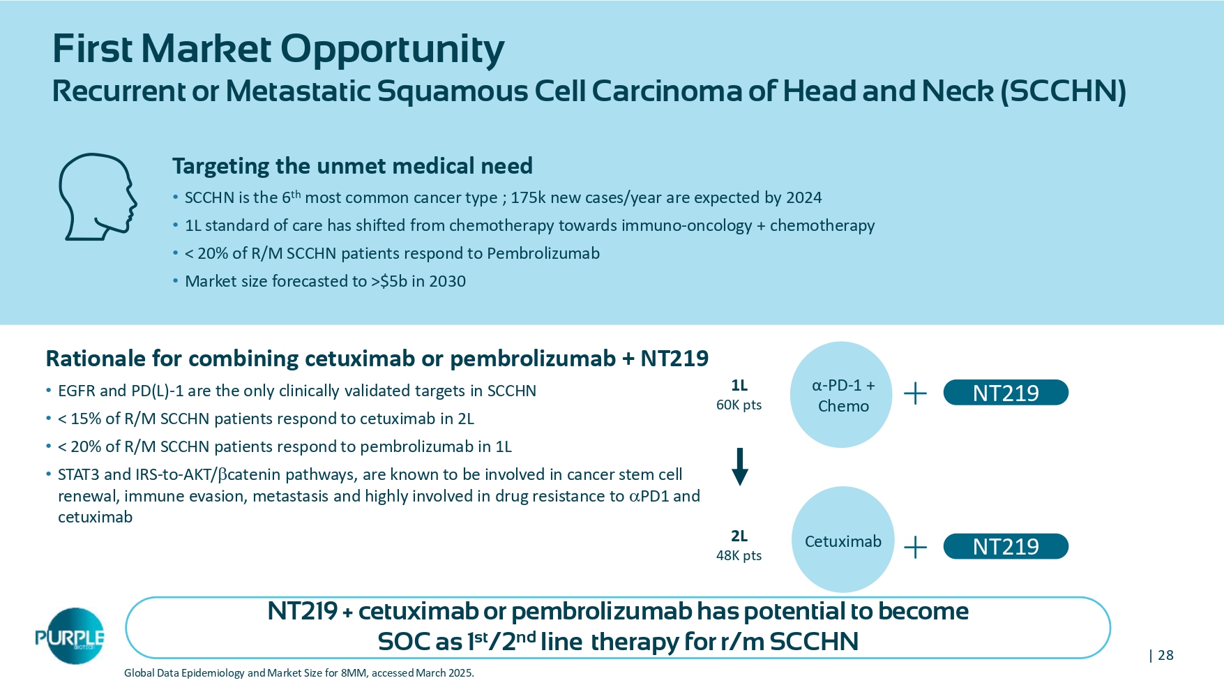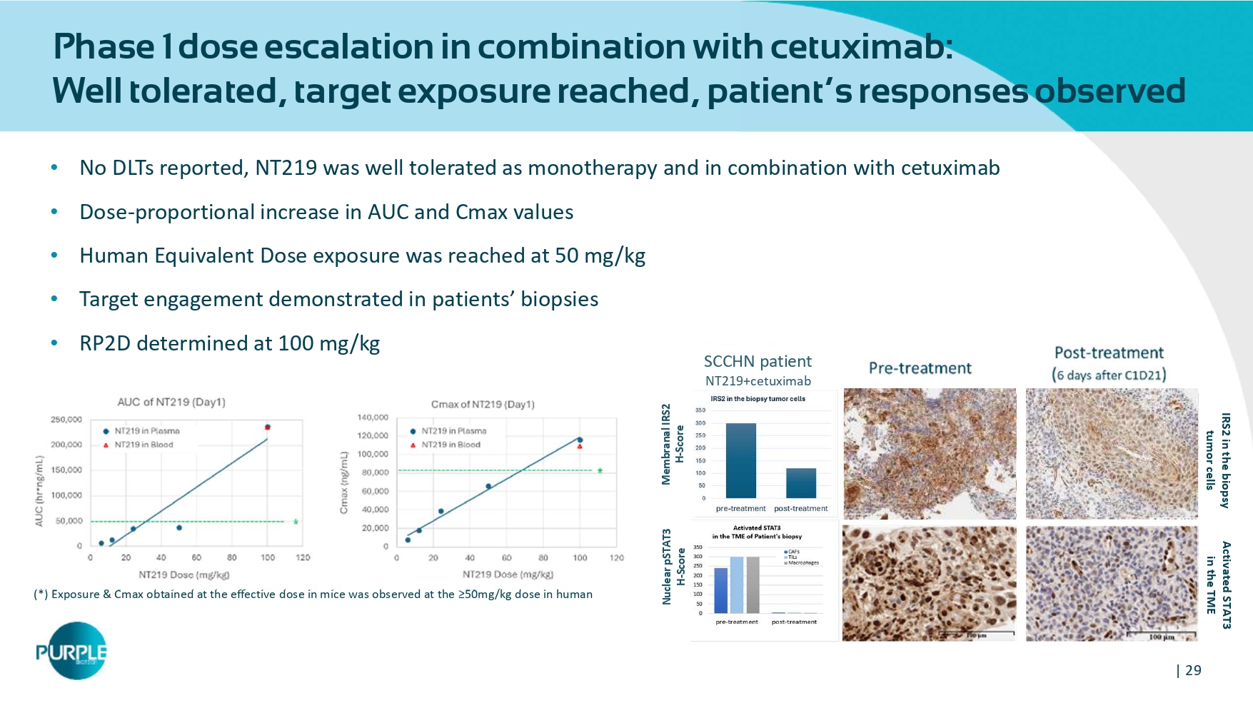 | 28 First Market Opportunity Recurrent or Metastatic Squamous Cell Carcinoma of Head and Neck (SCCHN) Global Data Epidemiology and Market Size for 8MM, accessed March 2025. Rationale for combining cetuximab or pembrolizumab + NT 219 • EGFR and PD(L) - 1 are the only clinically validated targets in SCCHN • < 15 % of R/M SCCHN patients respond to cetuximab in 2 L • < 20 % of R/M SCCHN patients respond to pembrolizumab in 1 L • STAT 3 and IRS - to - AKT/ catenin pathways, are known to be involved in cancer stem cell renewal, immune evasion, metastasis and highly involved in drug resistance to PD 1 and cetuximab Targeting the unmet medical need • SCCHN is the 6 th most common cancer type ; 175k new cases/year are expected by 2024 • 1L standard of care has shifted from chemotherapy towards immuno - oncology + chemotherapy • < 20% of R/M SCCHN patients respond to Pembrolizumab • Market size forecasted to >$5b in 2030 α - PD - 1 + Chemo 1L 60K pts Cetuximab 2 L 48 K pts NT219 NT219 + cetuximab or pembrolizumab has potential to become SOC as 1 st /2 nd line therapy for r/m SCCHN NT 219 | 29 Phase 1 dose escalation in combination with cetuximab: Well tolerated, target exposure reached, patient ’ s responses observed • No DLTs reported, NT 219 was well tolerated as monotherapy and in combination with cetuximab • Dose - proportional increase in AUC and Cmax values • Human Equivalent Dose exposure was reached at 50 mg/kg • Target engagement demonstrated in patients’ biopsies • RP 2 D determined at 100 mg/kg (*) Exposure & Cmax obtained at the effective dose in mice was observed at the ≥ 50 mg/kg dose in human IRS 2 in the biopsy tumor cells Activated STAT3 in the TME Nuclear pSTAT3 H - Score H - Score Nuclear pSTAT 3 H - Score Membranal IRS2 H - Score SCCHN patient NT 219 +cetuximab