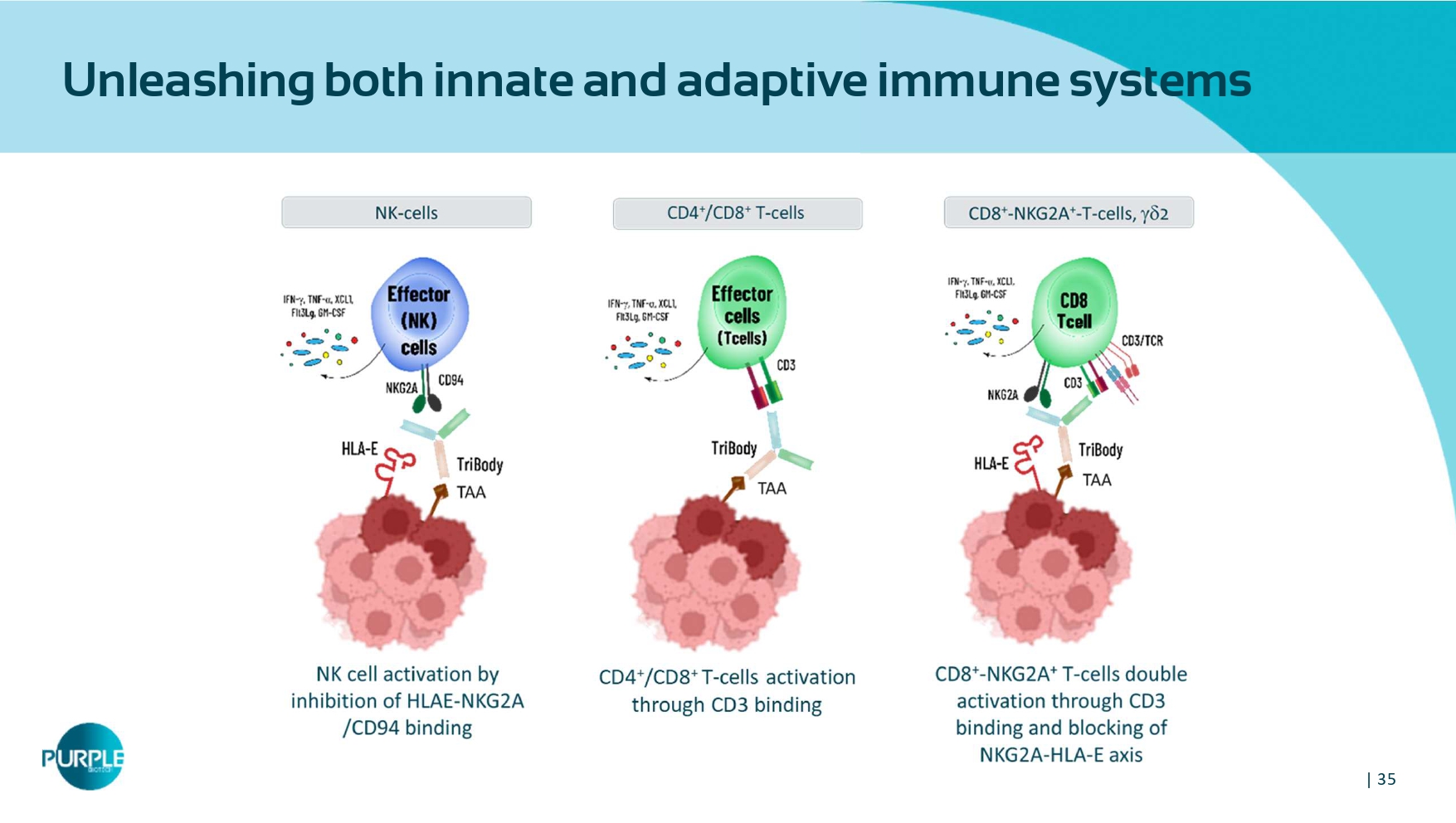 | 33 CAPTN - 3 Platform A novel mechanism of action tri - specific antibody • Multi - specific biologics is an expanding class of drugs getting a lot of interest in the industry • After initial success in hemato - oncology, new formats are being investigated in solid tumors • Platform displays several distinctive features: • Dual engagement of T cells and NK cells to mount an optimal anti - tumoral immune response • A tumor - restricted activation through a cleavable capping system designed to provide a wide therapeutic index • Plug & Play - Carefully selected Tumor Associated Antigens (TAAs) allowing patient - centric development. portfolio includes several assets, targeting different receptors and TAA Engagement Activated in TME Masked pre - form Cancer binder a - TAA Abs a - NK binder Abs T - cell - binder a - CD 3 Abs aCD3 masking moiety Tumor cell NK cell Cancer microenvironment Protease cleavage Removal of T cell engager ’ s masking by proteases of the tumor microenvironment T and NK Cell activation restricted to selected tumors T cell 34 CAPTN - 3 platform technology a dvantages CAP / cleavage site: ▪ Safety: Activation only in the TME ▪ Efficacy: better PK Human Serum Albumin (HSA) ▪ Improved stability in blood circulation CD 3 arm: ▪ T cell engager ▪ T cell activation Efficient anti - tumor effect NK cell arm: ▪ NK cell engager ▪ Checkpoint inhibitor E nhancement of immune response TAA arm: ▪ Tumor Associated Antigen T argeted activation against tumor cells All in one: ▪ Proximity – increased local concentration ▪ Synergistic effect ▪ Molecule size similar to mAb (~ 170 kDa ) anti - TAA anti - NK
