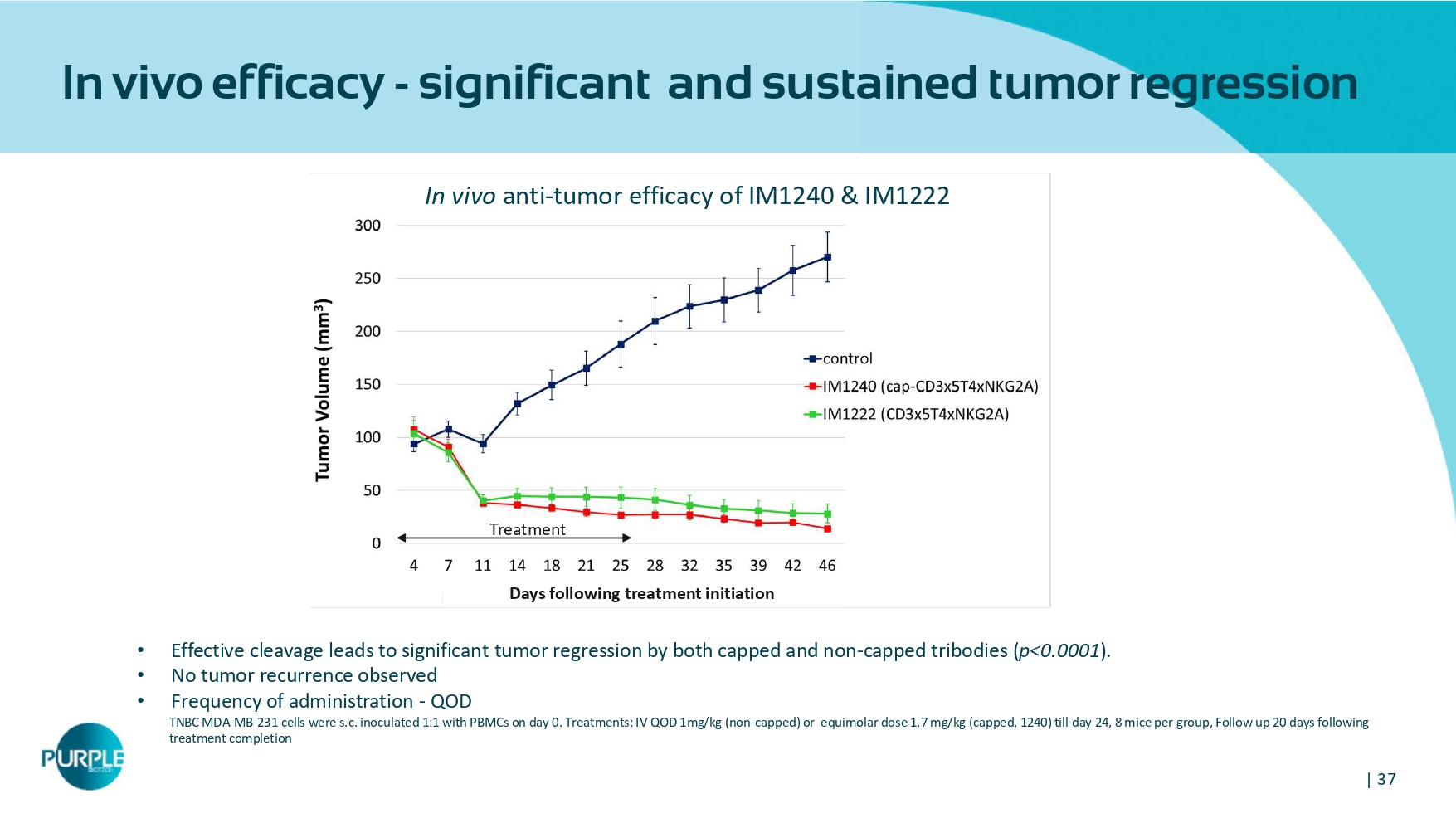 | 35 Unleashing both innate and adaptive immune systems | 36 5 38 49 94 0 20 40 60 80 100 Control IM1242 IM1340 IM1240 cResponse Score CD 3 x 5 T 4 x NKG 2 A (cleavable cap) IM 1240 5 T 4 xNKG 2 A (non - cleavable) capped CD 3 ) 5 T 4 xCD 3 (cleavable cap; mutated NKG 2 A) • Synergistic effect of the CD 3 and NKG 2 A arms in suppressing 5 T 4 + NCSLC Patient - Derived E xplant (PDE)* at 10 nM concentration * Ex vivo patient - derived tumor explants (PDE) involve the culture of resected tumor fragments that retain the TME native archit ecture and immune cell array, tumor heterogeneity and the proliferative capacity (Golan 2023, Powley 2020). Fresh NSCLC patient - derived biopsy was cultured as 250um slices, treated for 96hr, fixed, and H&E slides were blindly scored for response based on cell viability and damage to the cancerous tissue according to pathological criteria. A scale of 0 – 100 was created with a score of 0 representing completely viable cancer tissue and a score of 100 representing no viable cancer cells. The analysis included functional (cell death) score of response (cResponse) using propri eta ry artificial intelligence (AI) algorithm (Curesponse). • Tribody induces cytotoxicity at pM EC 50 against NSCLC A 549 cells • Up to 20 - fold more potent than the bi - specific CD 3 x 5 T 4 • Cell killing validated on multiple 5 T 4 + cell lines (MDA - MB - 231 , HCT 116 , NCI - H 226 ) CD3x5T4xNKG2A CD 3 x 5 T 4 Increased cytotoxicity with tribody format EC 50 tribody: 0.003 nM EC 50 bispecific: 0.066 nM POC: NKG 2 A arm contributes substantially to tumor cell killing and synergizes with the CD 3 Arm | 37 In vivo efficacy - significant and sustained tumor regression • Effective cleavage leads to significant tumor regression by both capped and non - capped tribodies ( p< 0.0001 ).
