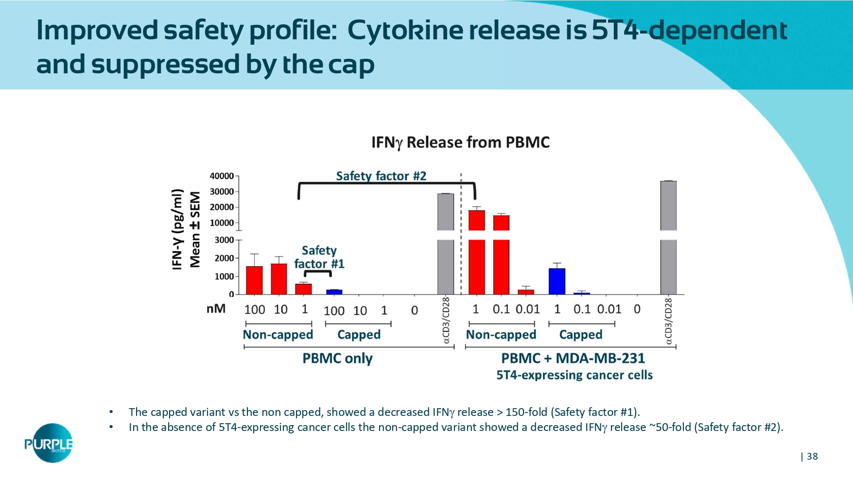 • In the absence of 5 T 4 - expressing cancer cells the non - capped variant showed a decreased IFN release ~ 50 - fold (Safety factor # 2 ).