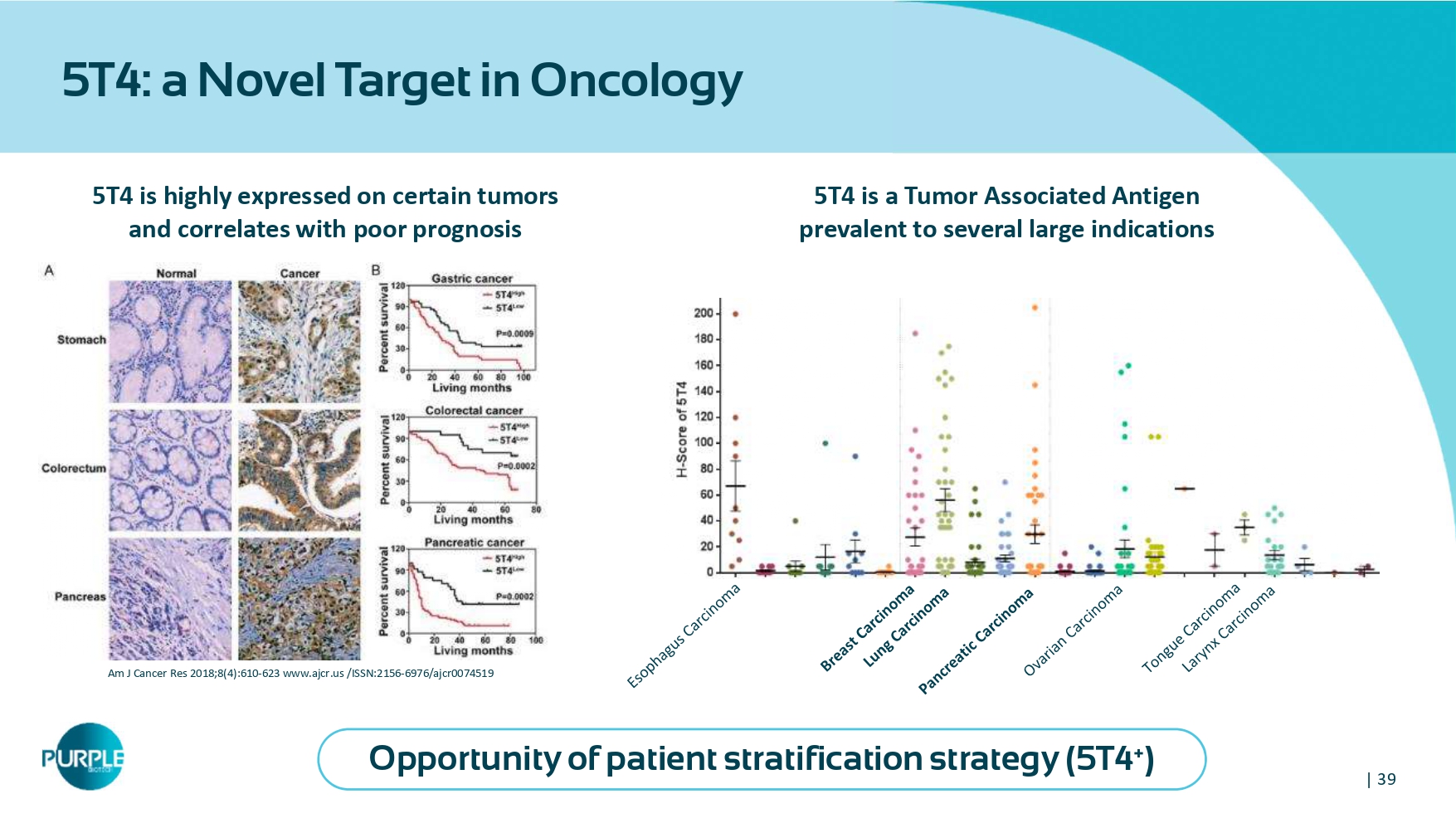 | 39 5T4: a Novel Target in Oncology 5 T 4 is highly expressed on certain tumors and correlates with poor prognosis Am J Cancer Res 2018;8(4):610 - 623 www.ajcr.us /ISSN:2156 - 6976/ajcr0074519 5 T 4 is a Tumor Associated Antigen prevalent to several large indications Opportunity of patient stratification strategy ( 5 T 4 + )
