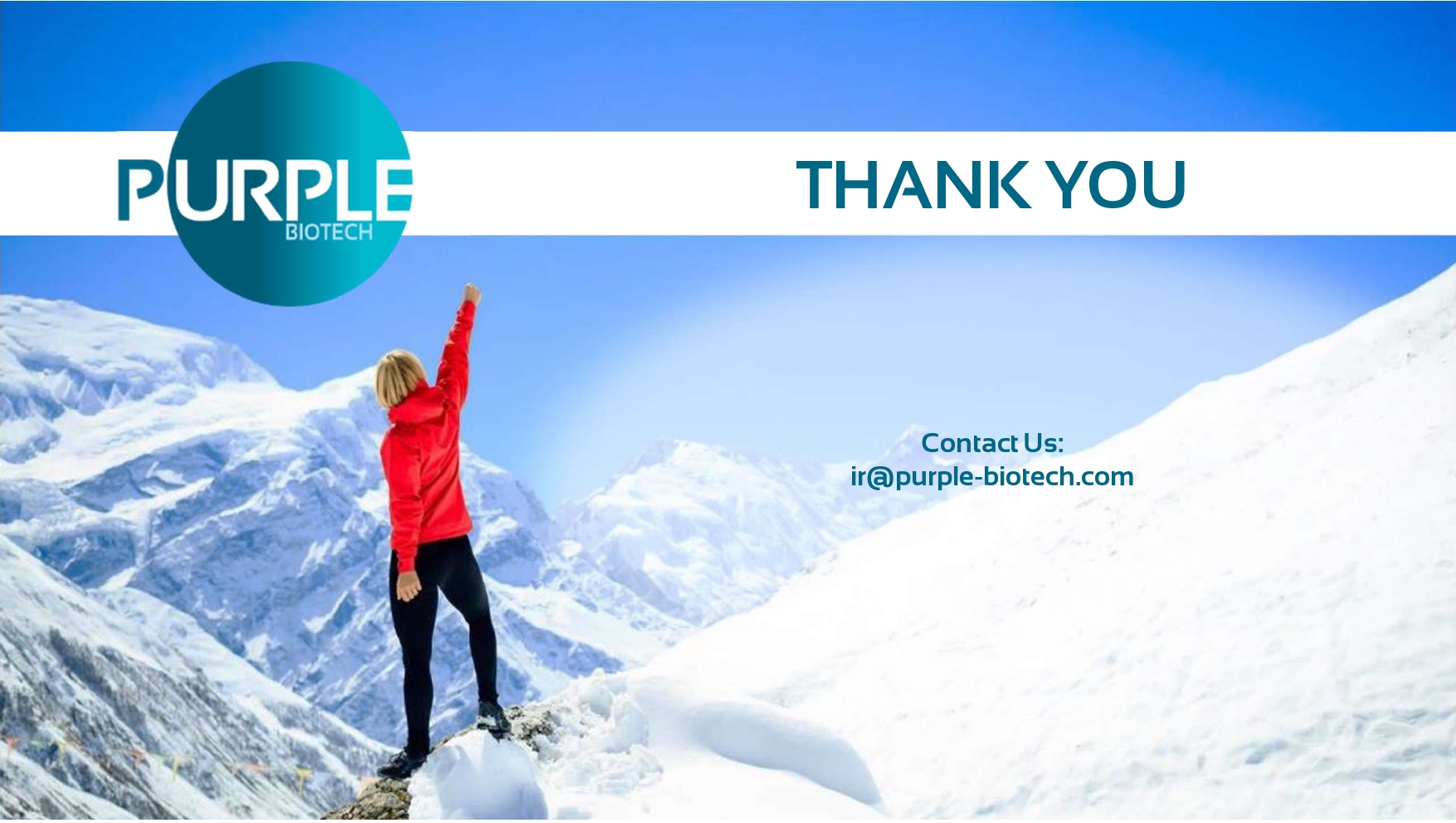 | 40 Corporate highlights Purple Biotech (NASDAQ/TASE: PPBT) As of December 31 , 2024 • ADS Outstanding: 2.6 M • Cash Balance: $ 8.2 M Well positioned to advance next clinical milestones • Two First - in - Class clinical stage drugs • A preclinical tri - specific immuno - engagers platform • Lean & global operation • Cash runway into mid 2026 Purple Biotech identifies promising first - in - class drug candidates to treat cancers with high unmet medical need | 41 Contact Us: ir@purple - biotech.com THANK YOU