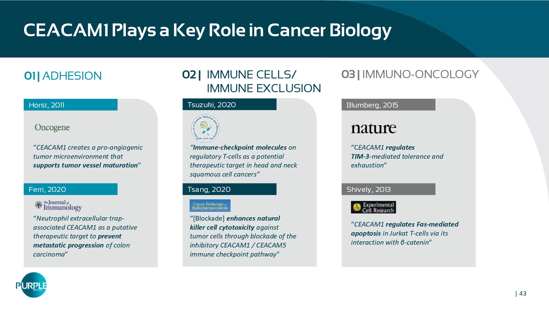 | 43 CEACAM1 Plays a Key Role in Cancer Biology 01 | ADHESION Horst, 2011 “ CEACAM 1 creates a pro - angiogenic tumor microenvironment that supports tumor vessel maturation ” “ Neutrophil extracellular trap - associated CEACAM 1 as a putative therapeutic target to prevent metastatic progression of colon carcinoma ” Ferri , 2020 Tsuzuki, 2020 Tsang, 2020 Blumberg, 2015 “ C EACAM 1 regulates TIM - 3 - mediated tolerance and exhaustion ” “ CEACAM1 regulates Fas - mediated apoptosis in Jurkat T - cells via its interaction with β - catenin ” Shively, 2013 02 | IMMUNE CELLS/ IMMUNE EXCLUSION 03 | IMMUNO - ONCOLOGY “ Immune-checkpoint molecules on regulatory T-cells as a potential therapeutic target in head and neck squamous cell cancers” “ [Blockade] enhances natural killer cell cytotoxicity against tumor cells through blockade of the inhibitory CEACAM 1 / CEACAM 5 immune checkpoint pathway ”