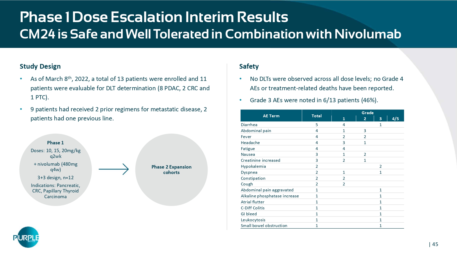 | 44 CM 24 Reduces Tumor Burden & Synergetic with α - PD - 1 Xenograft, lung lesion melanoma model (Mel 526 , IV), 7 mice/group (NOD/SCID), 4 TIL injections IV, every 10 days, Ab Dose: 10 mg/kg, Ab Regimen: twice a week, study duration 70 days (last treatment day – 44 ), tumor burden was monitored 26 days post last CM 24 treatment Significant benefits as both single agent and in combination with α - PD - 1 | 45 Phase 1 Dose Escalation Interim Results CM24 is Safe and Well Tolerated in Combi na tion with Nivolumab Grade Total AE Term 4/5 3 2 1 1 4 5 Diarrhea 3 1 4 Abdominal pain 2 2 4 Fever 1 3 4 Headache 4 4 Fatigue 2 1 3 Nausea 1 2 3 Creatinine increased 2 2 Hypokalemia 1 1 2 Dyspnea 2 2 Constipation 2 2 Cough 1 1 Abdominal pain aggravated 1 1 Alkaline phosphatase increase 1 1 Atrial flutter 1 1 C - Diff Colitis 1 1 GI bleed 1 1 Leukocytosis 1 1 Small bowel obstruction Study Design • As of March 8 th , 2022, a total of 13 patients were enrolled and 11 patients were evaluable for DLT determination (8 PDAC, 2 CRC and 1 PTC). • 9 patients had received 2 prior regimens for metastatic disease, 2 patients had one previous line. Phase 1 Doses: 10, 15, 20mg/kg q2wk + nivolumab (480mg q4w) 3+3 design, n=12 Indications: Pancreatic, CRC, Papillary Thyroid Carcinoma Phase 2 Expansion cohorts Safety • No DLTs were observed across all dose levels; no Grade 4 AEs or treatment - related deaths have been reported. • Grade 3 AEs were noted in 6/13 patients (46%).