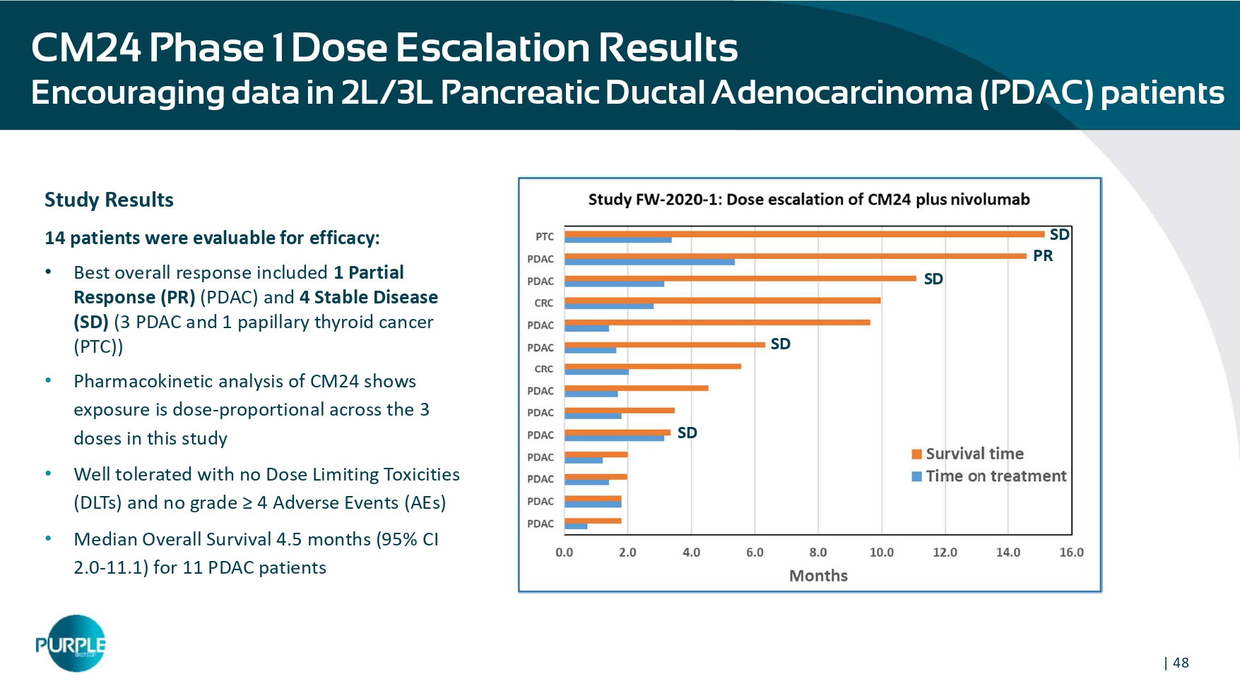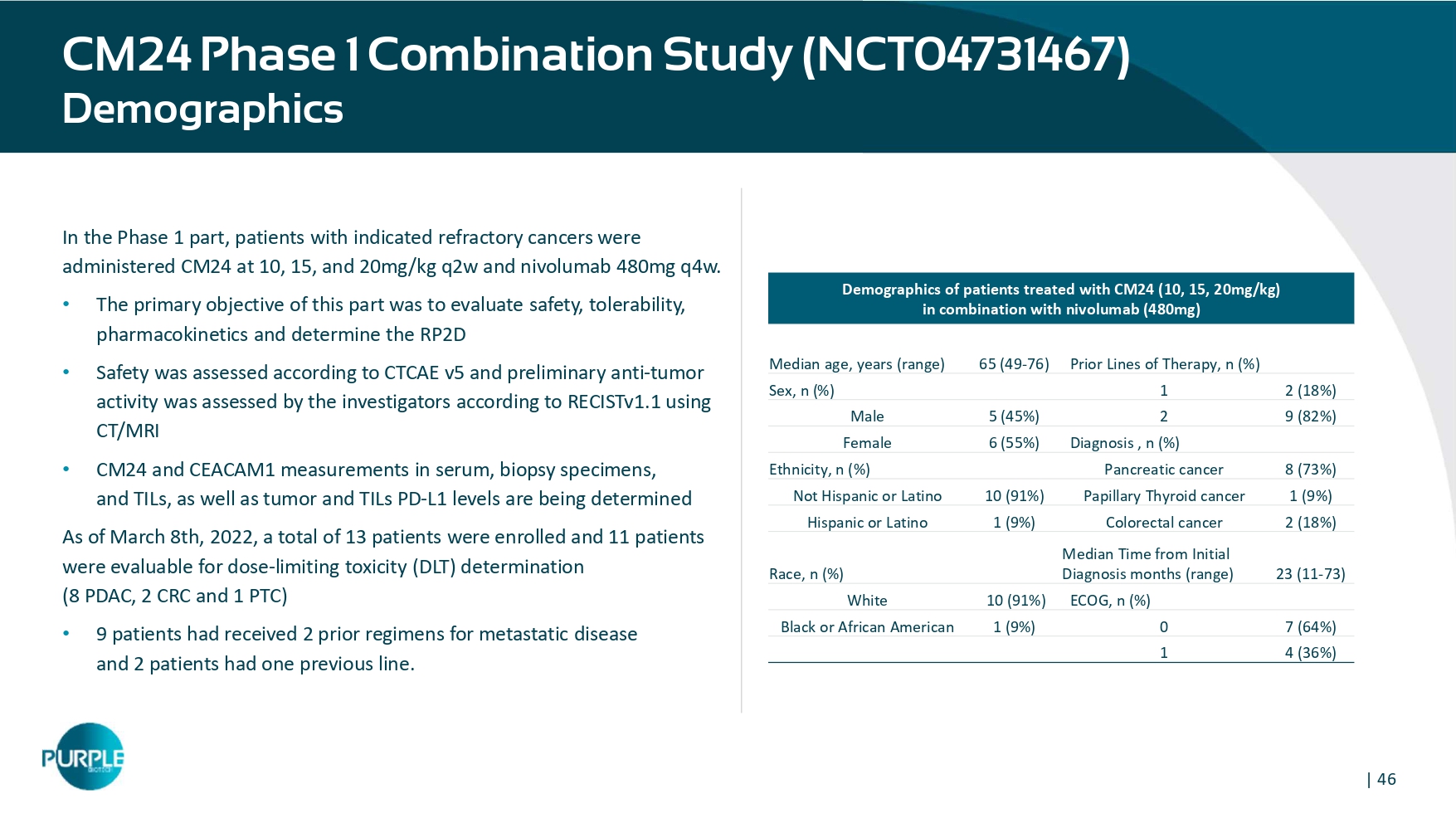 | 46 CM24 Phase 1 Combination Study (NCT04731467) Demographics In the Phase 1 part, patients with indicated refractory cancers were administered CM24 at 10, 15, and 20mg/kg q2w and nivolumab 480mg q4w. • The primary objective of this part was to evaluate safety, tolerability, pharmacokinetics and determine the RP2D • Safety was assessed according to CTCAE v5 and preliminary anti - tumor activity was assessed by the investigators according to RECISTv1.1 using CT/MRI • CM24 and CEACAM1 measurements in serum, biopsy specimens, and TILs, as well as tumor and TILs PD - L1 levels are being determined As of March 8th, 2022, a total of 13 patients were enrolled and 11 patients were evaluable for dose - limiting toxicity (DLT) determination (8 PDAC, 2 CRC and 1 PTC) • 9 patients had received 2 prior regimens for metastatic disease and 2 patients had one previous line. Demographics of patients treated with CM24 (10, 15, 20mg/kg) in combination with nivolumab (480mg) Prior Lines of Therapy, n (%) 65 (49 - 76) Median age, years (range) 2 (18 % ) 1 Sex, n (%) 9 (82 % ) 2 5 (45 % ) Male Diagnosis , n (%) 6 (55 % ) Female 8 ( 7 3 % ) Pancreatic cancer Ethnicity, n (%) 1 (9 % ) Papillary Thyroid cancer 10 (91 % ) Not Hispanic or Latino 2 (18 % ) Colorectal cancer 1 (9 % ) Hispanic or Latino 2 3 (11 - 73) Median Time from Initial Diagnosis months (range) Race, n (%) ECOG, n (%) 10 ( 9 1 % ) White 7 ( 64 %) 0 1 (9 % ) Black or African American 4 ( 36 %) 1 | 47 Confirmed Partial Response in a 3L PDAC Patient Patient Profile • 65 y/o female, pancreatic cancer • 2 prior lines of treatments: FOLFIRINOX and gemcitabine/nab - paclitaxel • Post Whipple Procedure • Patient had a germline NF1 VUS, with MSI - S and PDL - 1 IHC 2+ and 5% staining • Confirmed Partial Response: a fter initial treatment, the patient had a Partial Response of 40%, with a definite reduction of the para - tracheal adenopathy and liver lesions and 58% reduction in CA19 - 9 levels • Under treatment for 6 months, still under monitoring.