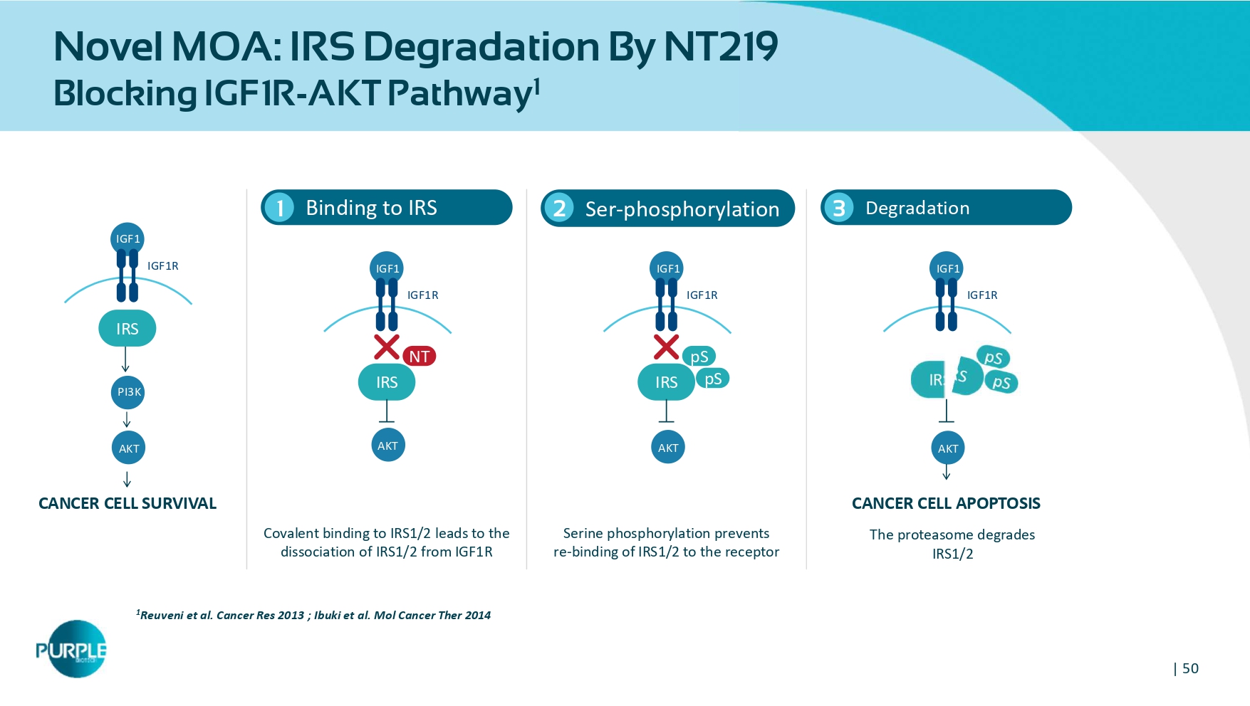 655 681 283 SCREENING FIRST VISIT - PREDOSE 2 MONTH VISIT - PREDOSE CA - 19 - 9 Levels | 48 CM24 Phase 1 Dose Escalation Results E ncouraging data in 2L/3L Pancreatic Ductal Adenocarcinoma (PDAC) patients Study Results 14 patients were evaluable for efficacy: • Best overall response included 1 Partial Response (PR) (PDAC) and 4 Stable Disease (SD) (3 PDAC and 1 papillary thyroid cancer (PTC)) • Pharmacokinetic analysis of CM24 shows exposure is dose - proportional across the 3 doses in this study • Well tolerated with no Dose Limiting Toxicities (DLTs) and no grade ≥ 4 Adverse Events (AEs) • Median Overall Survival 4.5 months (95% CI 2.0 - 11.1) for 11 PDAC patients PR SD SD SD SD | 50 Novel MOA: IRS Degradation By NT219 Blocking IGF1R - AKT Pathway 1 Binding to IRS 1 1 Reuveni et al.