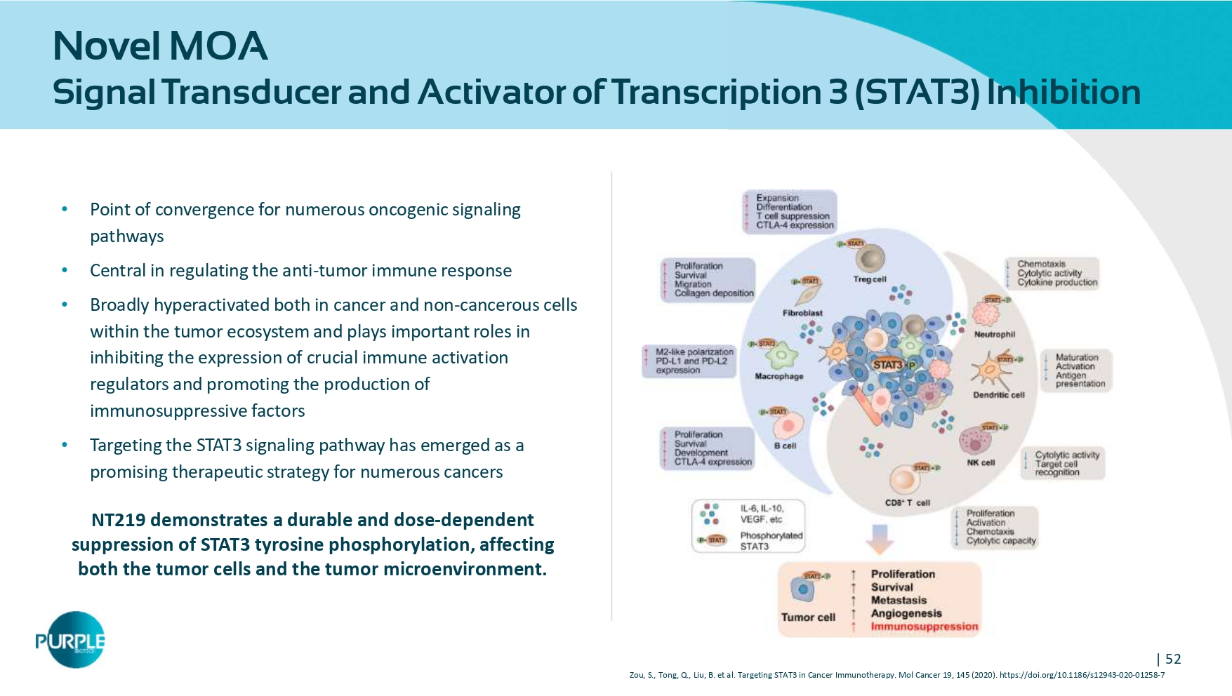 | 52 Novel MOA Signal Transducer and Activator of Transcription 3 ( STAT 3 ) Inhibition • Point of convergence for numerous oncogenic signaling pathways • Central in regulating the anti - tumor immune response • Broadly hyperactivated both in cancer and non - cancerous cells within the tumor ecosystem and plays important roles in inhibiting the expression of crucial immune activation regulators and promoting the production of immunosuppressive factors • Targeting the STAT 3 signaling pathway has emerged as a promising therapeutic strategy for numerous cancers NT 219 demonstrates a durable and dose - dependent suppression of STAT 3 tyrosine phosphorylation, affecting both the tumor cells and the tumor microenvironment. Zou, S., Tong, Q., Liu, B. et al. Targeting STAT 3 in Cancer Immunotherapy. Mol Cancer 19 , 145 ( 2020 ).