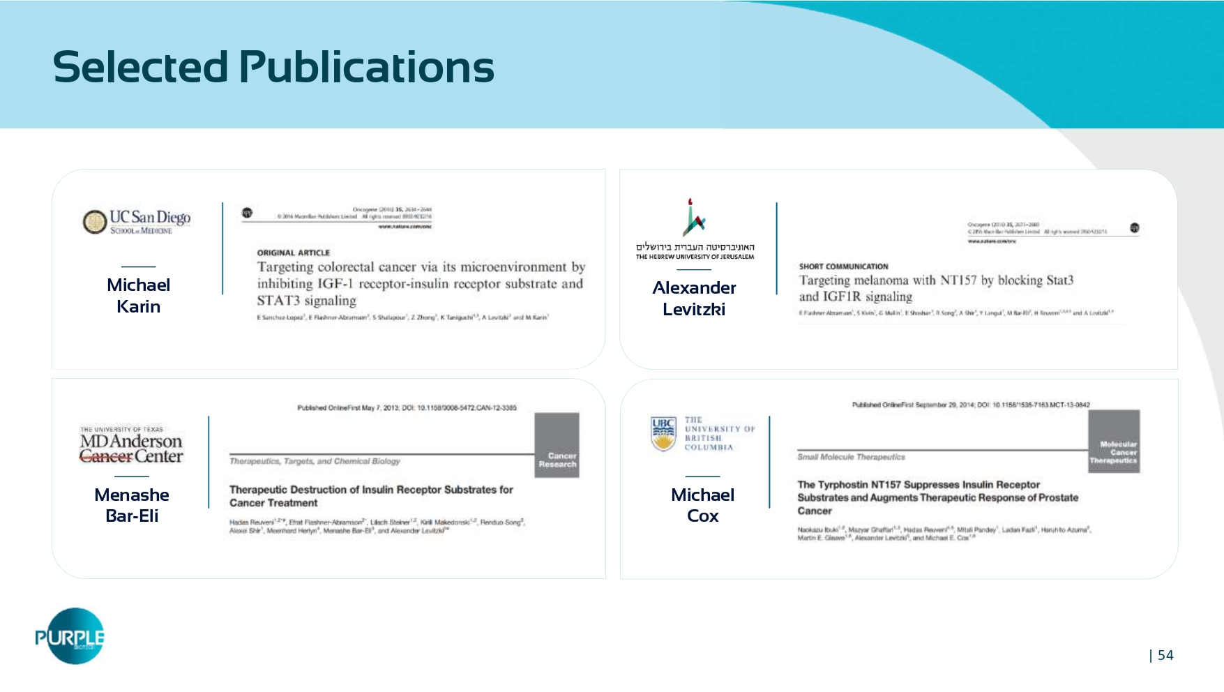 https://doi.org/ 10.1186 /s 12943 - 020 - 01258 - 7 | 53 Simultaneous Blockade of STAT 3 and AKT Pathways are Required to Overcome Resistance to EGFRi Overcoming drug resistance NT 219 NT 219 STAT 3 IRS EGFR EGFRi MEK / ERK TUMOR REGRESSION Proof of Concept: PDX model of Head and Neck Cancer Erlotinib+Ruxolitinib (n= 6 ) Erlotinib+Buparlisib (n= 6 ) Control (n= 6 ) Erlotinib (n= 8 ) Erlotinib+NT 219 (n= 6 ) Erlotinib+Ruxolitinib+Buparlisib (n= 8 ) STAT 3 IRS EGFR MEK Tumor Regression ERK PI 3 K AKT Tumor Survival Tumor Survival Buparlisib Ruxolitinib Erlotinib NT 219 NT 219 JAK By blocking both STAT 3 and IRS resistance pathways, NT 219 re - sensitizes tumors to anti - cancer therapies | 54 Selected Publications Michael Karin Alexander Levitzki Menashe Bar - Eli Michael Cox
