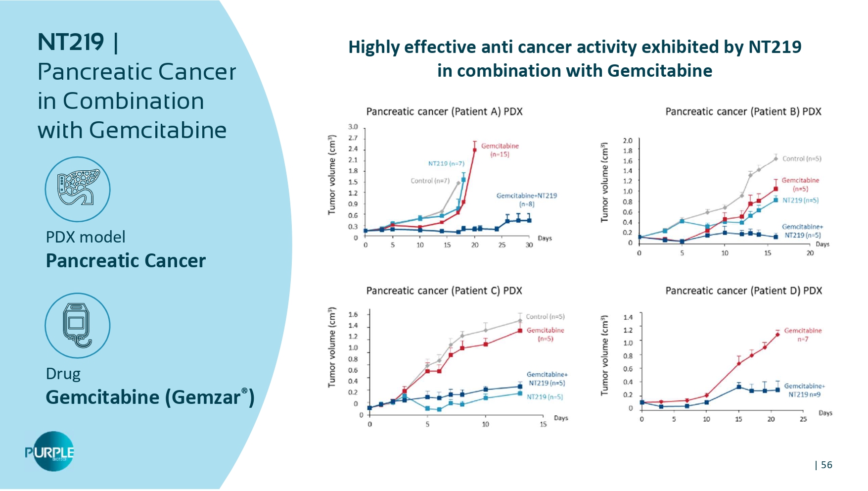 | 56 PDX model Pancreatic Cancer Drug Gemcitabine ( Gemzar ® ) NT 219 | Pancreatic Cancer in Combination with Gemcitabine Highly effective anti cancer activity exhibited by NT 219 in combination with Gemcitabine | 57 PDX model Pancreatic Cancer Drug Gemcitabine ( Gemzar ®) RNA Sequencing | Analysis of Tumors Following Treatment Reduced expression of IRS 1 , Ki 67 , FOXM 1 & TGFb is exhibited by pancreatic cancer treated with NT 219 alone and in combination with gemcitabine
