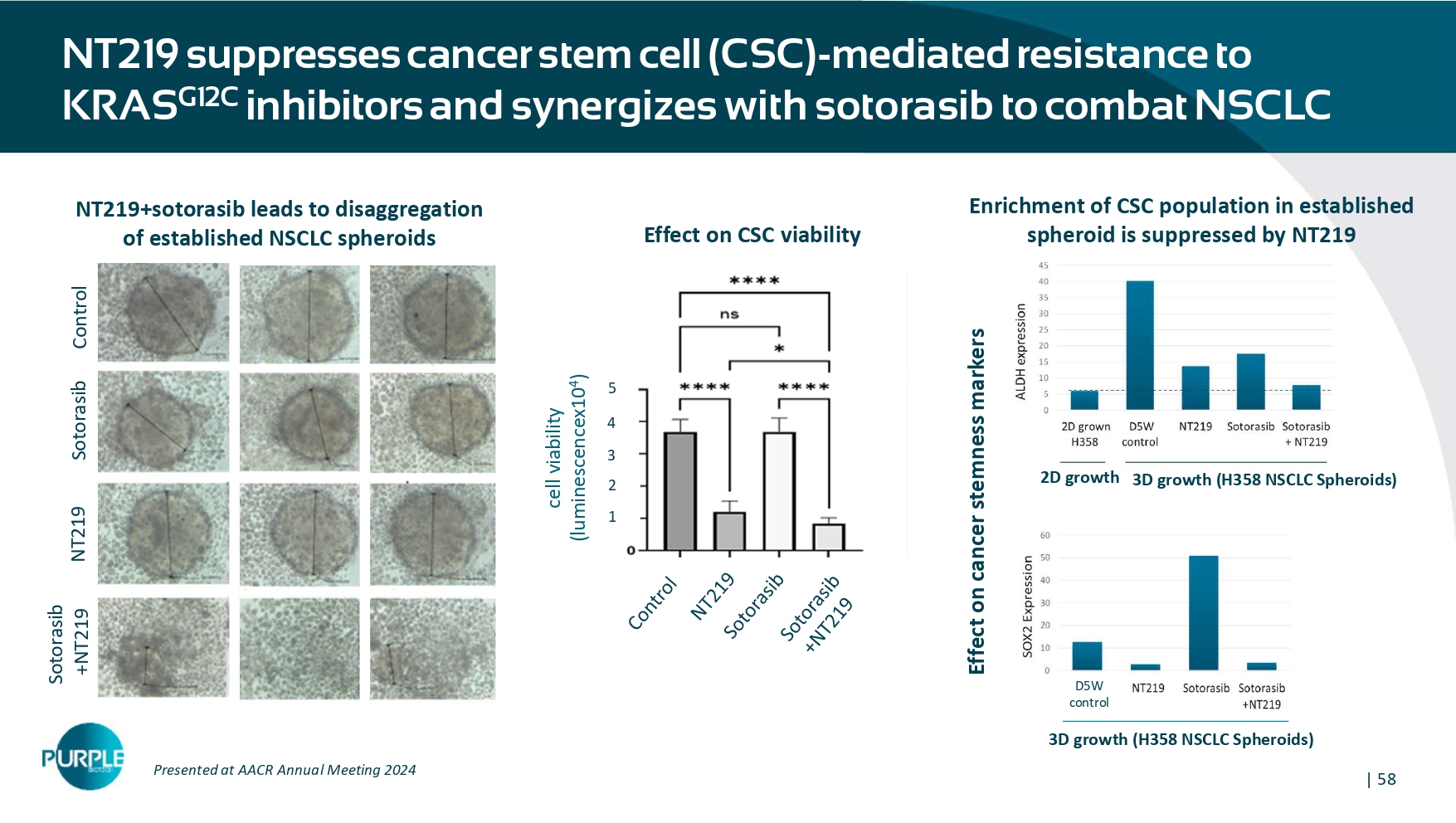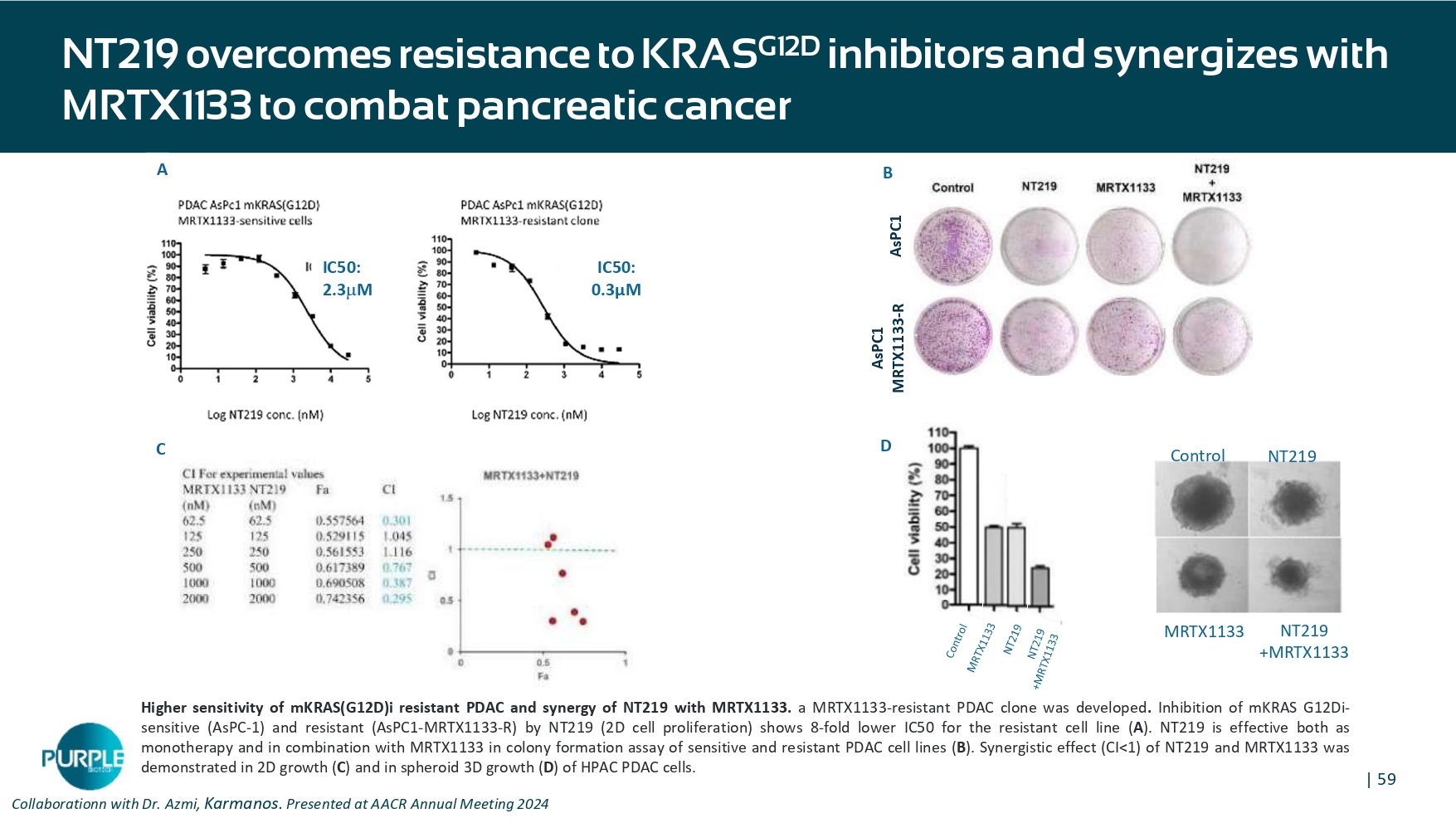 | 58 NT 219 suppresses cancer stem cell (CSC) - mediated resistance to KRAS G 12 C inhibitors and synergizes with sotorasib to combat NSCLC Control NT 219 Sotorasib Sotorasib +NT 219 Effect on CSC viability 5 4 3 2 1 cell viability (luminescencex 10 4 ) 3 D growth (H 358 NSCLC Spheroids) 2 D growth 3 D growth (H 358 NSCLC Spheroids) D 5 W control Effect on cancer stemness markers NT 219 +sotorasib leads to disaggregation of established NSCLC spheroids Presented at AACR Annual Meeting 2024 Enrichment of CSC population in established spheroid is suppressed by NT 219 | 59 NT 219 overcomes resistance to KRAS G 12 D inhibitors and synergizes with MRTX 1133 to combat pancreatic cancer B C D A NT 219 Control MRTX 1133 NT 219 +MRTX 1133 IC 50 : 0.3 µM IC 50 : 2.3 M AsPC 1 AsPC 1 MRTX 1133 - R Collaboration n with Dr. Azmi, Karmanos . Presented at AACR Annual Meeting 2024 Higher sensitivity of mKRAS (G 12 D)i resistant PDAC and synergy of NT 219 with MRTX 1133 . a MRTX 1133 - resistant PDAC clone was developed . Inhibition of m KRAS G 12 Di - sensitive (AsPC - 1 ) and resistant (AsPC 1 - MRTX 1133 - R) by NT 219 ( 2 D cell proliferation) shows 8 - fold lower IC 50 for the resistant cell line ( A ) . NT 219 is effective both as monotherapy and in combination with MRTX 1133 in colony formation assay of sensitive and resistant PDAC cell lines ( B ) . Synergistic effect (CI< 1 ) of NT 219 and MRTX 1133 was demonstrated in 2 D growth ( C ) and in spheroid 3 D growth ( D ) of HPAC PDAC cells .