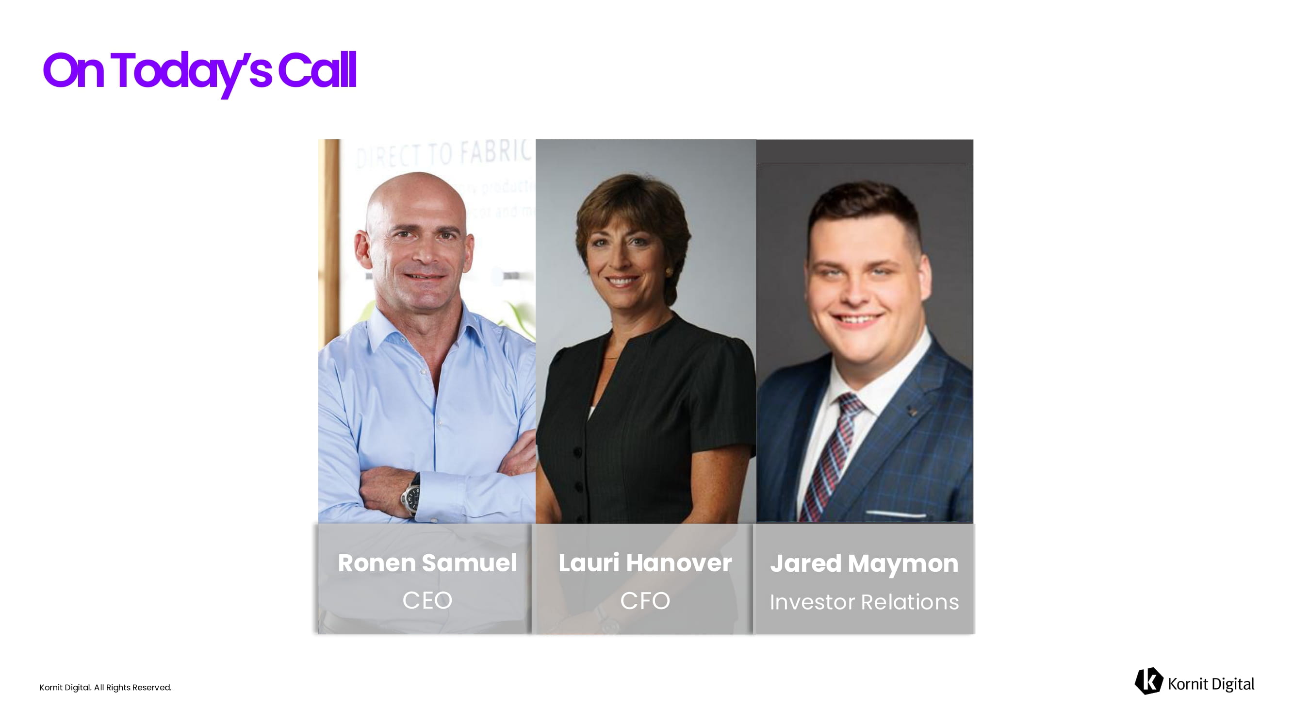 Kornit Digital. All Rights Reserved. On Today’s Call Ronen Samuel CEO Lauri Hanover CFO Jared Maymon Investor Relations Kornit Digital.