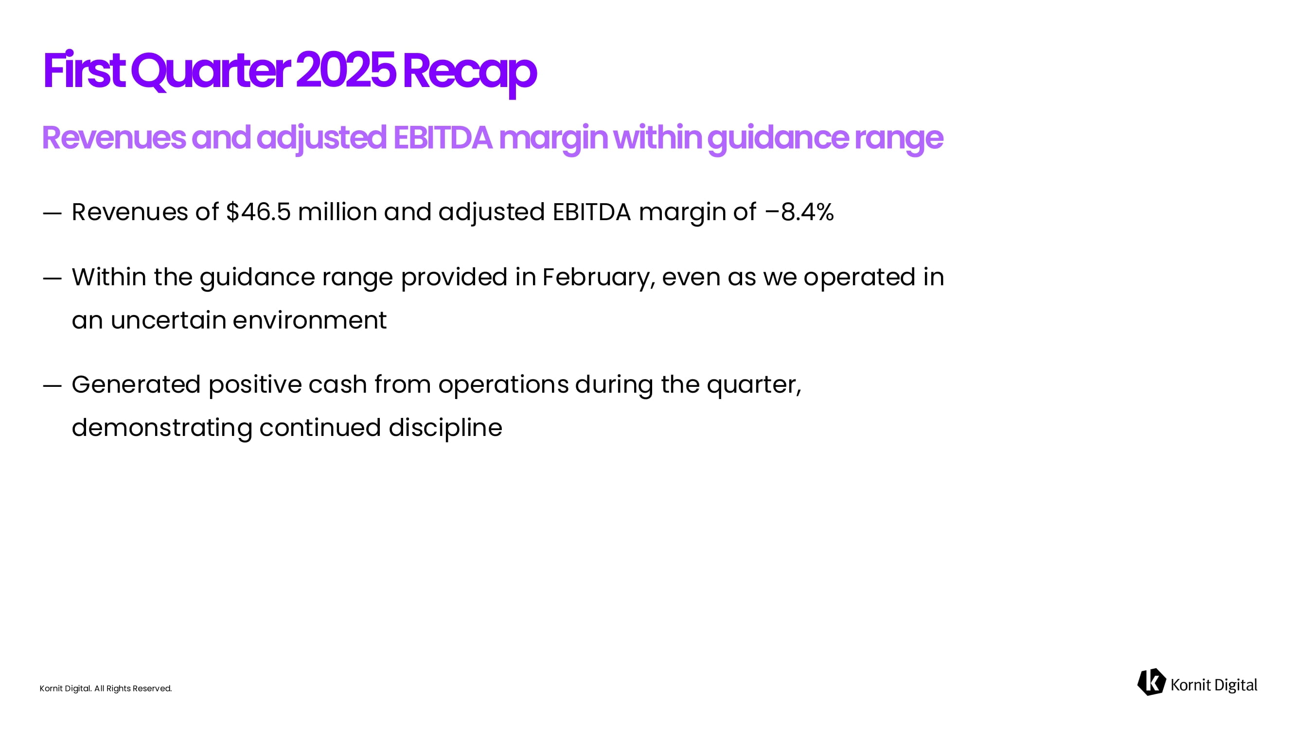All Rights Reserved. ― Revenues of $46.5 million and adjusted EBITDA margin of – 8.4% ― Within the guidance range provided in February, even as we operated in an uncertain environment ― Generated positive cash from operations during the quarter, demonstrating continued discipline First Quarter 2025 Recap Kornit Digital.