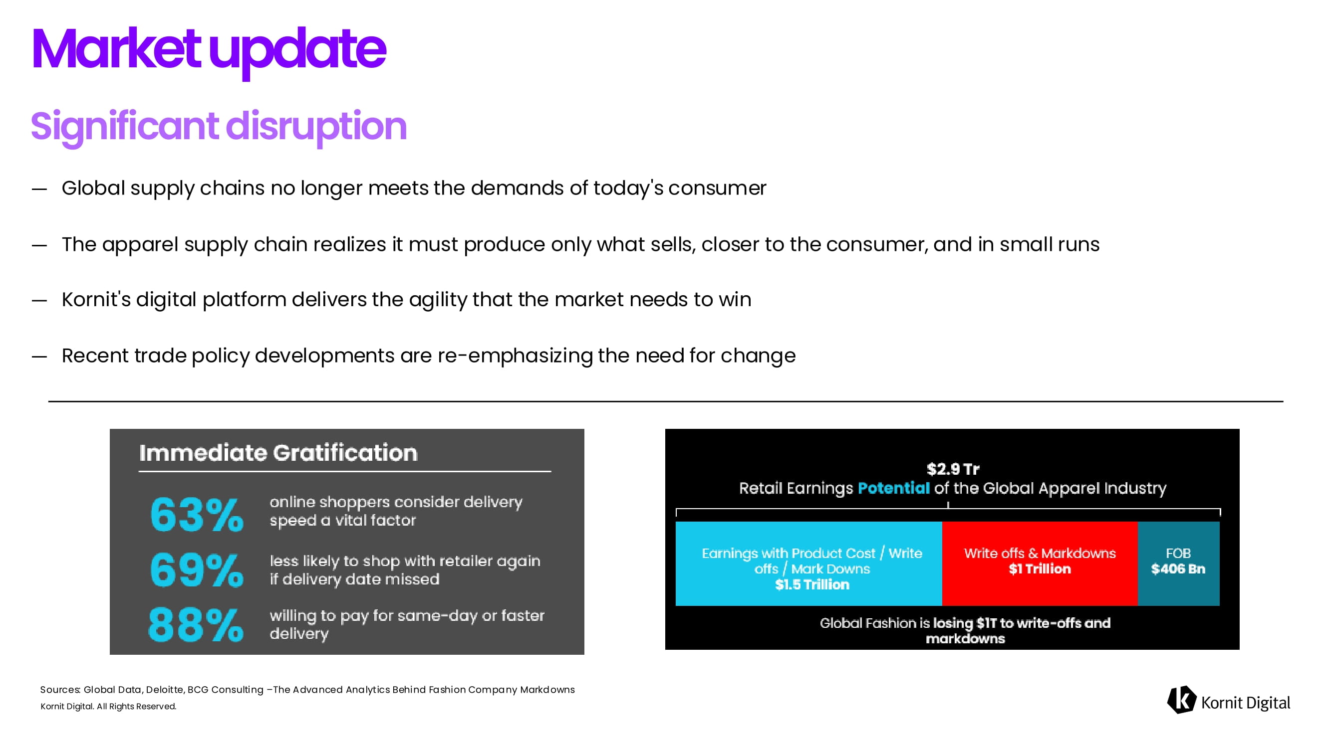 All Rights Reserved. ― Global supply chains no longer meets the demands of today's consumer ― The apparel supply chain realizes it must produce only what sells, closer to the consumer, and in small runs ― Kornit's digital platform delivers the agility that the market needs to win ― Recent trade policy developments are re - emphasizing the need for change Market update Sources: Global Data, Deloitte, BCG Consulting – The Advanced Analytics Behind Fashion Company Markdowns Kornit Digital.