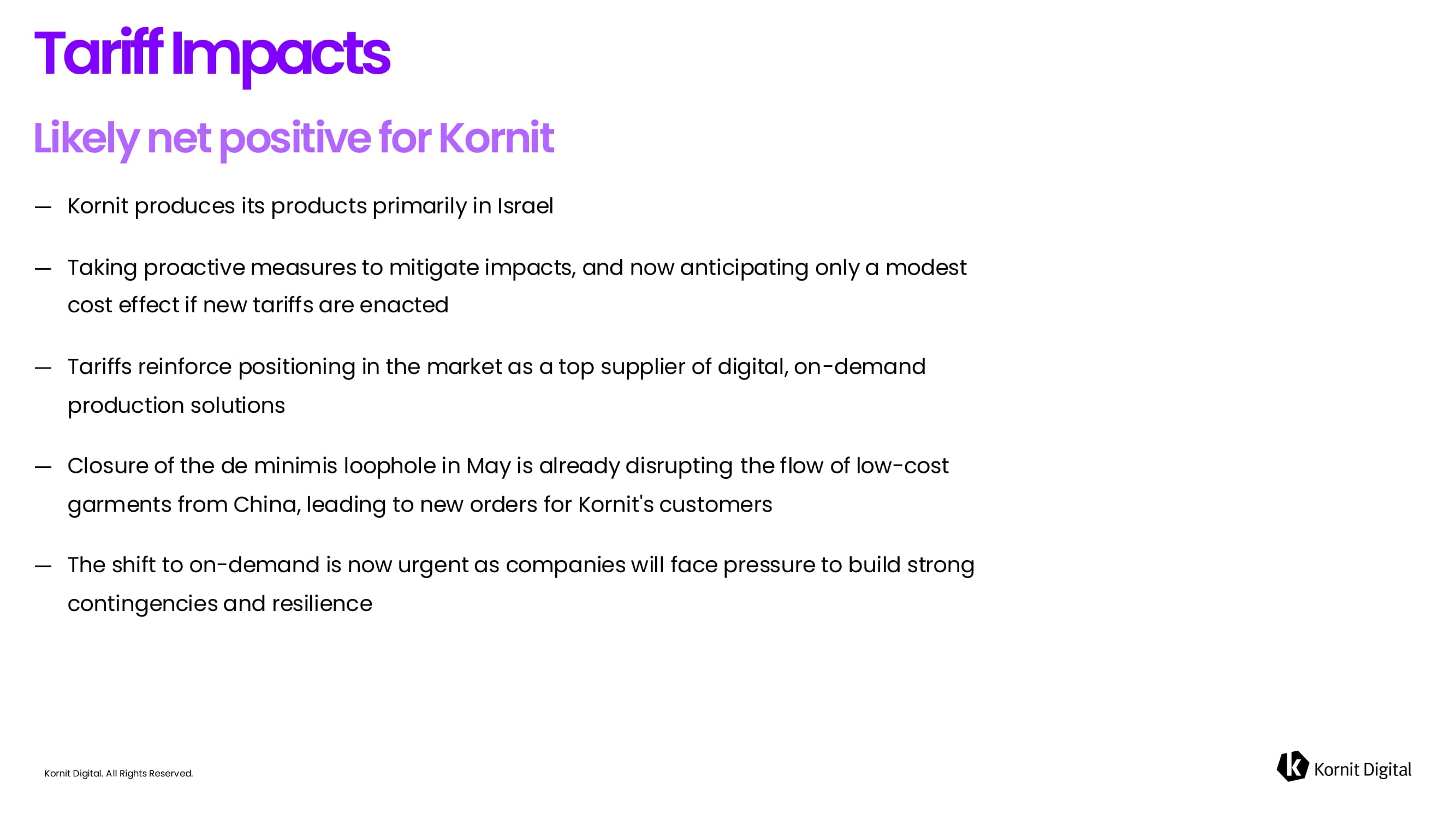 All Rights Reserved. ― Kornit produces its products primarily in Israel ― Taking proactive measures to mitigate impacts, and now anticipating only a modest cost effect if new tariffs are enacted ― Tariffs reinforce positioning in the market as a top supplier of digital, on - demand production solutions ― Closure of the de minimis loophole in May is already disrupting the flow of low - cost garments from China, leading to new orders for Kornit's customers ― The shift to on - demand is now urgent as companies will face pressure to build strong contingencies and resilience Tariff Impacts Kornit Digital.
