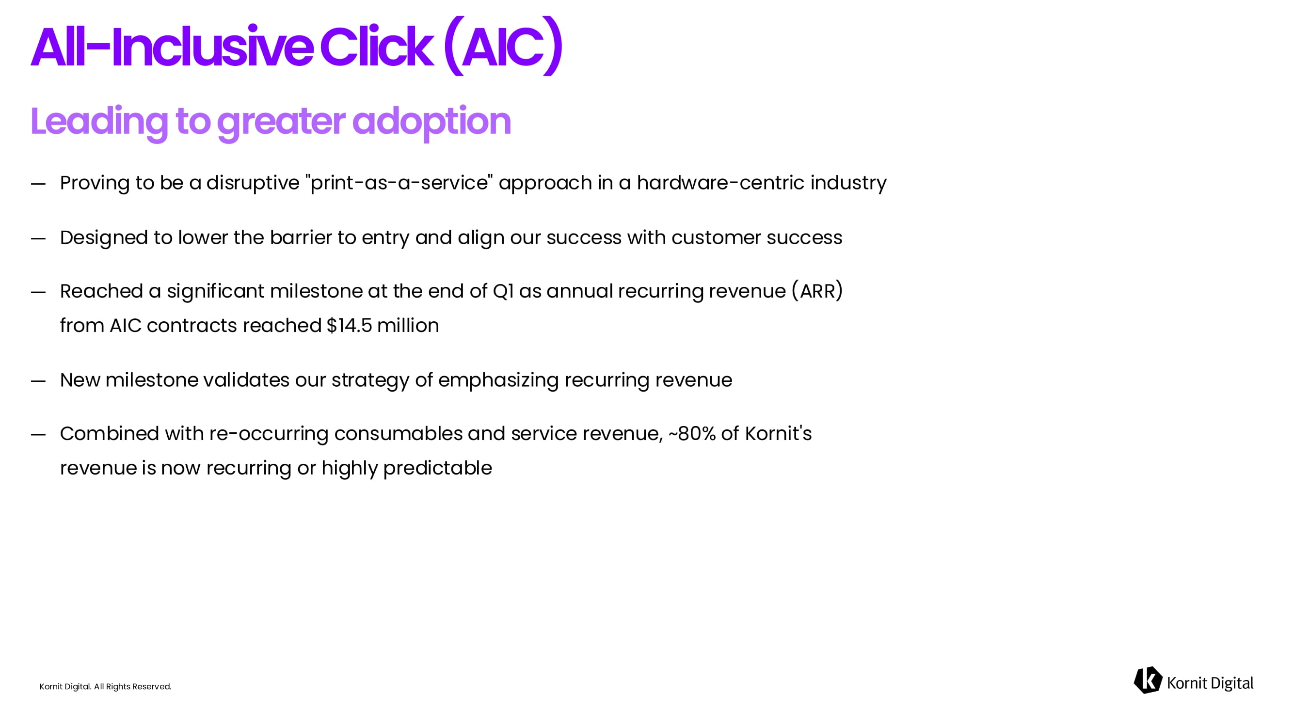 All Rights Reserved. ― Proving to be a disruptive "print - as - a - service" approach in a hardware - centric industry ― Designed to lower the barrier to entry and align our success with customer success ― Reached a significant milestone at the end of Q1 as annual recurring revenue (ARR) from AIC contracts reached $14.5 million ― New milestone validates our strategy of emphasizing recurring revenue ― Combined with re - occurring consumables and service revenue, ~80% of Kornit's revenue is now recurring or highly predictable All - Inclusive Click (AIC)