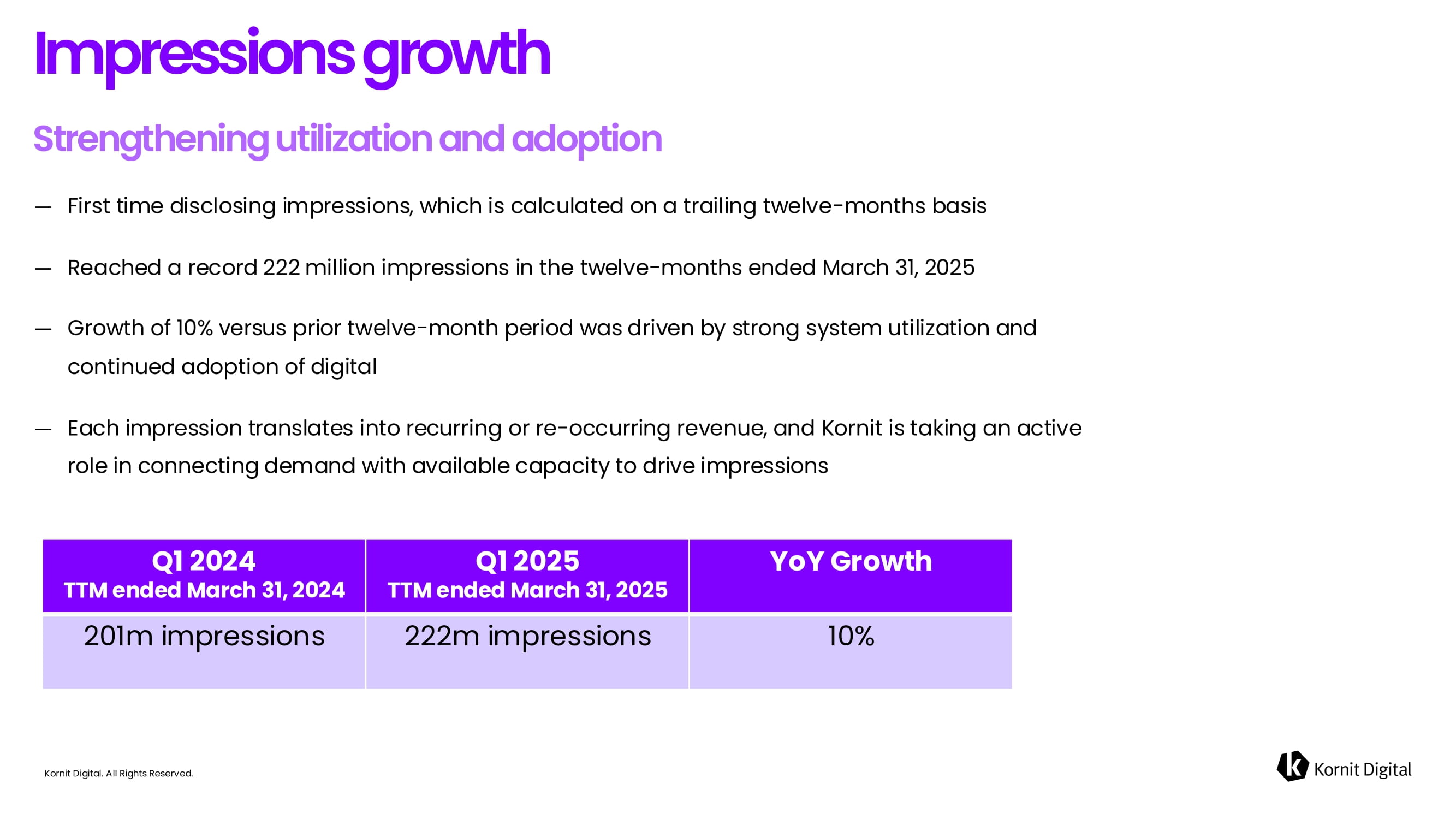 Kornit Digital. All Rights Reserved. ― First time disclosing impressions, which is calculated on a trailing twelve - months basis ― Reached a record 222 million impressions in the twelve - months ended March 31, 2025 ― Growth of 10% versus prior twelve - month period was driven by strong system utilization and continued adoption of digital ― Each impression translates into recurring or re - occurring revenue, and Kornit is taking an active role in connecting demand with available capacity to drive impressions Impressions growth YoY Growth Q1 2025 TTM ended March 31, 2025 Q1 2024 TTM ended March 31, 2024 10% 222m impressions 201m impressions Kornit Digital.