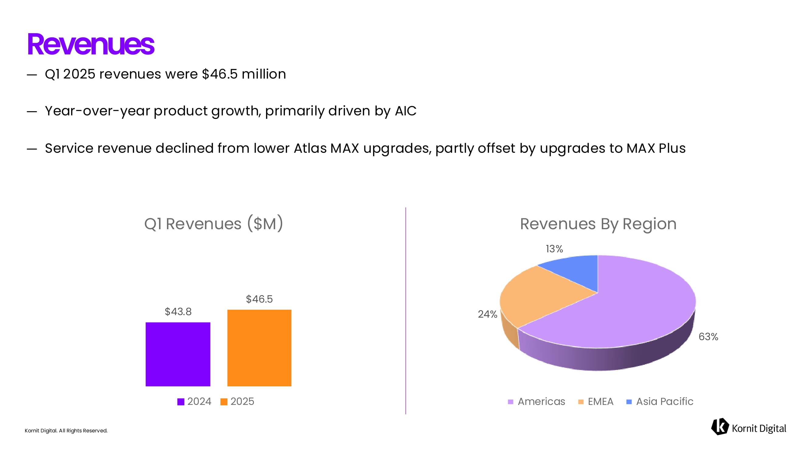 All Rights Reserved. ― Q 1 2025 revenues were $ 46.5 million ― Year - over - year product growth, primarily driven by AIC ― Service revenue declined from lower Atlas MAX upgrades, partly offset by upgrades to MAX Plus Revenues $43.8 $46.5 Q1 Revenues ($M) 2024 2025 63% 24% 13% Revenues By Region Americas EMEA Asia Pacific Kornit Digital.