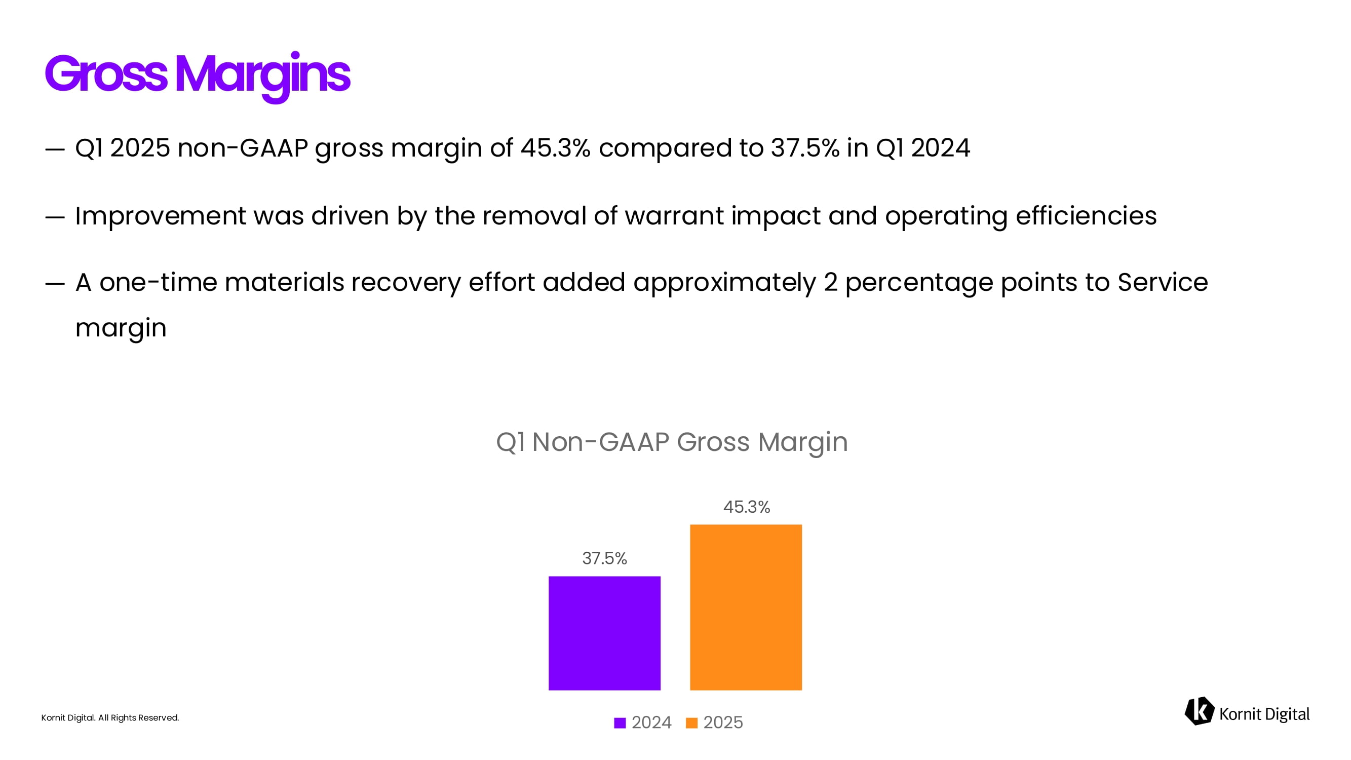 All Rights Reserved. ― Q1 2025 non - GAAP gross margin of 45.3% compared to 37.5% in Q1 2024 ― Improvement was driven by the removal of warrant impact and operating efficiencies ― A one - time materials recovery effort added approximately 2 percentage points to Service margin Gross Margins 37.5% 45.3% Q1 Non - GAAP Gross Margin 2024 2025 Kornit Digital.
