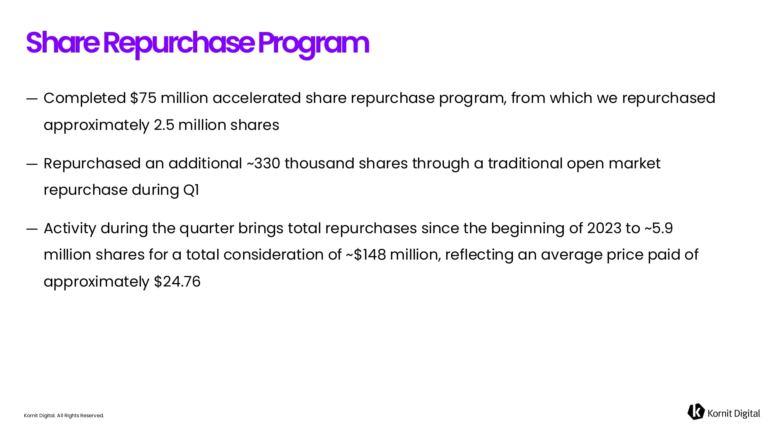 All Rights Reserved. ― Completed $75 million accelerated share repurchase program, from which we repurchased approximately 2.5 million shares ― Repurchased an additional ~330 thousand shares through a traditional open market repurchase during Q1 ― Activity during the quarter brings total repurchases since the beginning of 2023 to ~5.9 million shares for a total consideration of ~$148 million, reflecting an average price paid of approximately $24.76 Share Repurchase Program Kornit Digital.