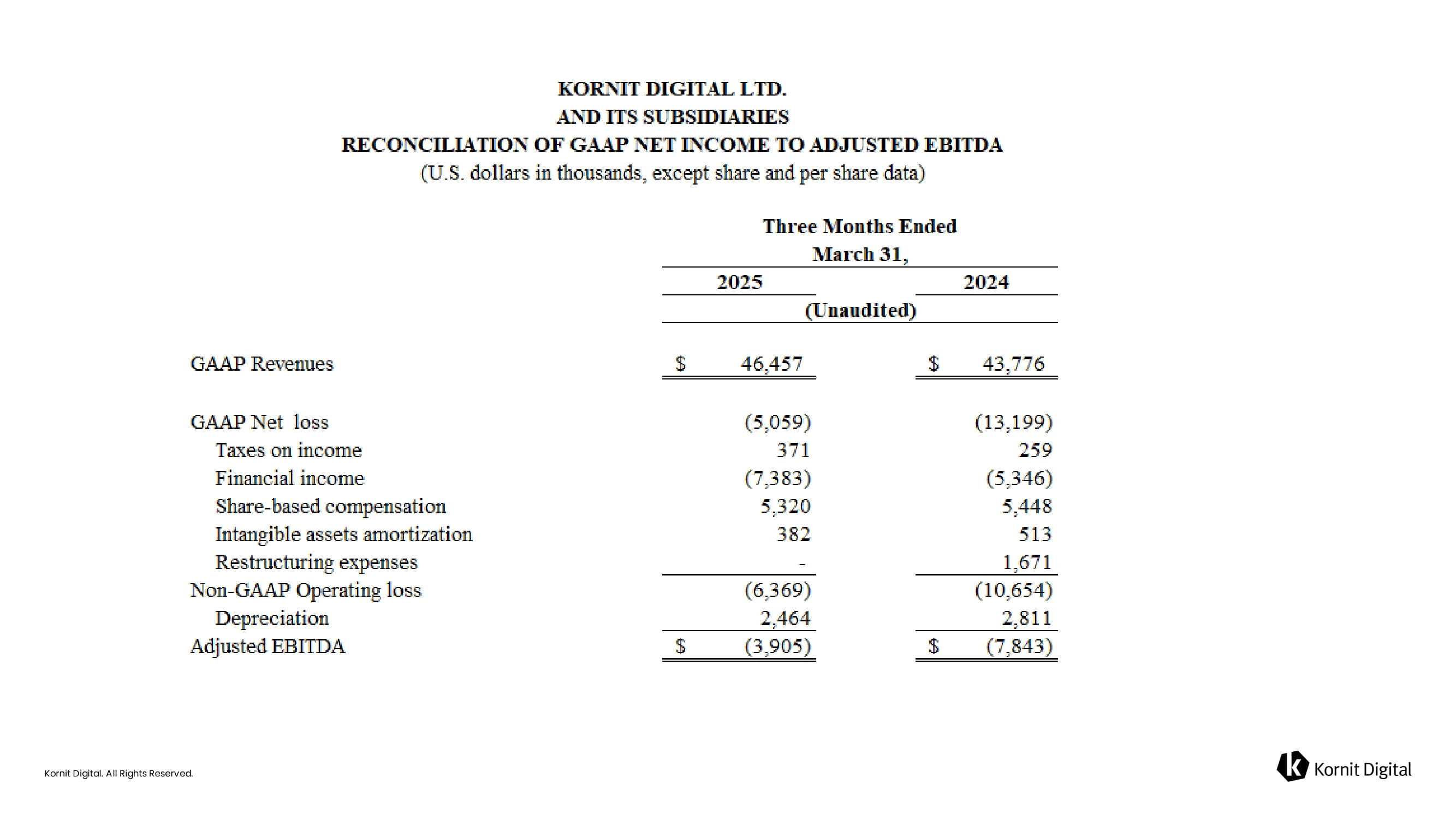 | ● | Adjusted EBITDA loss for the first quarter of 2025 was $3.9 million compared with adjusted EBITDA loss of $7.8 million for the first quarter of 2024. Adjusted EBITDA margin for the first quarter of 2025 was negative 8.4% compared with negative 17.9% for the first quarter of 2024. |
