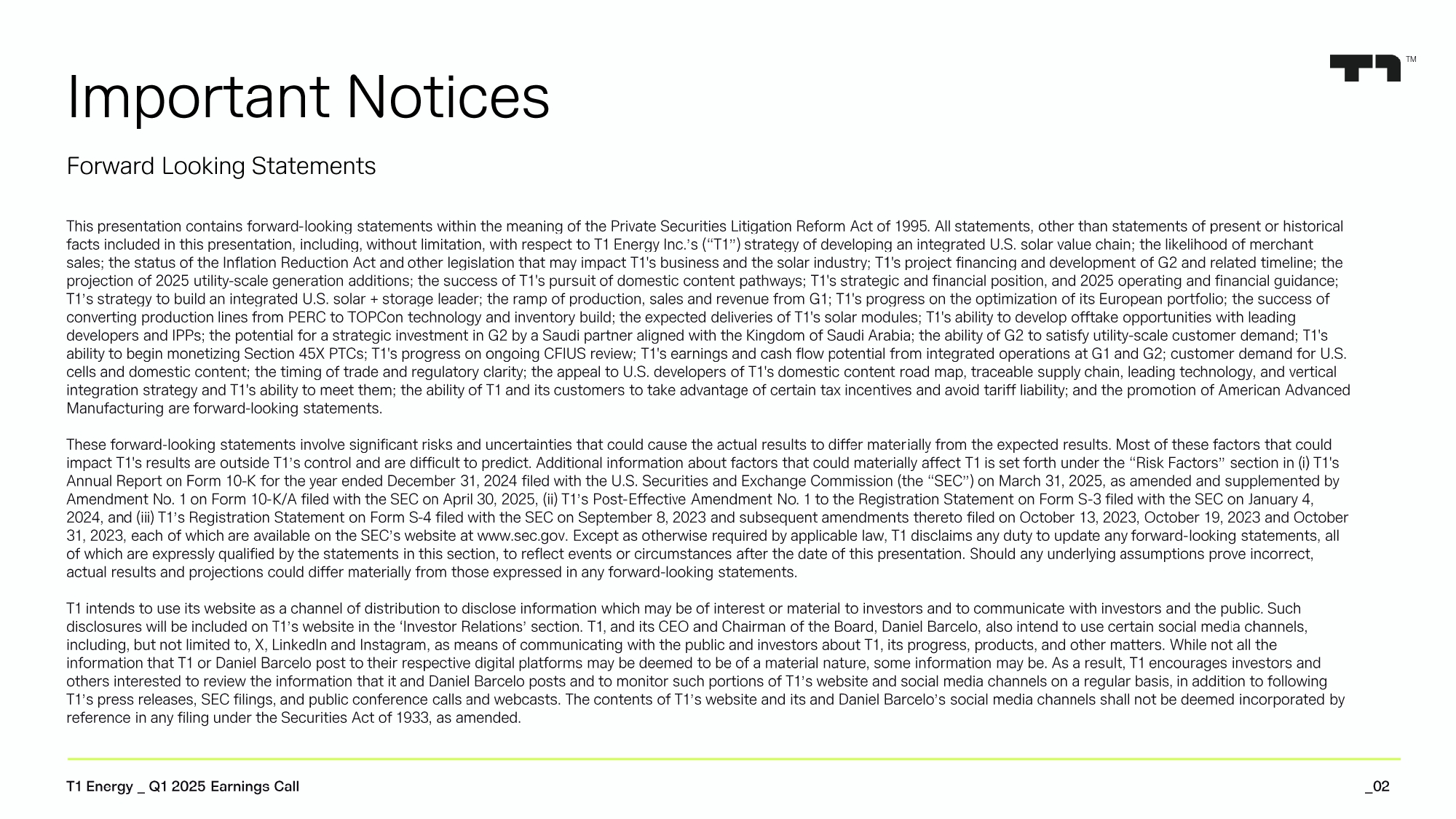 本日2025年5月15日午前8時(米国東部夏時間)より、第1四半期の財務および営業成績に関するプレゼンテーションを行います。決算およびプレゼンテーション資料は、https://ir.t1energy.com/ からダウンロードできます。