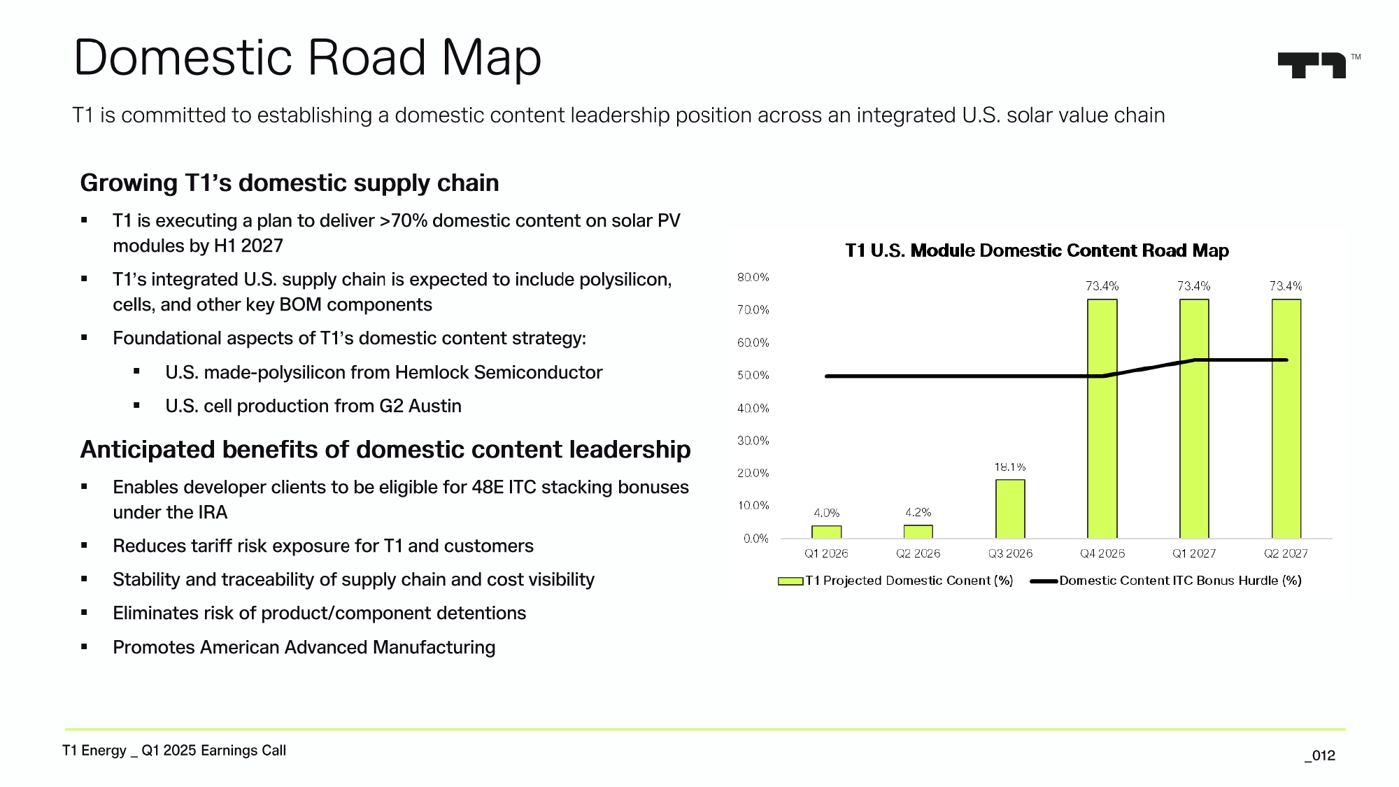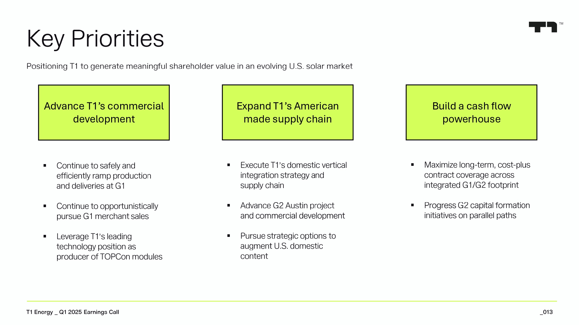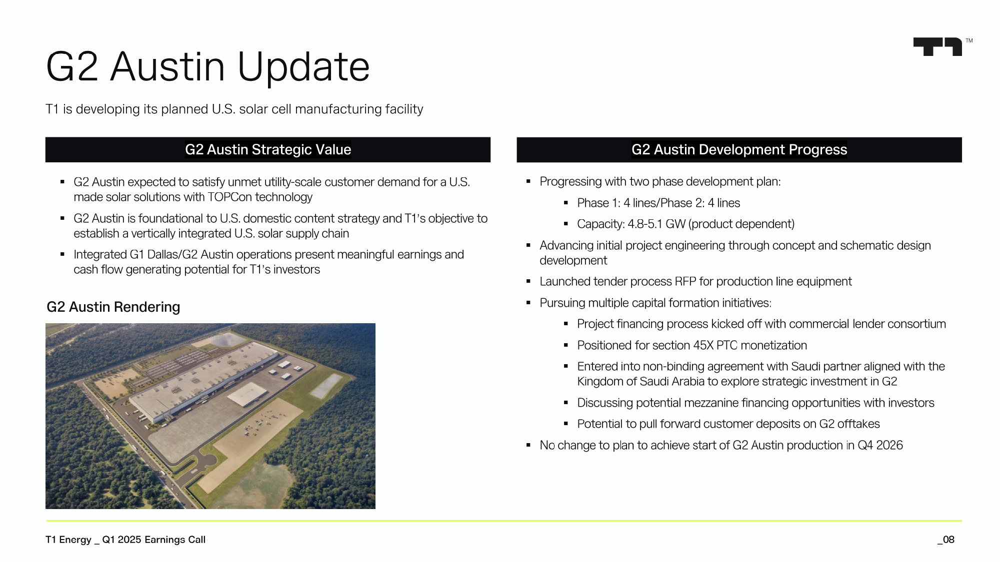 | § | G1ダラスの収益と生産量は引き続き増加4月にG1 DallasがT1の運営チームに全面的に引き渡された後、当社の米国モジュール製造施設は販売と生産量の増加を続けている。2025年第1四半期中、T1はG1ダラスから6,460万ドルの収入を得たが、これは専らトリナ社との引取契約に基づく納入に関連したものである。2025年第2四半期には、RWEとの引取契約に基づく納入が開始された。5月11日現在、T1はG1から690MWのモジュールを生産している。 |